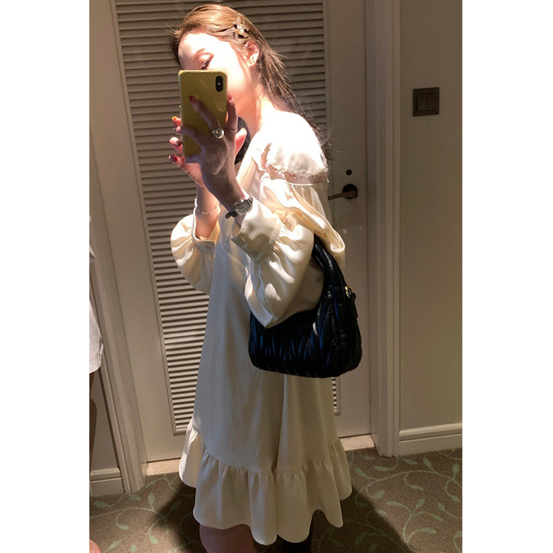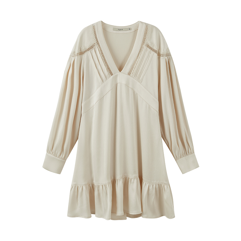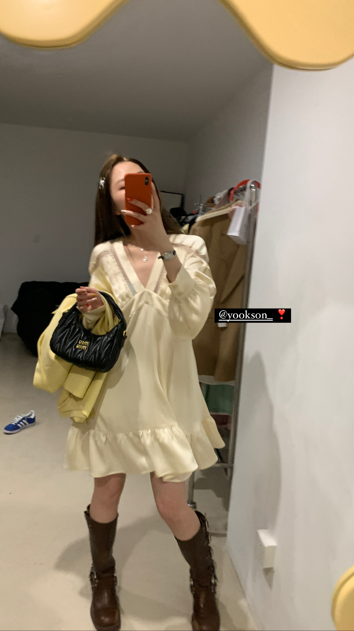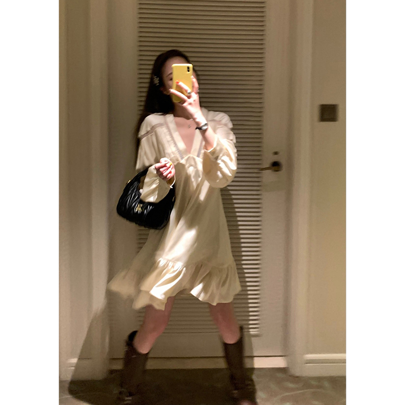 HEYGIRL黑哥 海島清茶 泡泡袖V領氣質洋裝女春季荷葉邊鏤空裙子