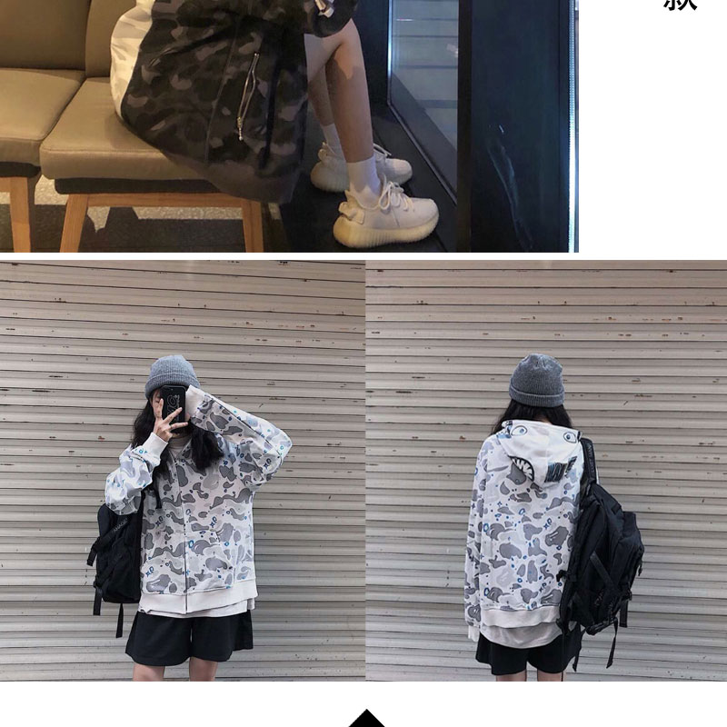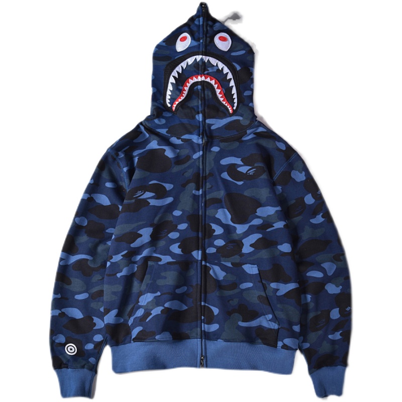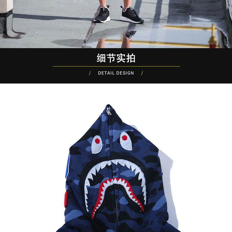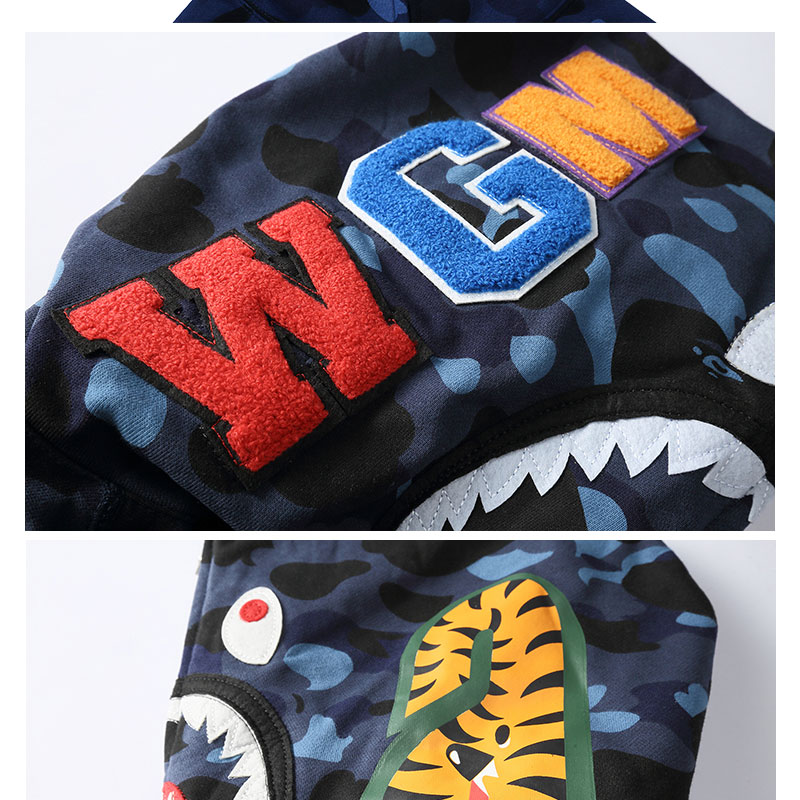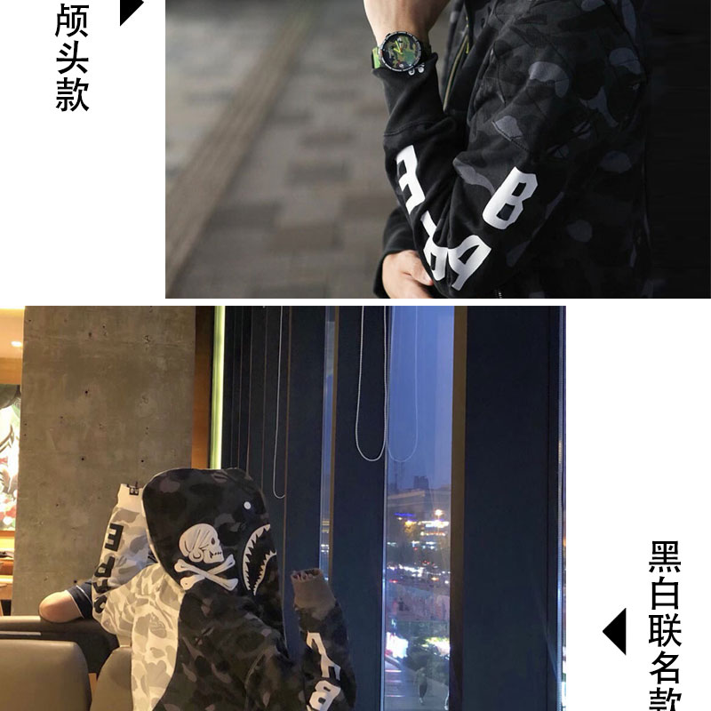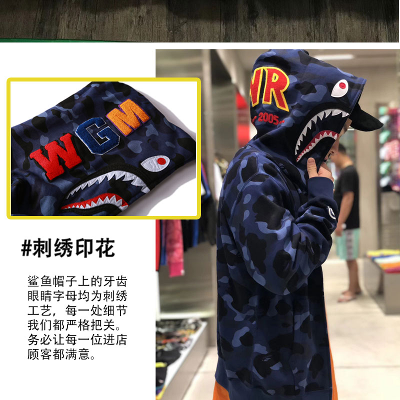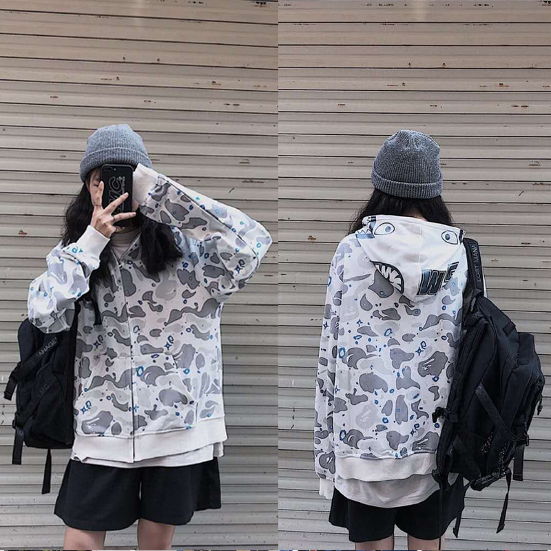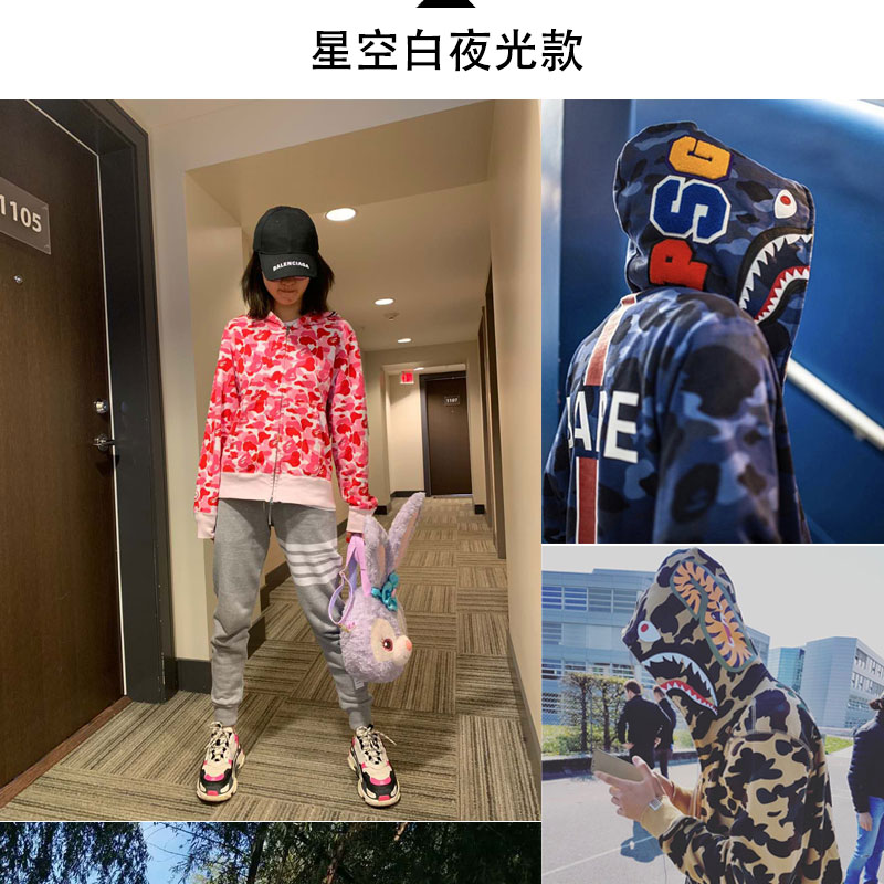 日系潮牌鯊魚外套迷彩夜光刺繡開衫連帽運動衫寬鬆拼接帽衫男女學生