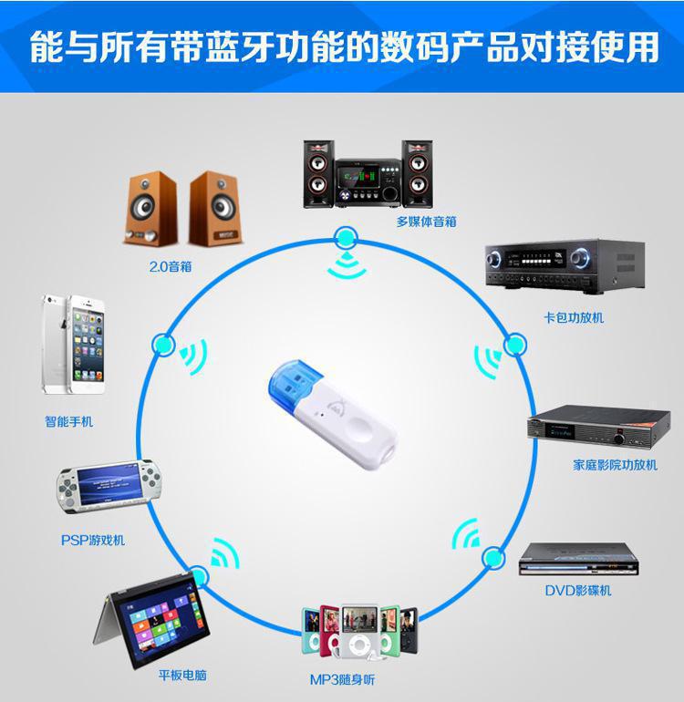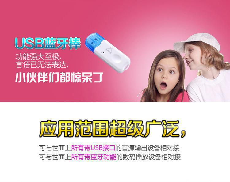 本USB蓝牙音乐接收器不用延长线,不用扯电线,更不需要3.5mm耳机线来转接输出。你可以通过无线蓝牙将音乐传输至带U盘读取的家庭音响系统,然后就可以自在享受了,当然前提是你的音箱必须支持U盘播放功能蓝牙音乐接收器使用蓝牙v2.1+EDR为您提供可靠,高品质的声音。