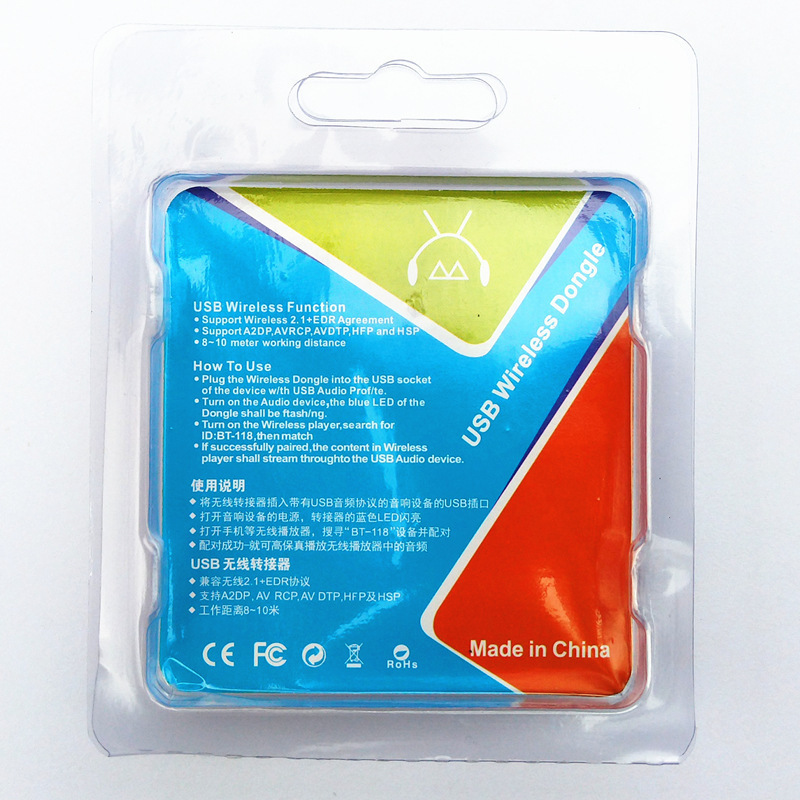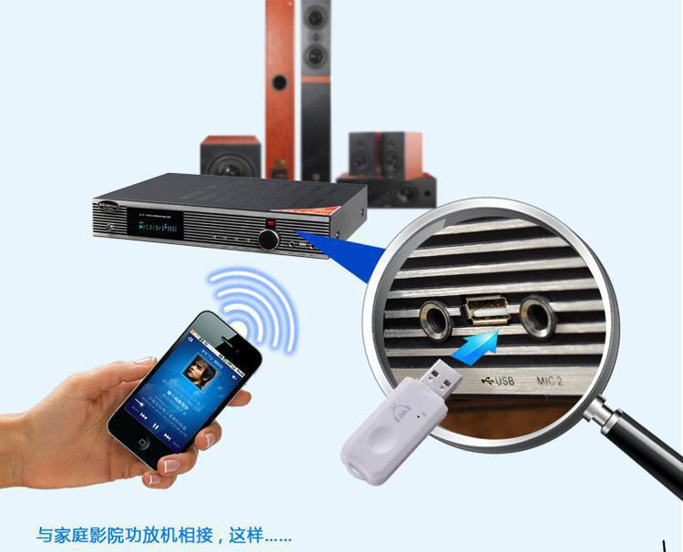 1.The bluetooth music receiver is small and elegant, directly plugged into the USB port of the home stereo system with U disk playback, and does not require any external connections, such as power cords and audio cables And users can sit at a distance of 10 meters and easily wirelessly transmit, play and control all audio files in their iPhone, iTouch or Bluetooth devices via Bluetooth;
