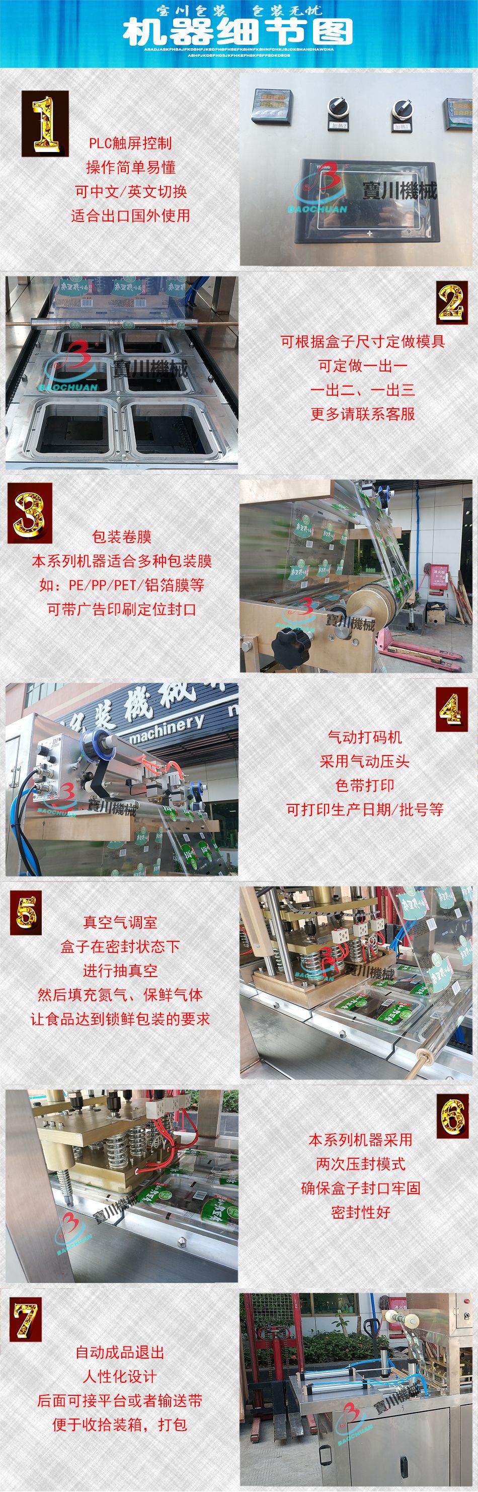 封口系统:采用恒温(智能温控)热压两次封口,封口头为一级黄铜,导热性好,坚固结实。