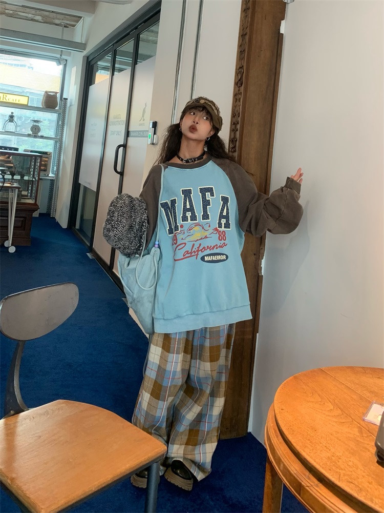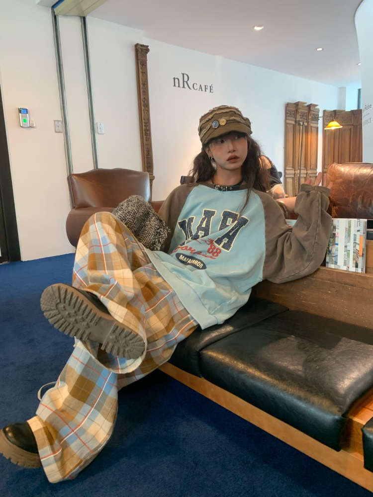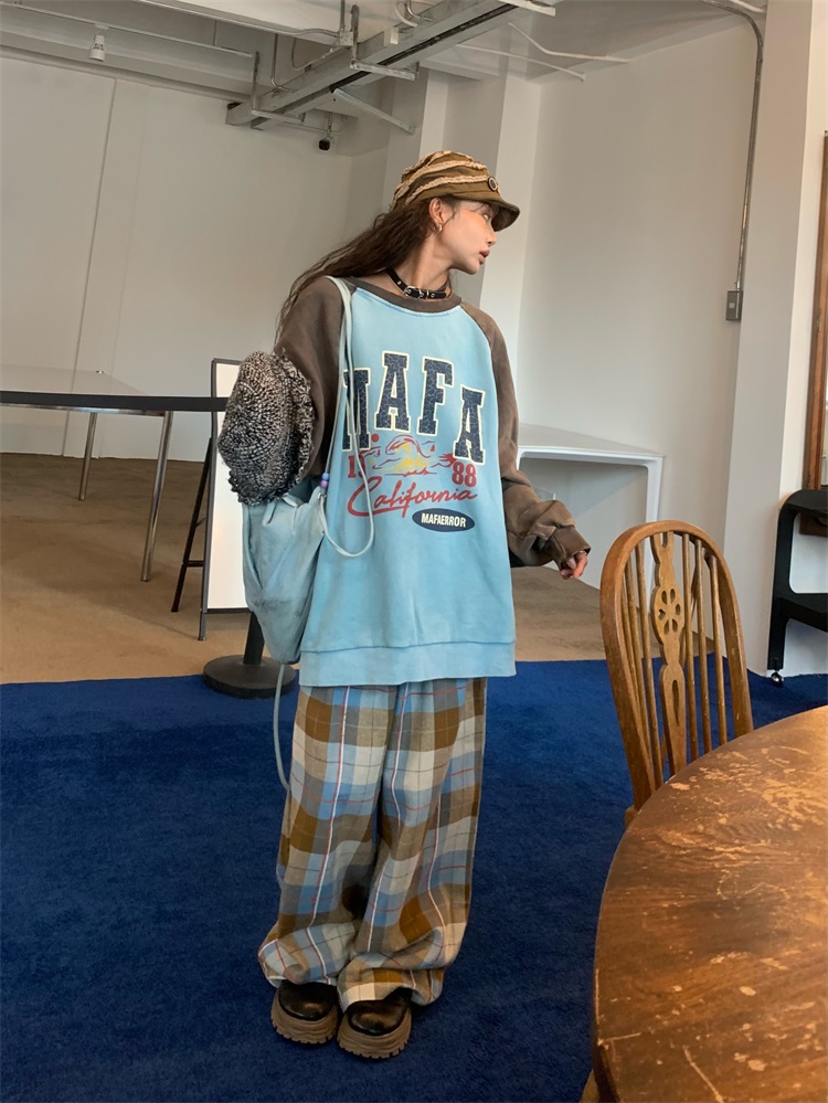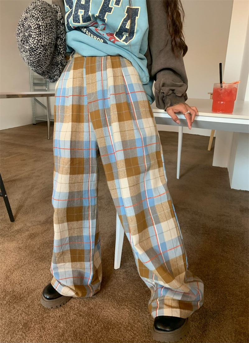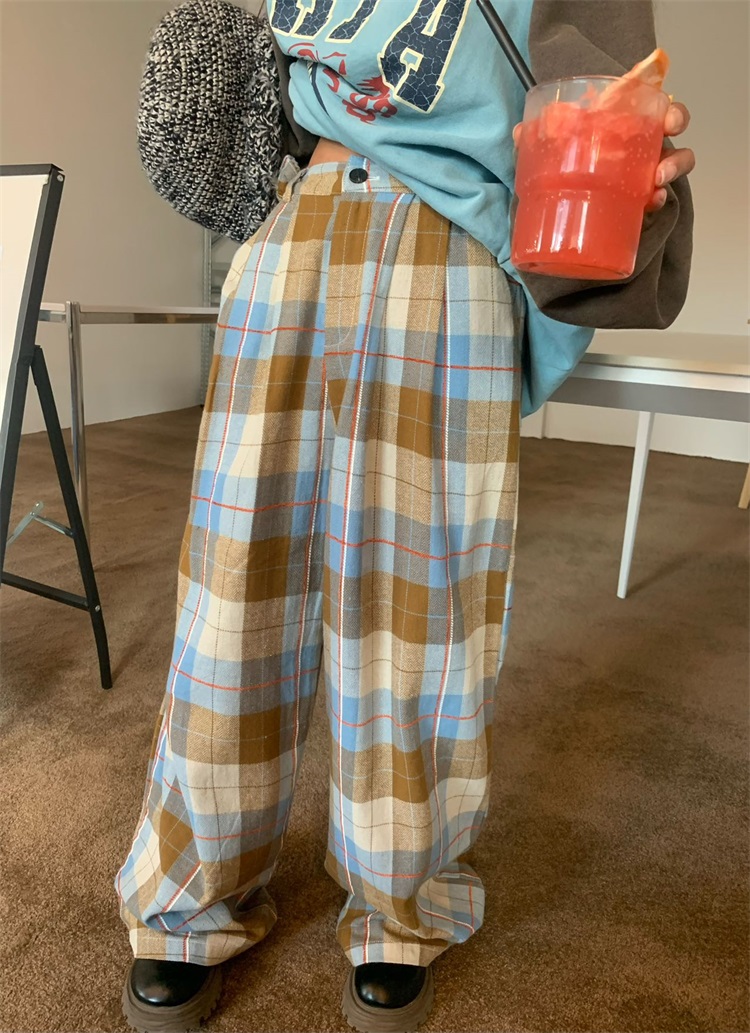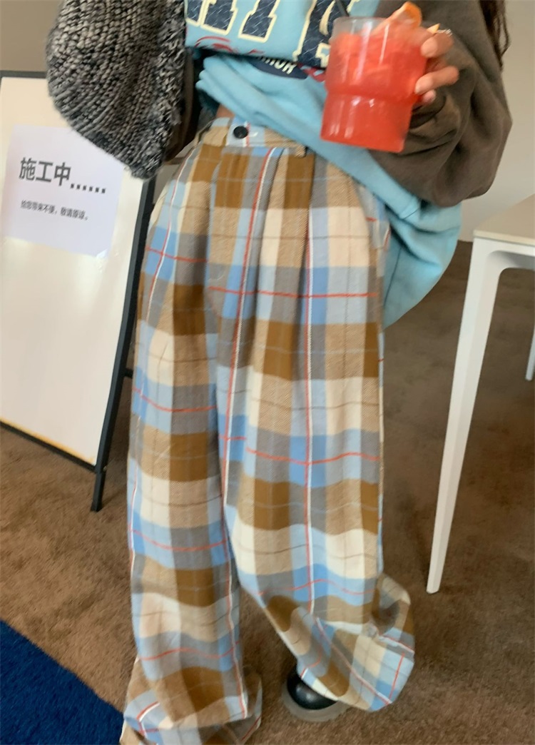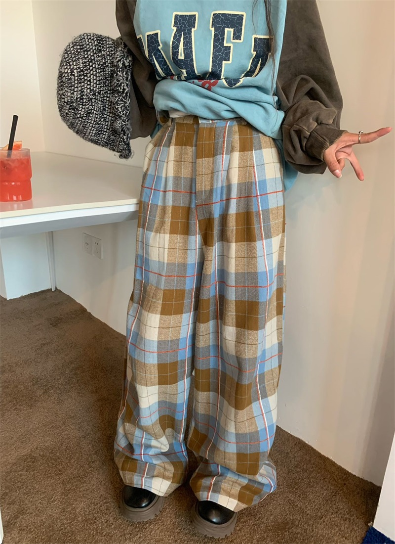 0918很秀自制復古英倫格紋休閒寬褲女2023秋冬新款小個子拖地褲