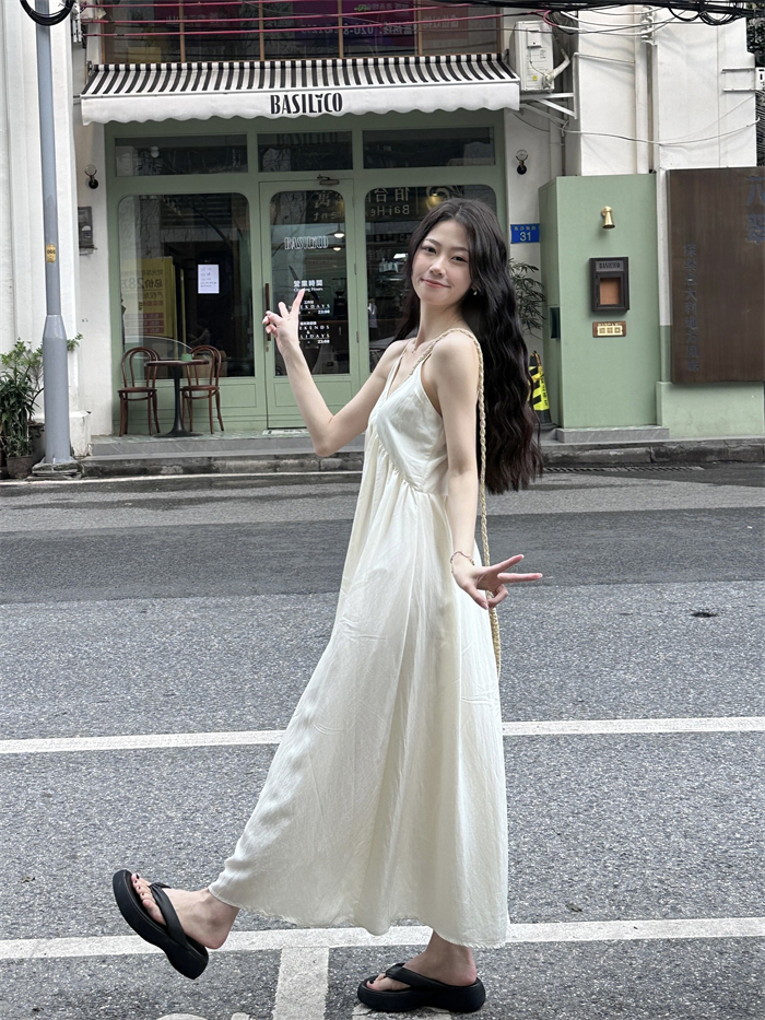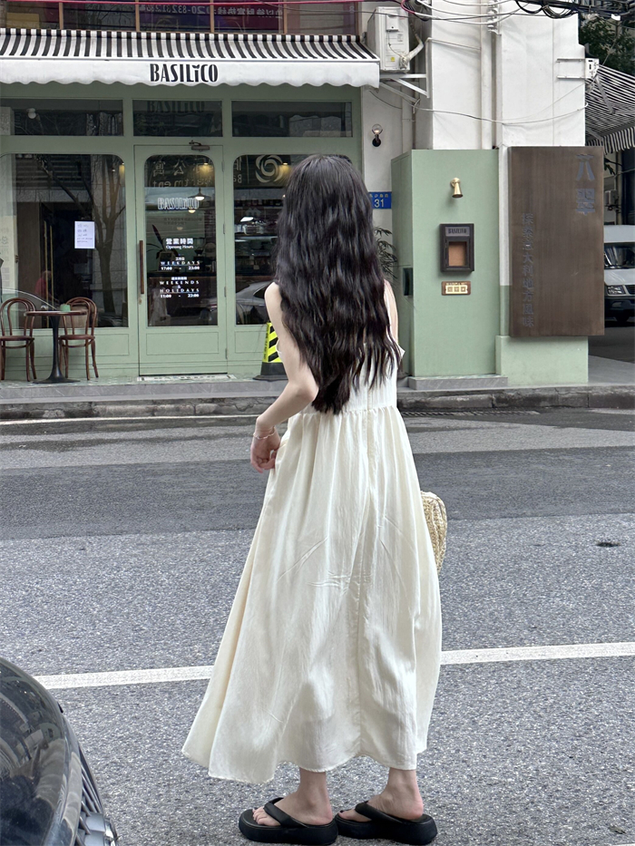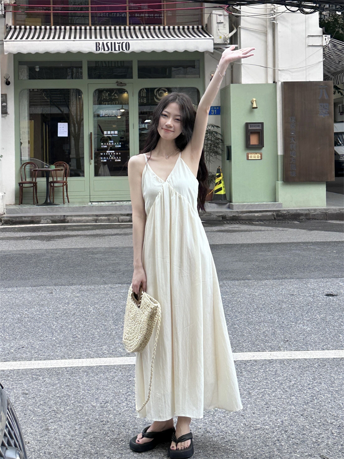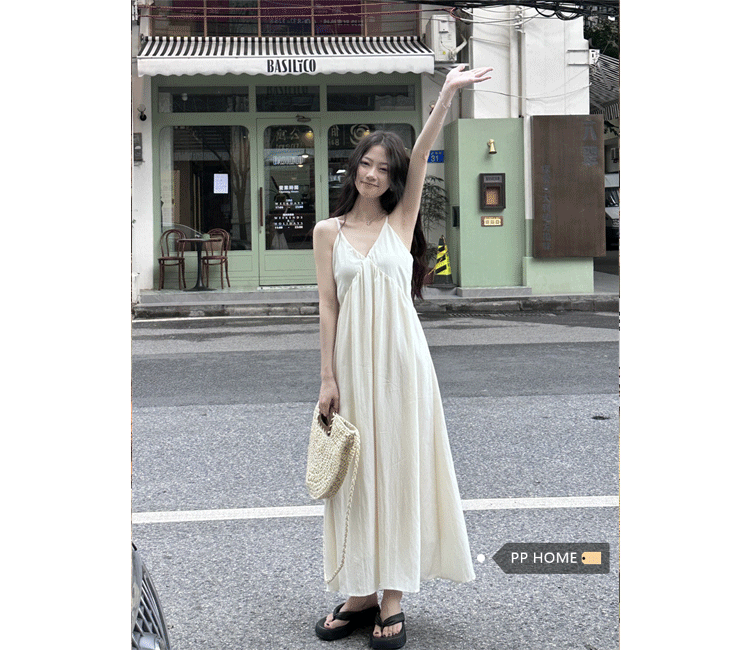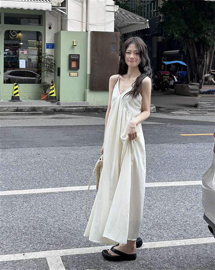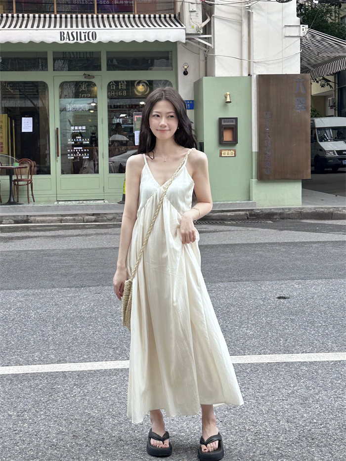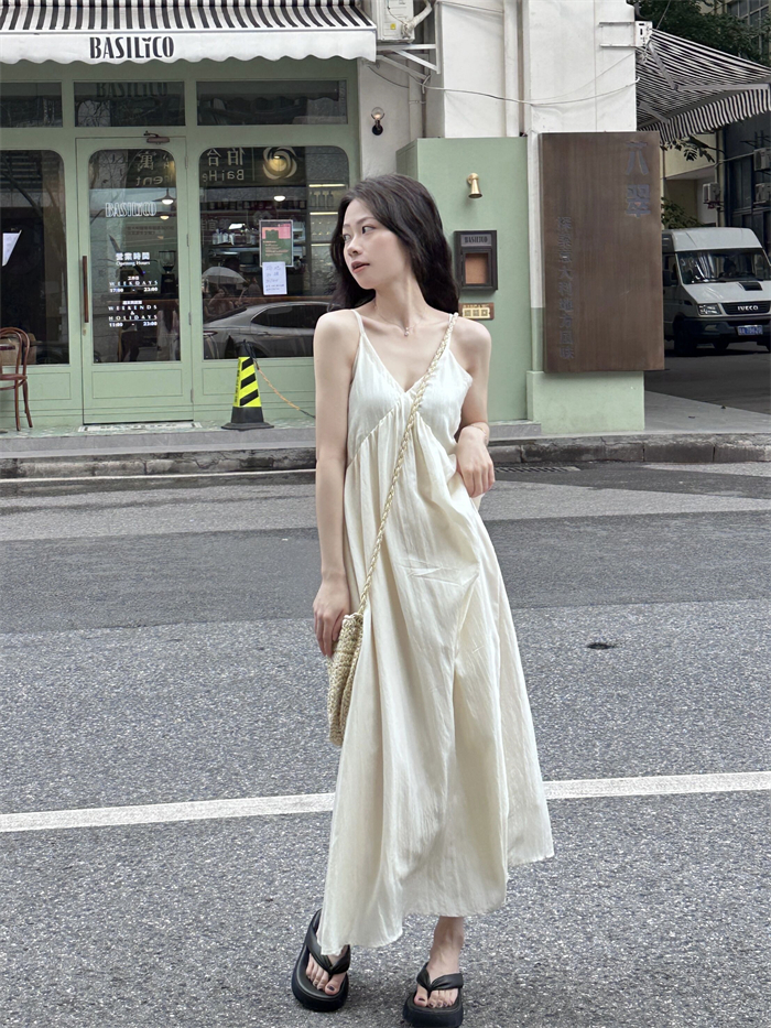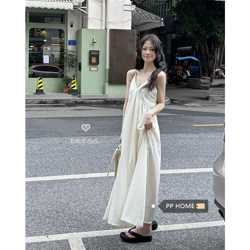 PPHOME法式溫柔~法式溫柔風大V領吊帶長裙仙氣顯瘦海邊度假洋裝