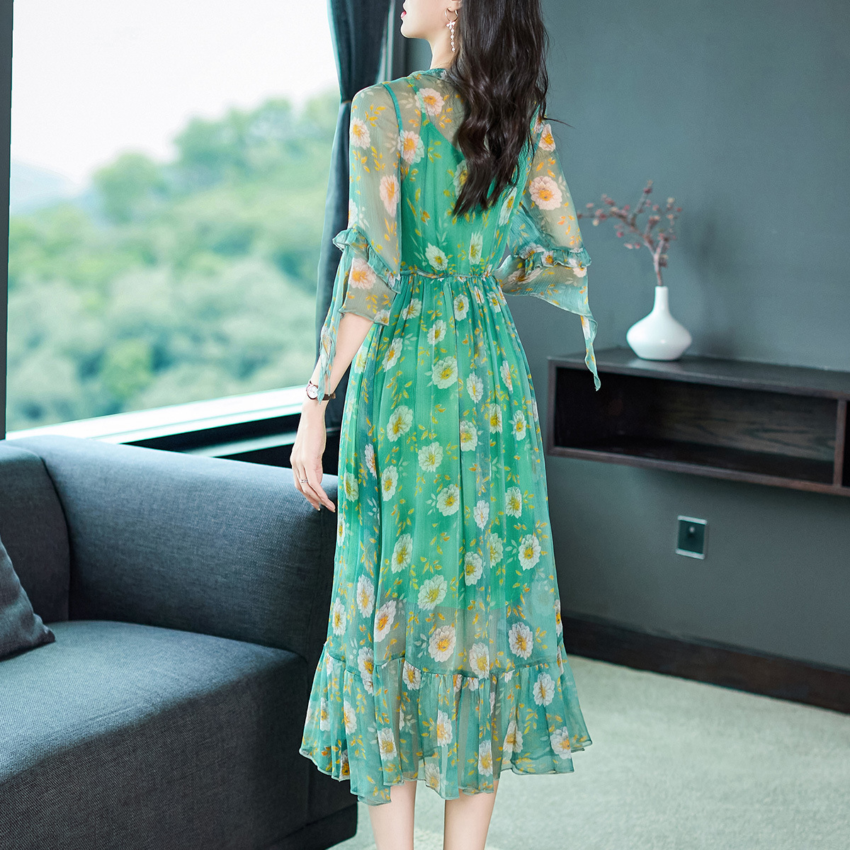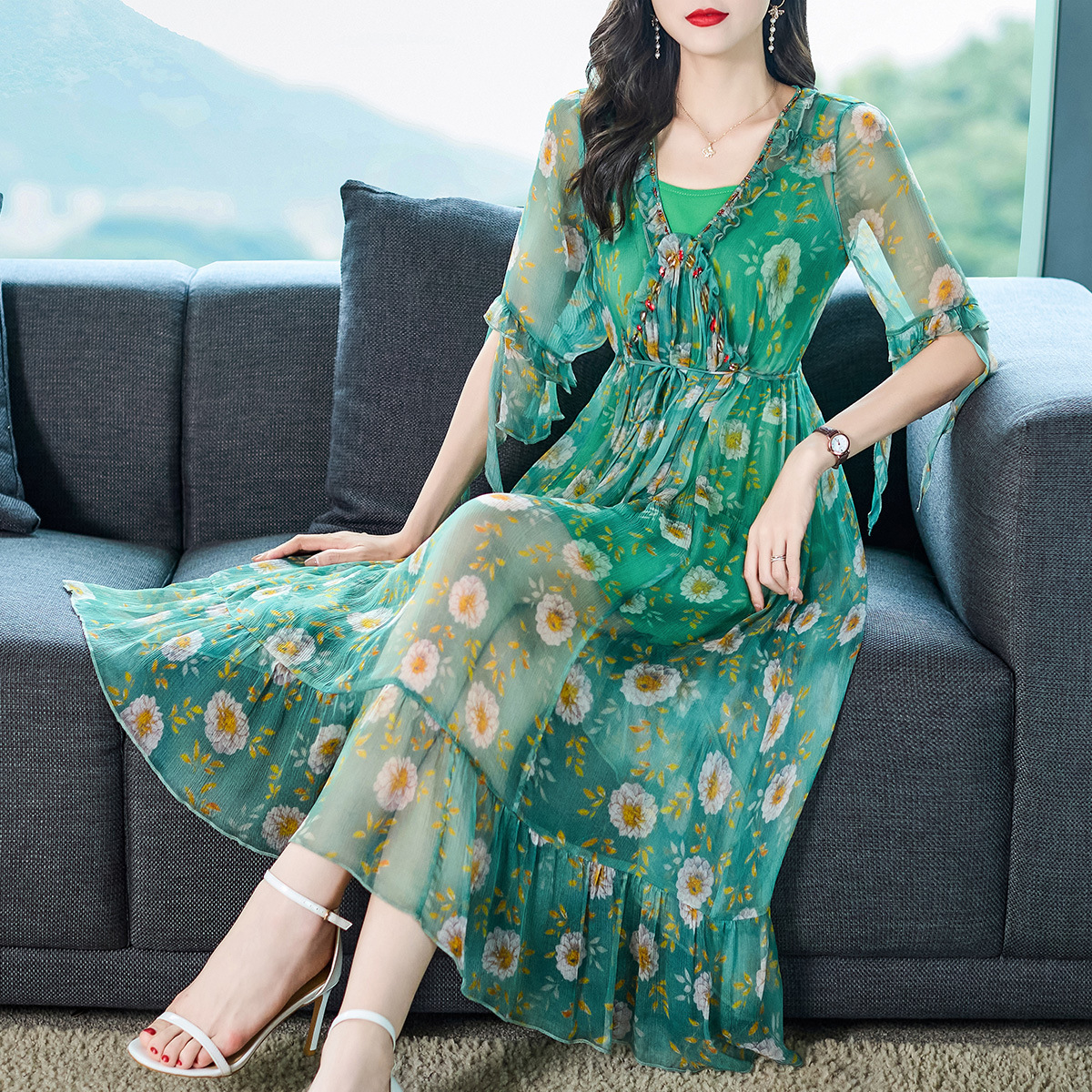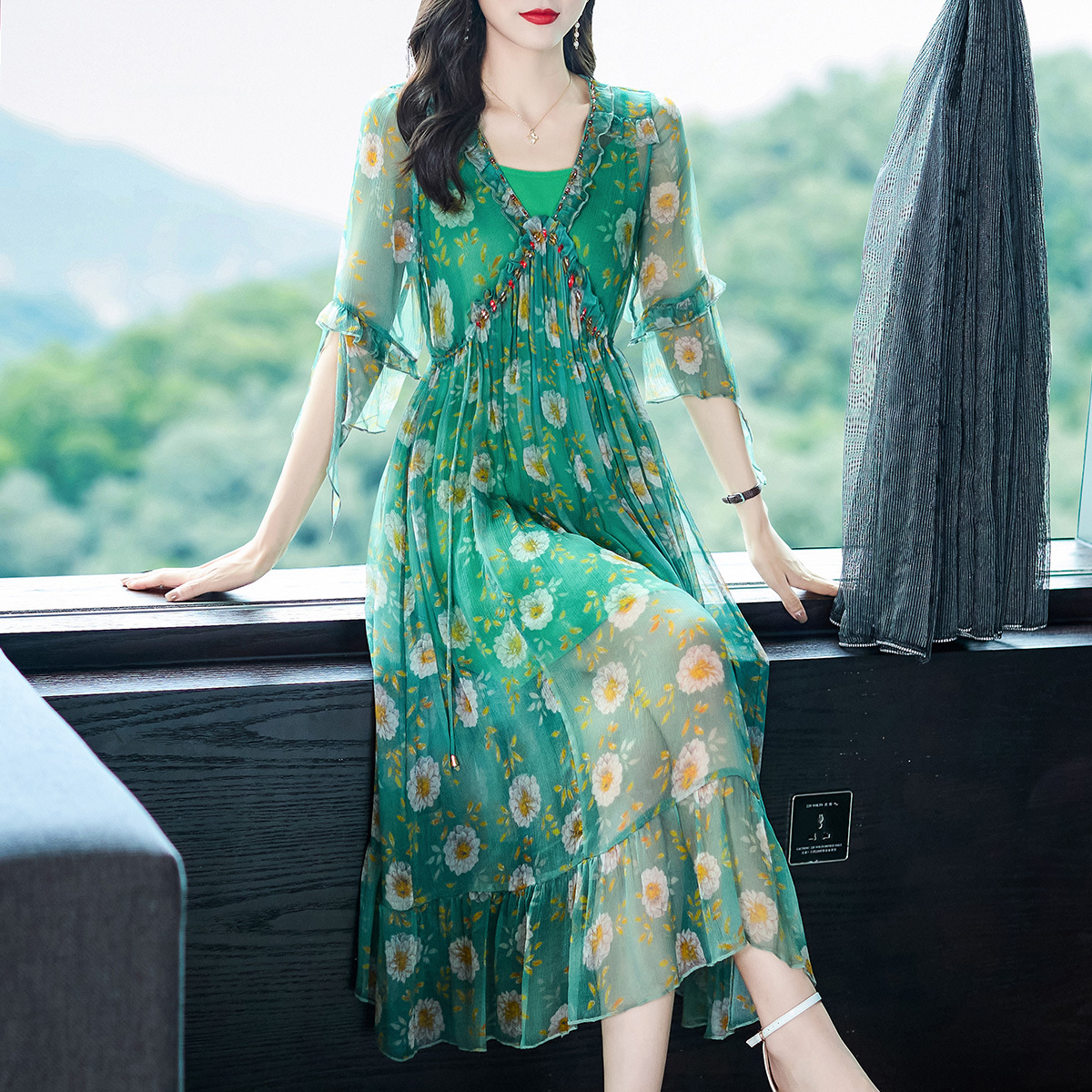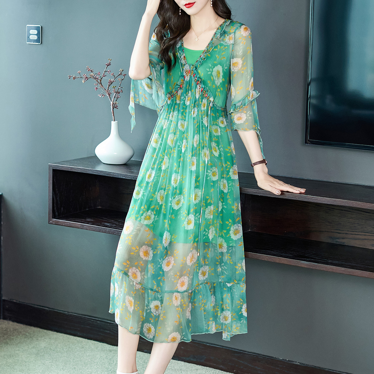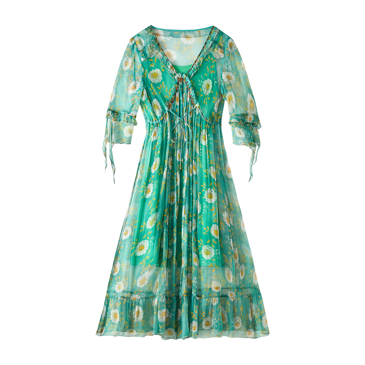 69380订钻绿色碎花真丝连衣裙气质优雅桑蚕丝系带两件套仙女裙