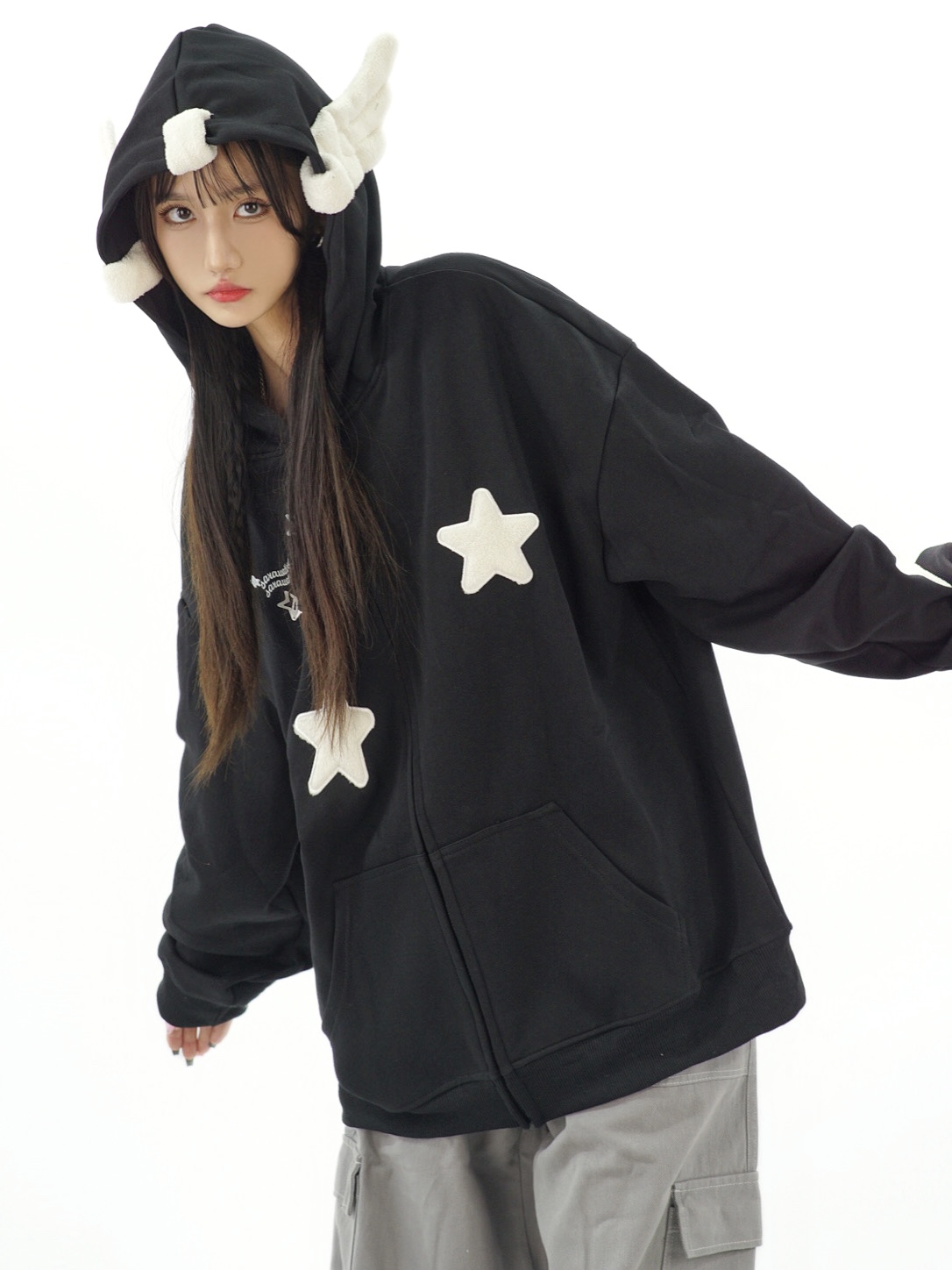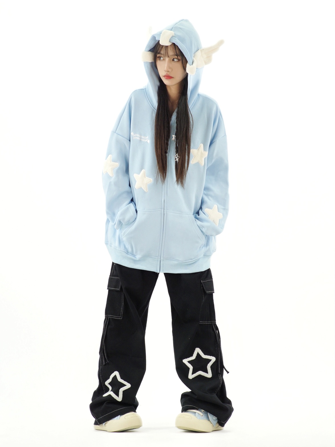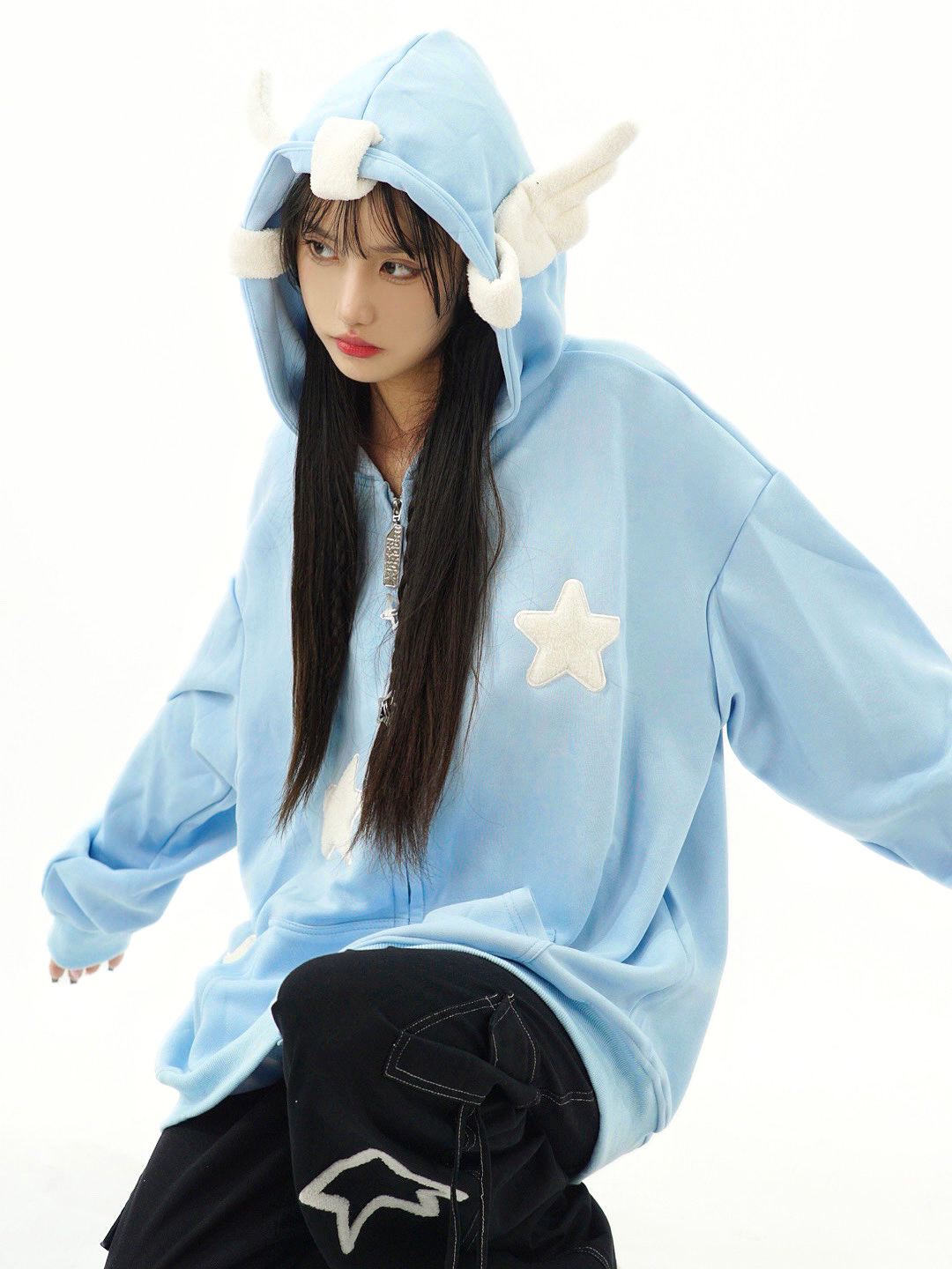 Amoeba原創甜酷可愛星星翅膀連帽運動衫拉鍊開衫秋季情侶設計感外套