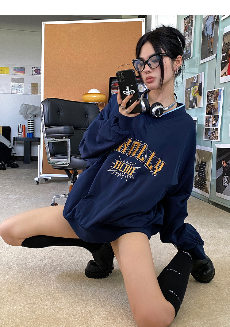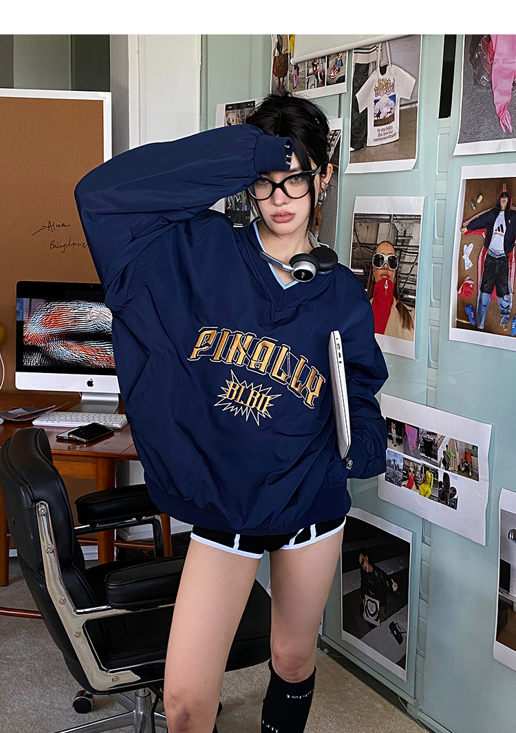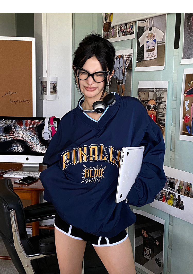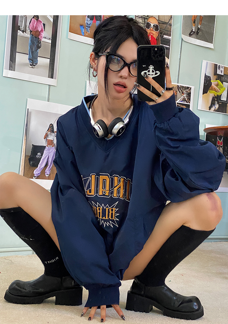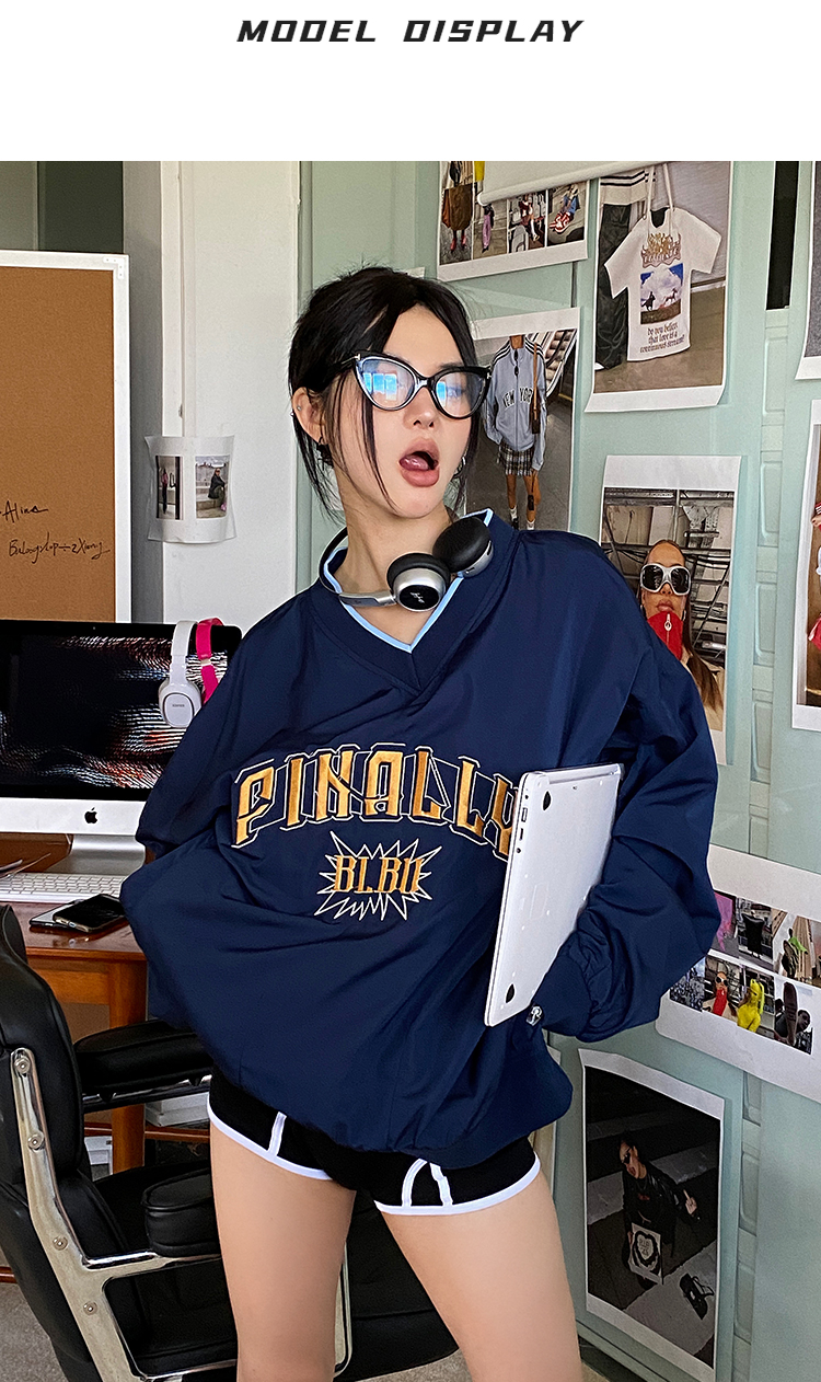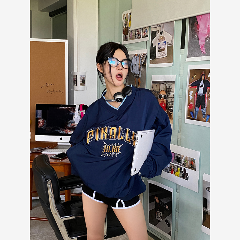 何以沫美式復古棒球服衛衣女2023秋季潮牌刺繡寬鬆V領套頭衫ins潮