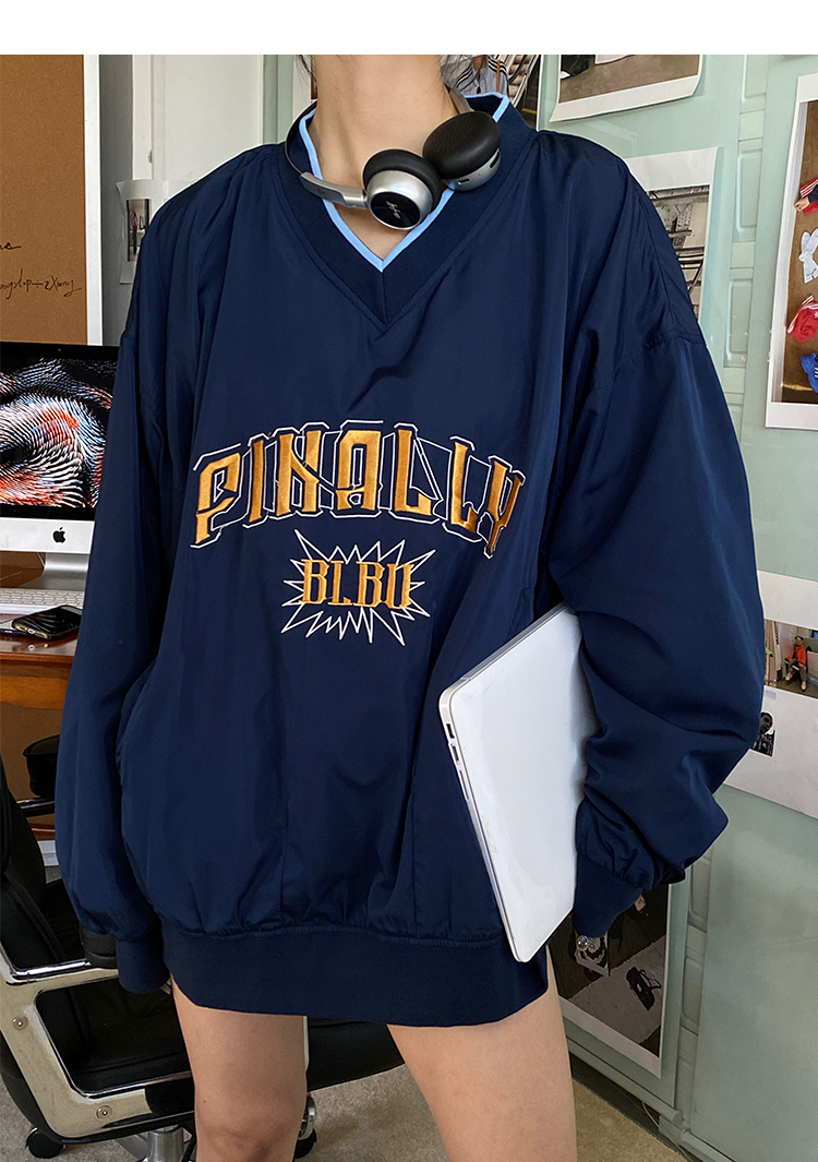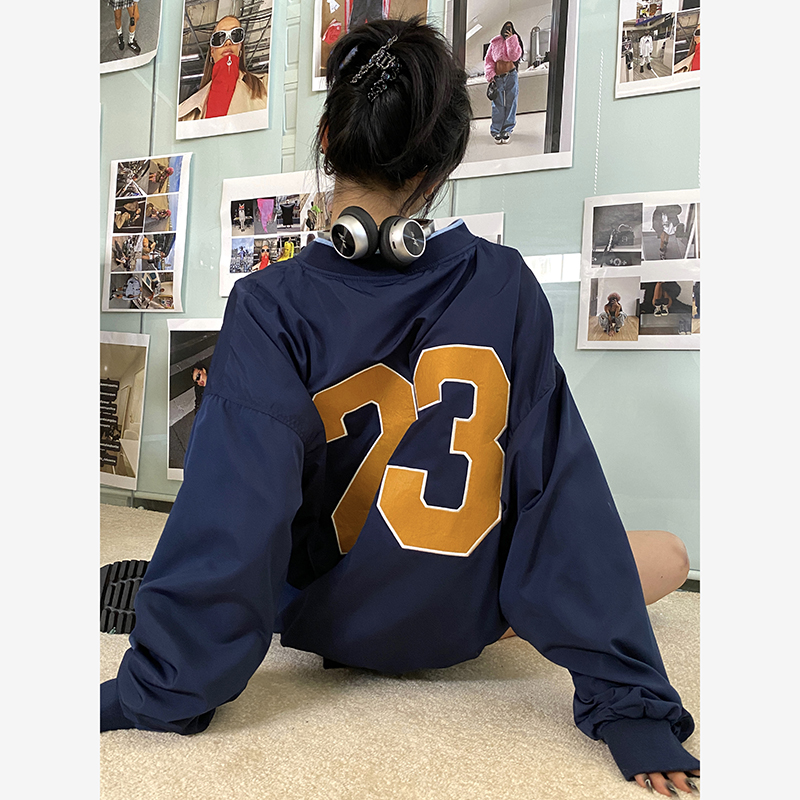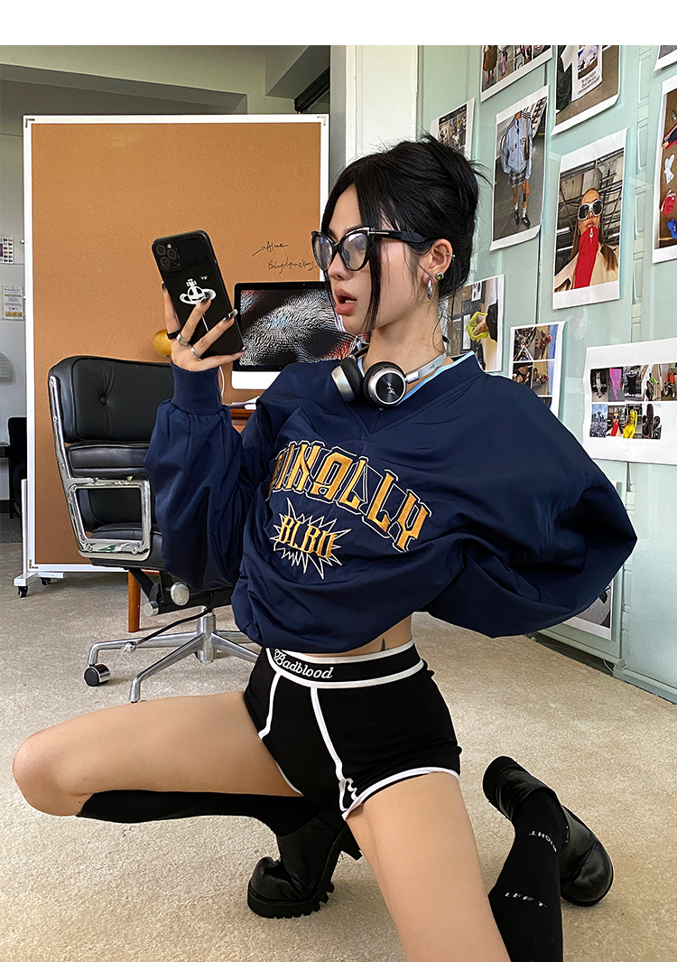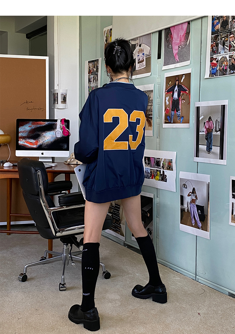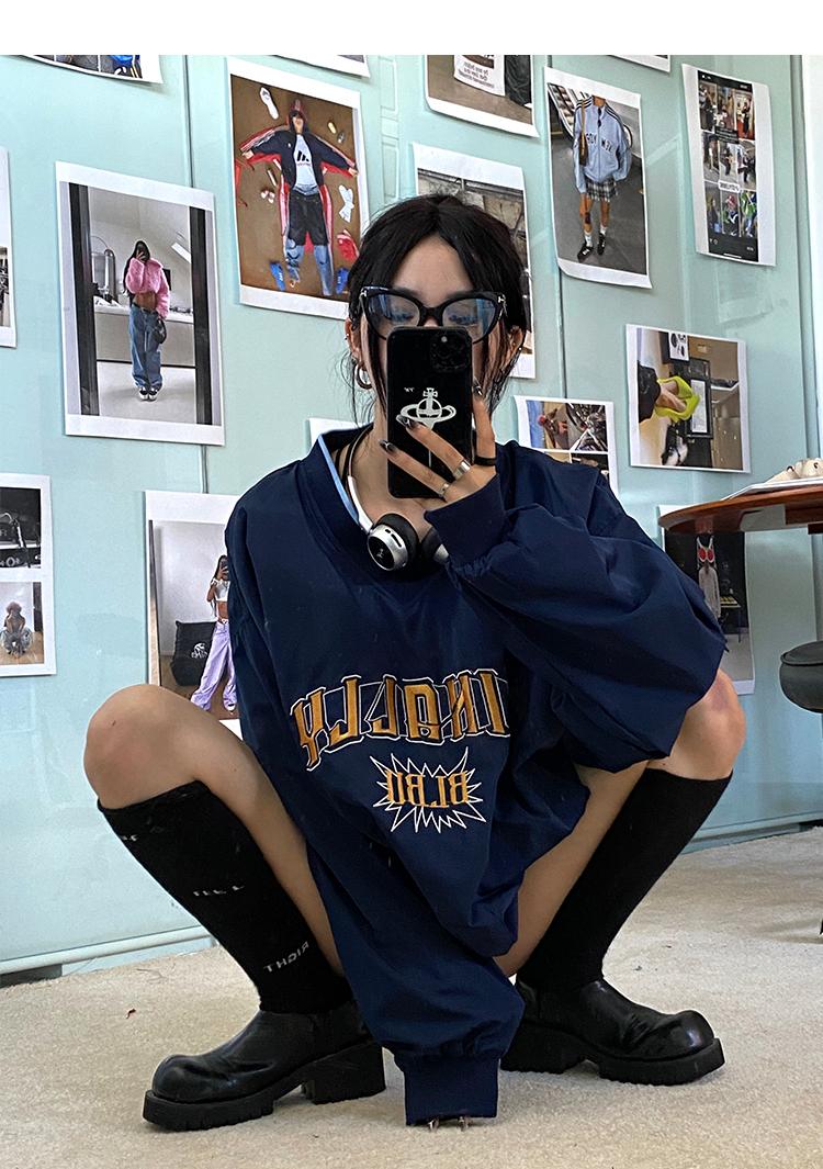 何以沫美式復古棒球服衛衣女2023秋季潮牌刺繡寬鬆V領套頭衫ins潮