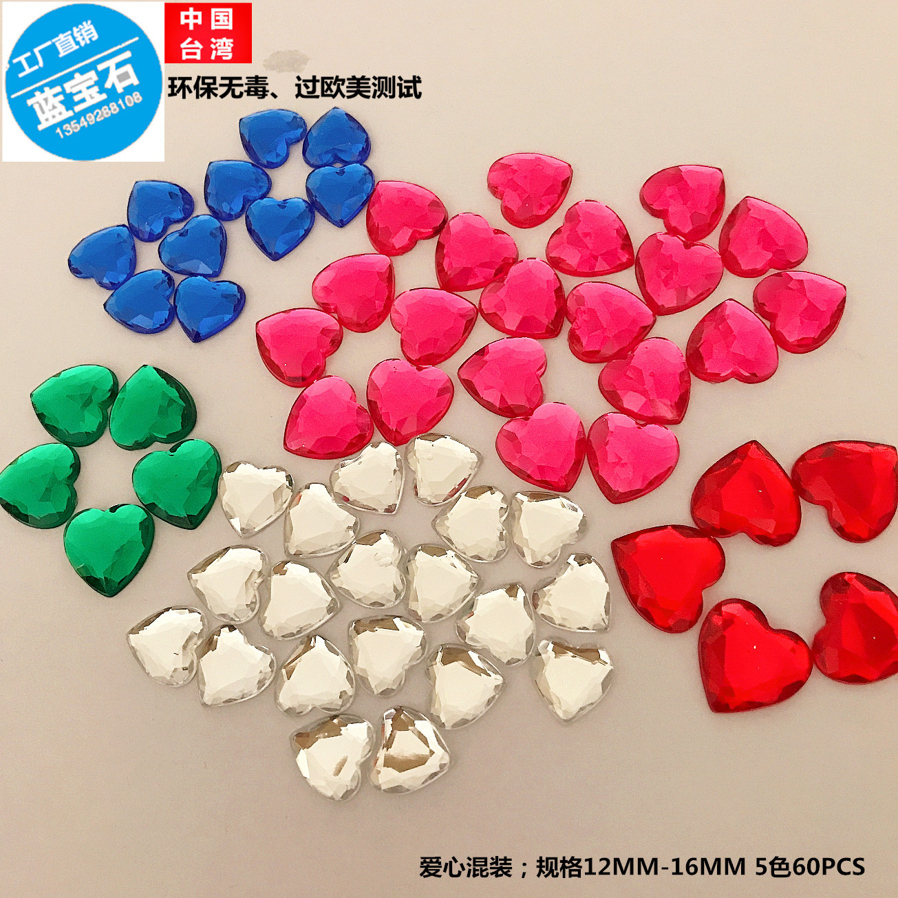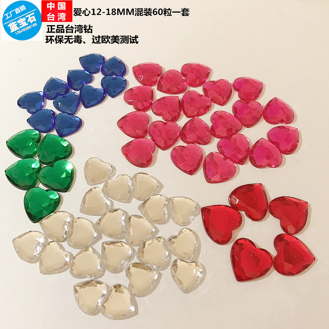 颜色 彩色混装(心形平底钻12MM-16MM 60粒套装,背胶60粒,胶水25ML