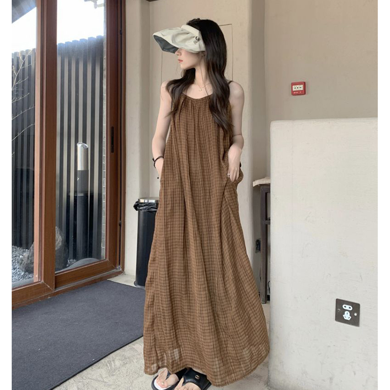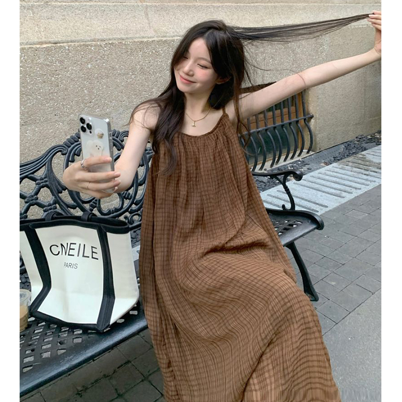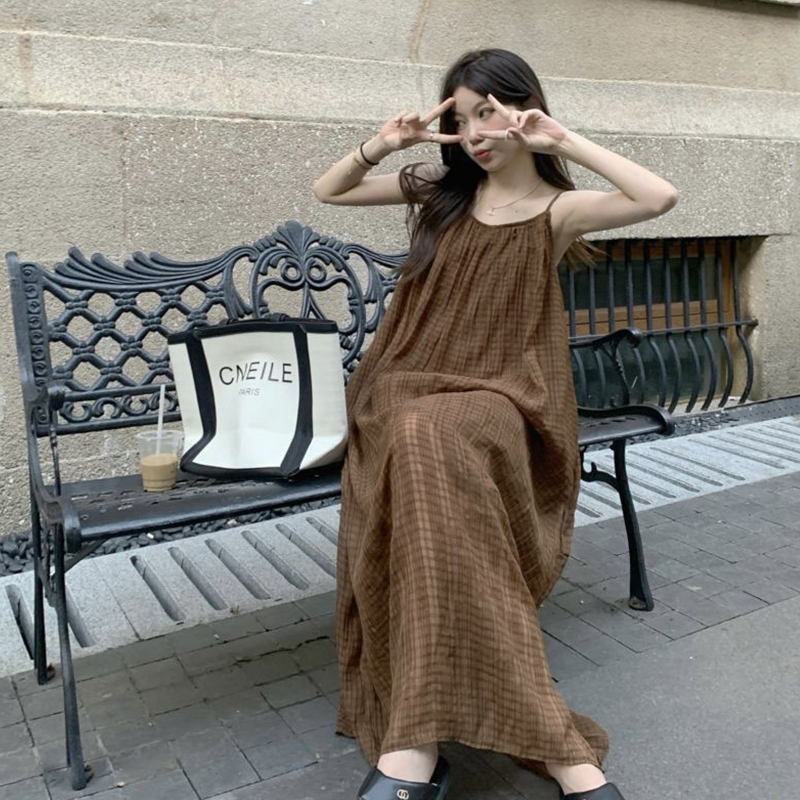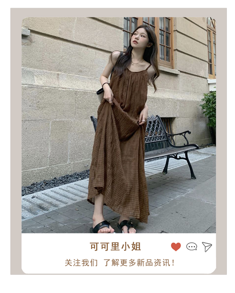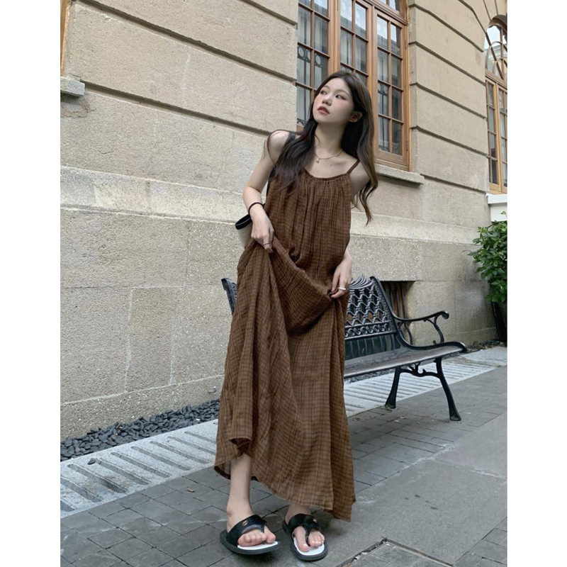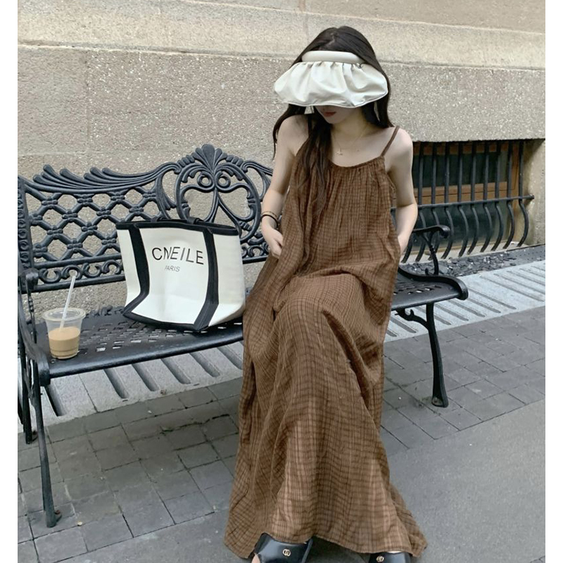 法式慵懶風別致吊帶洋裝秋季2023新款氣質格紋設計感寬鬆長裙女