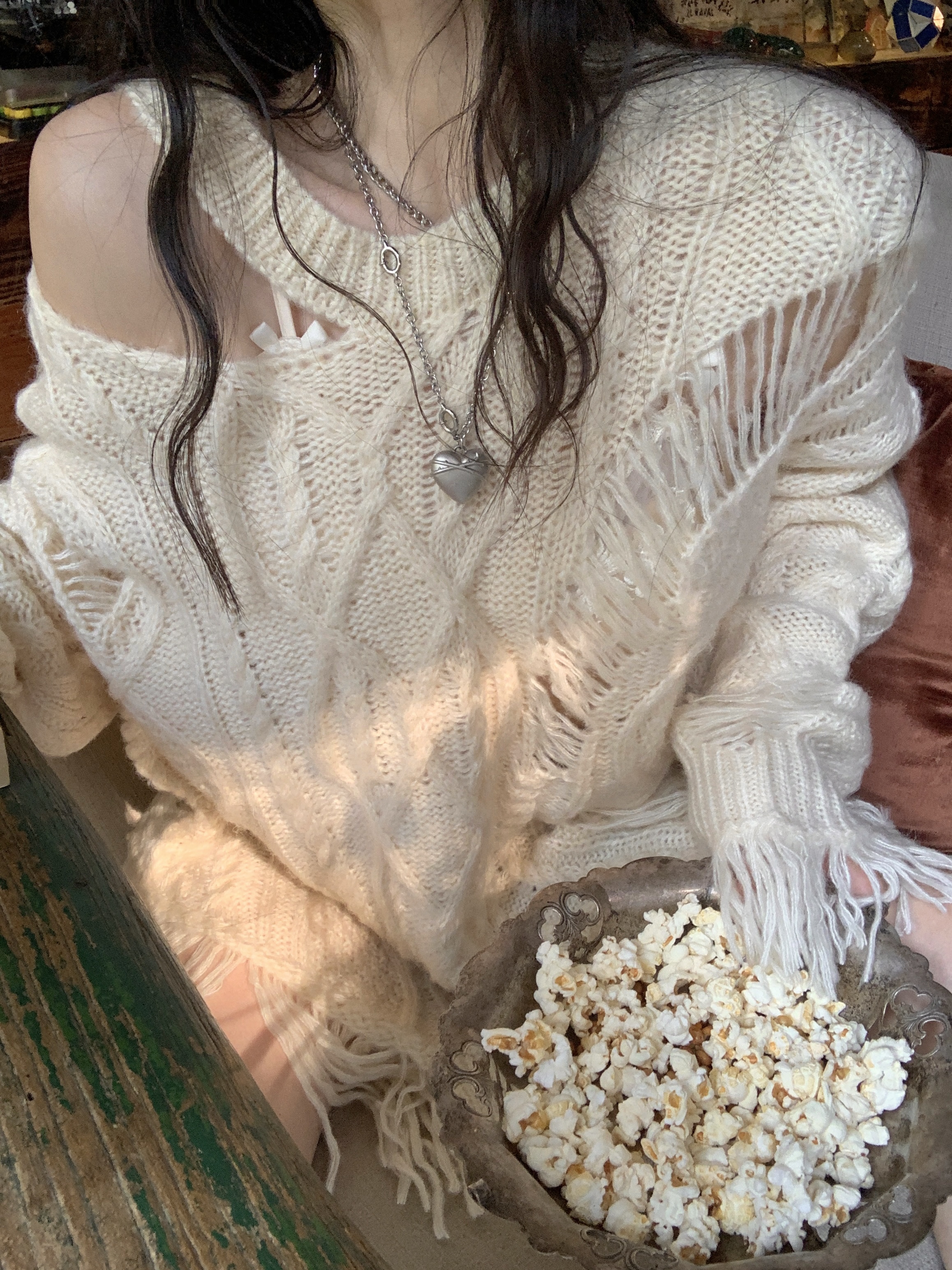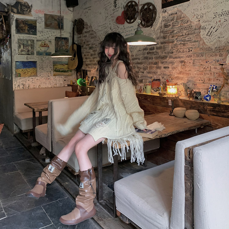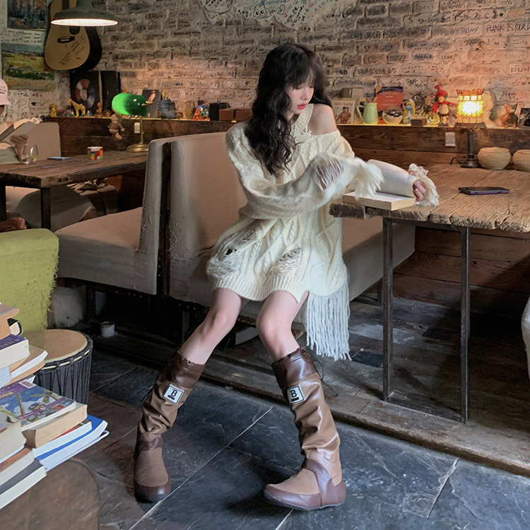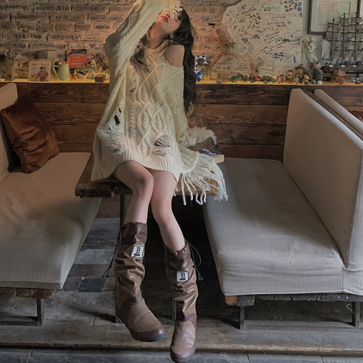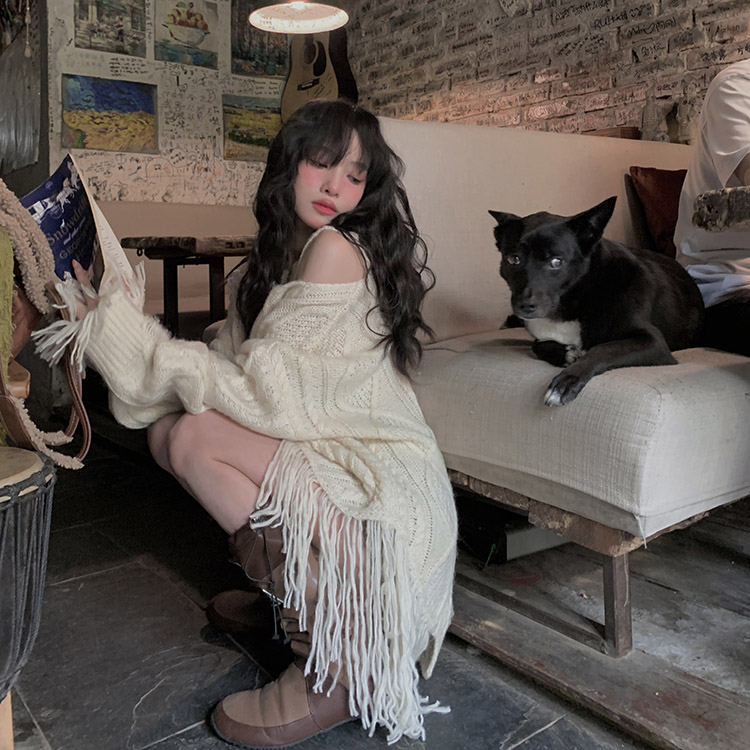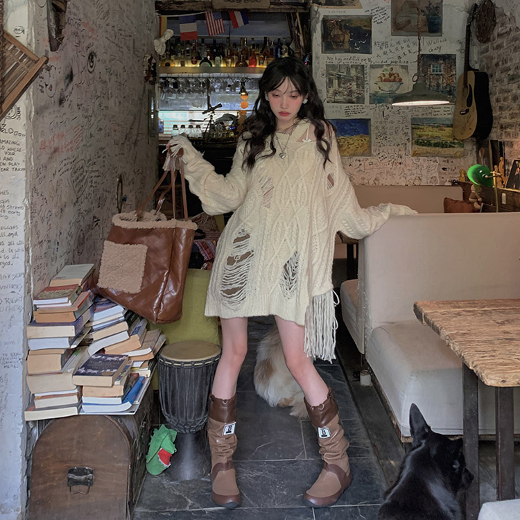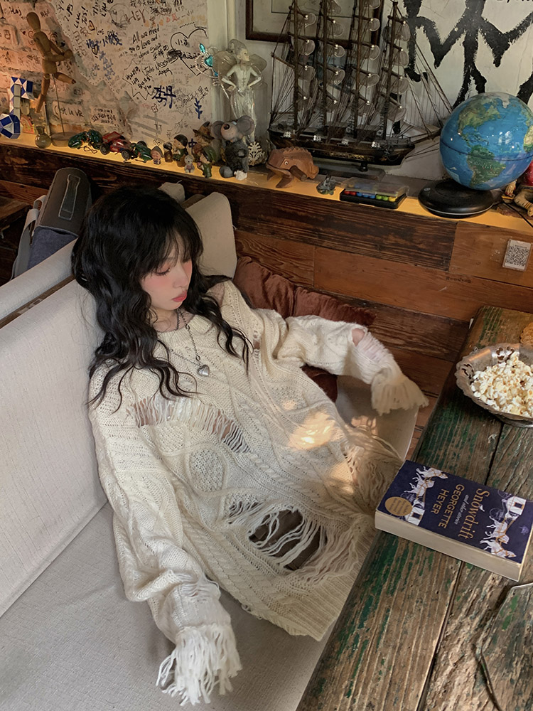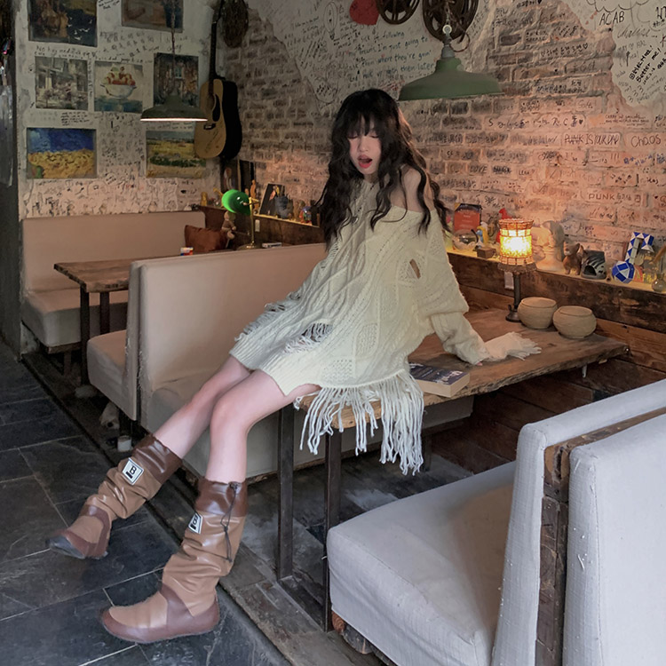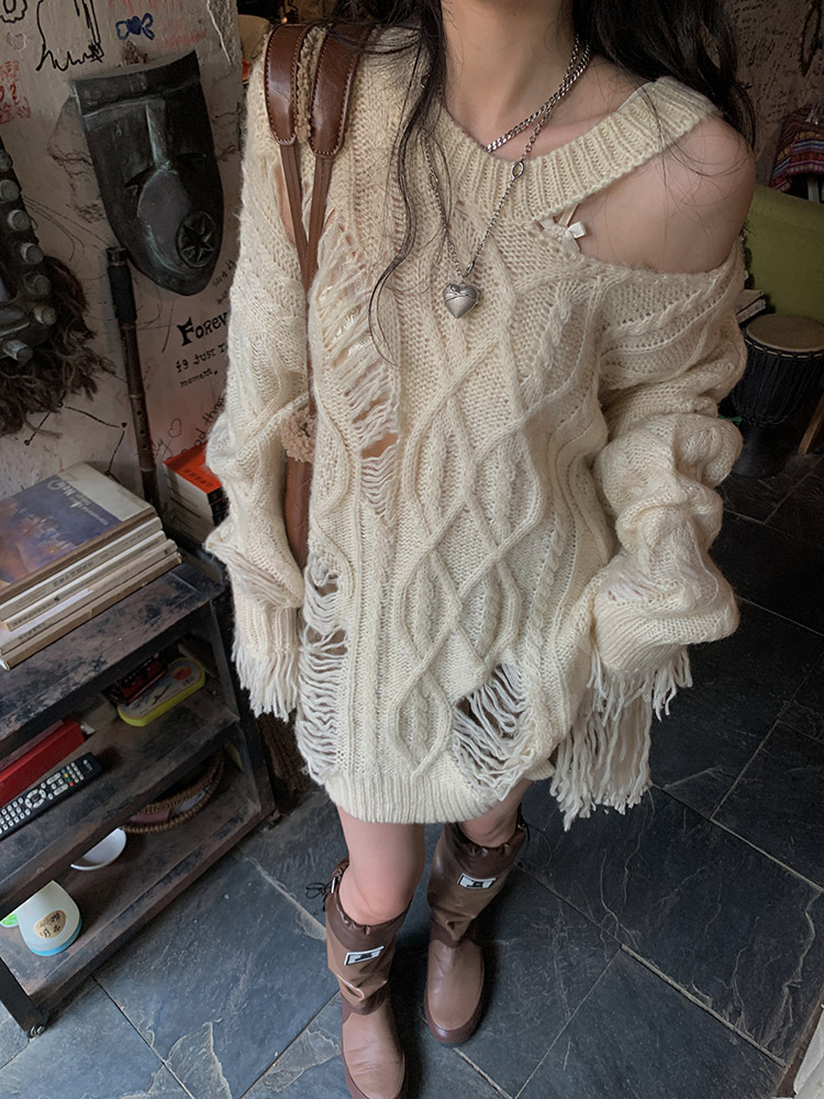FunnJ方形茶幾 慵懶欲系乖妹設計感小眾破洞露肩毛衣女寬鬆針織上衣