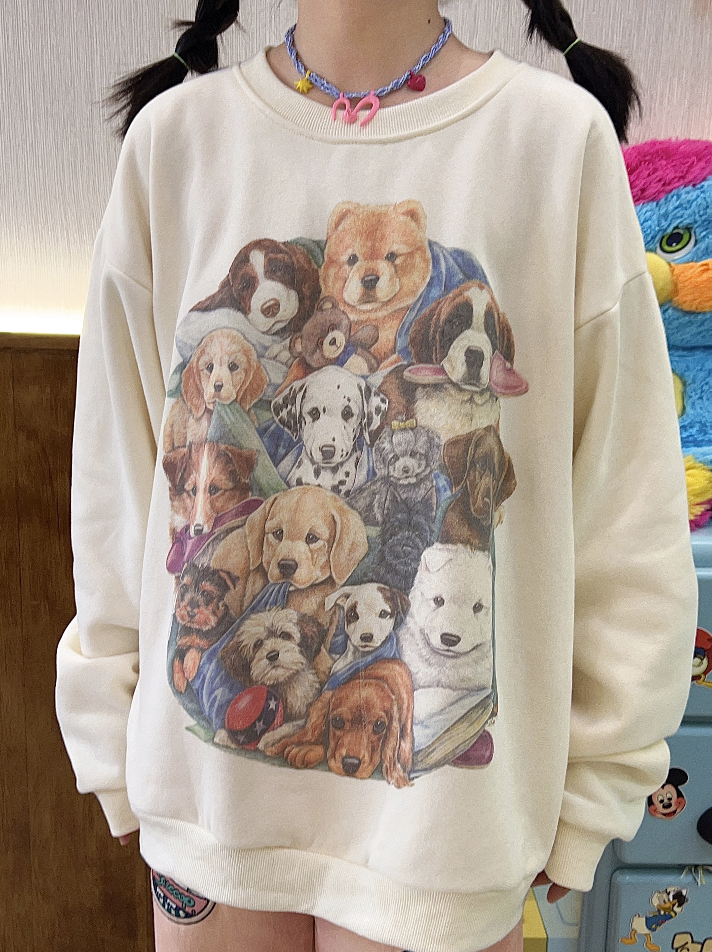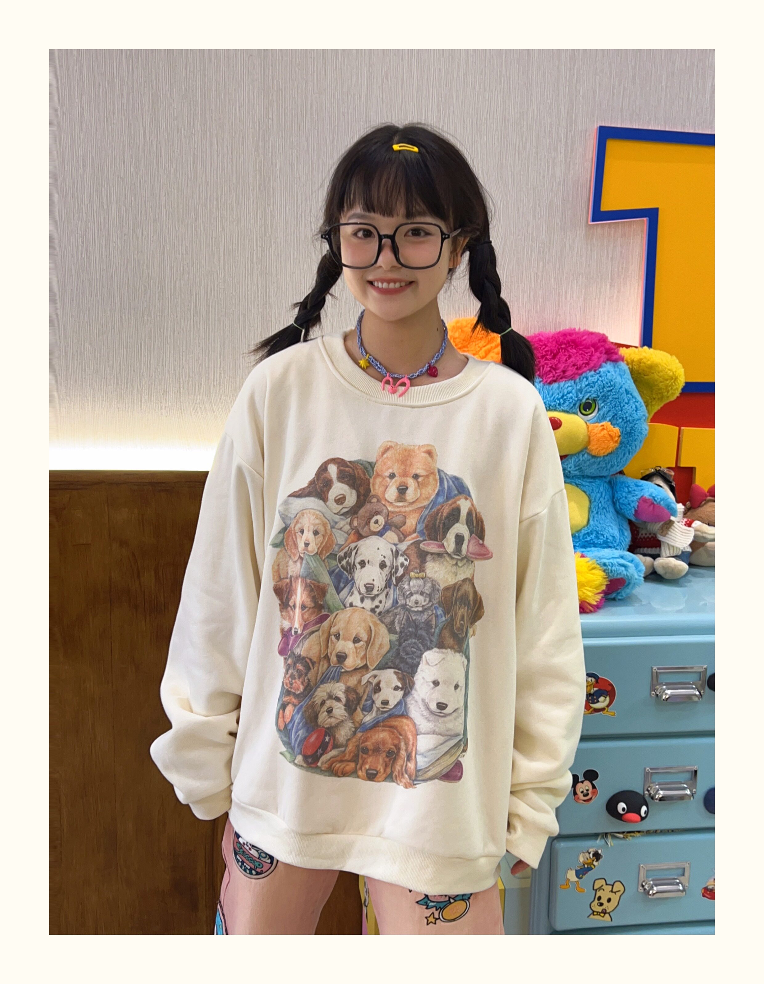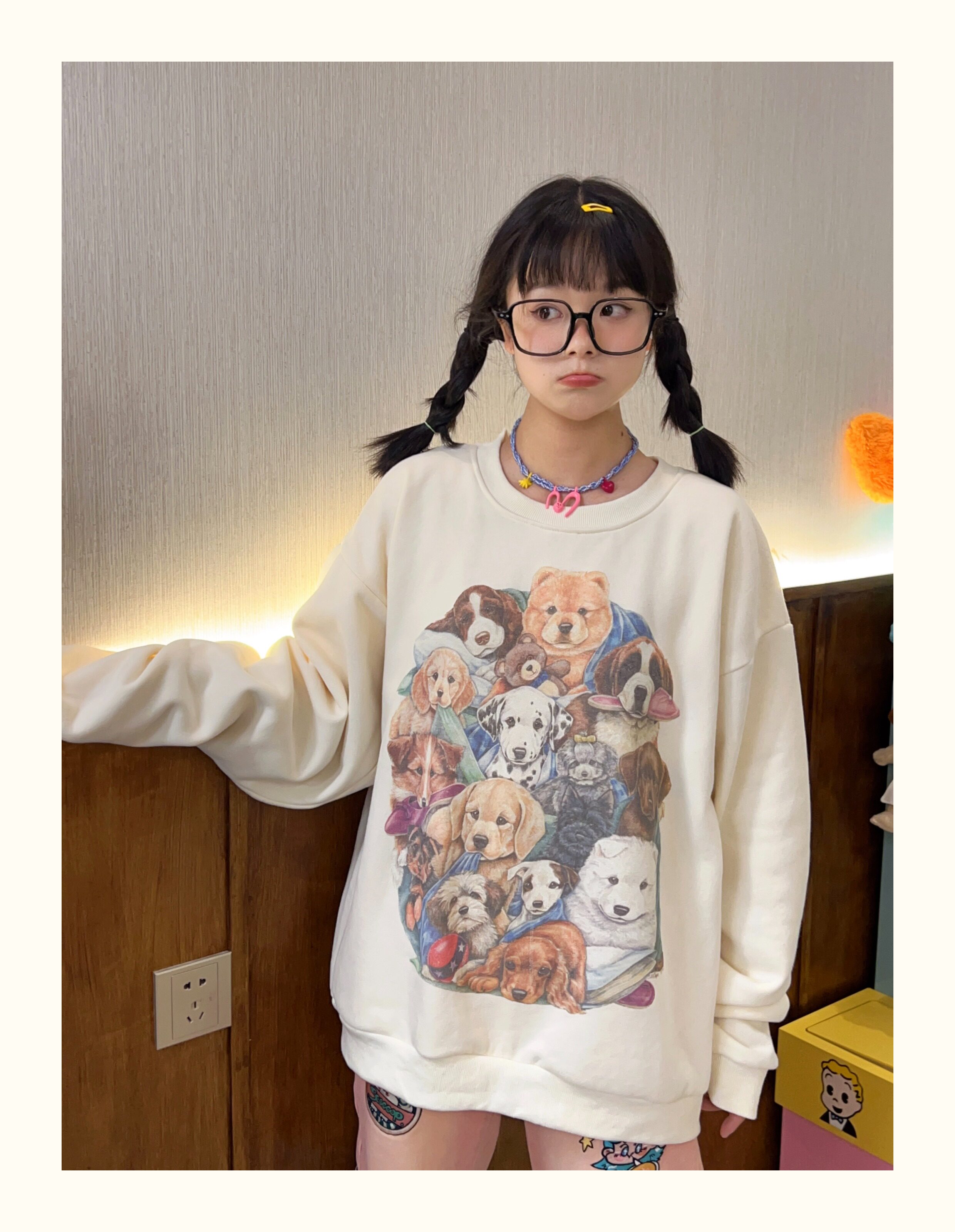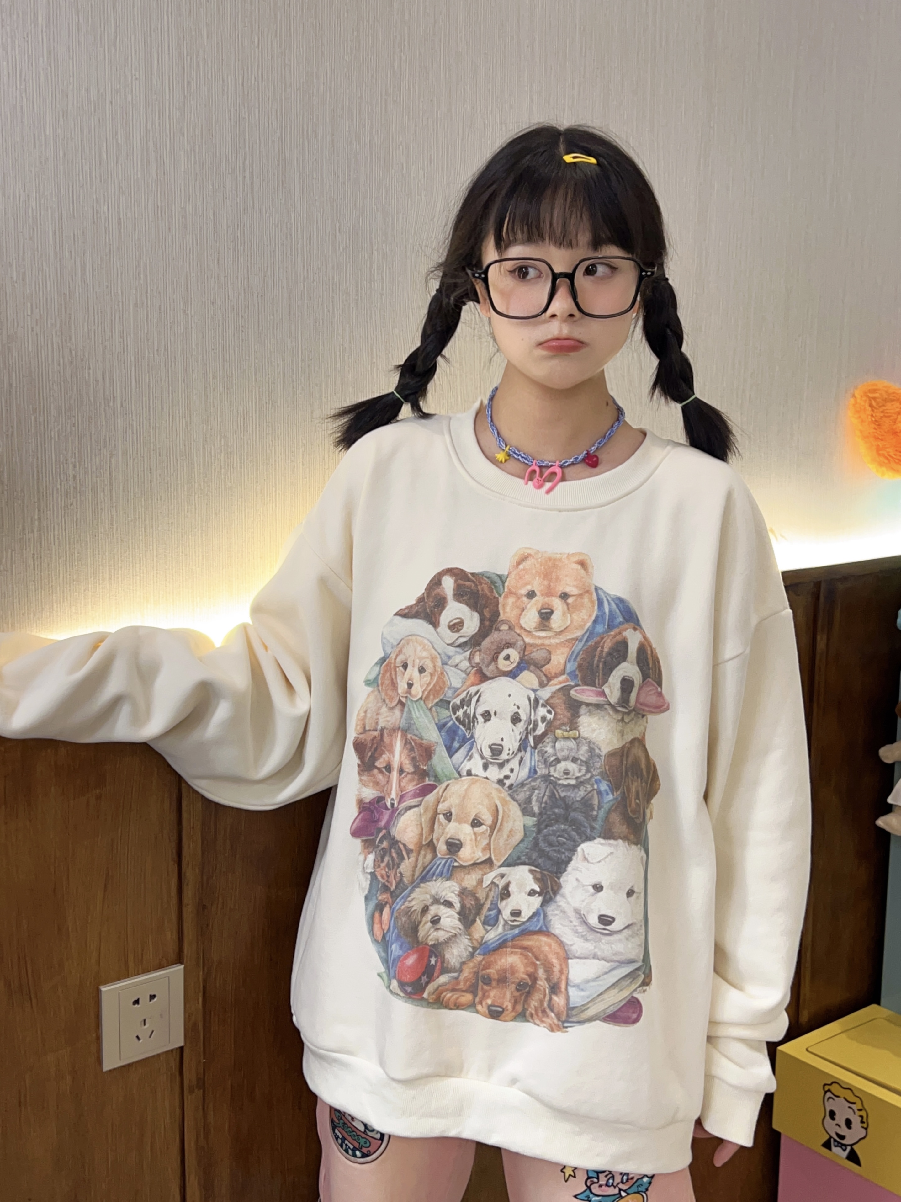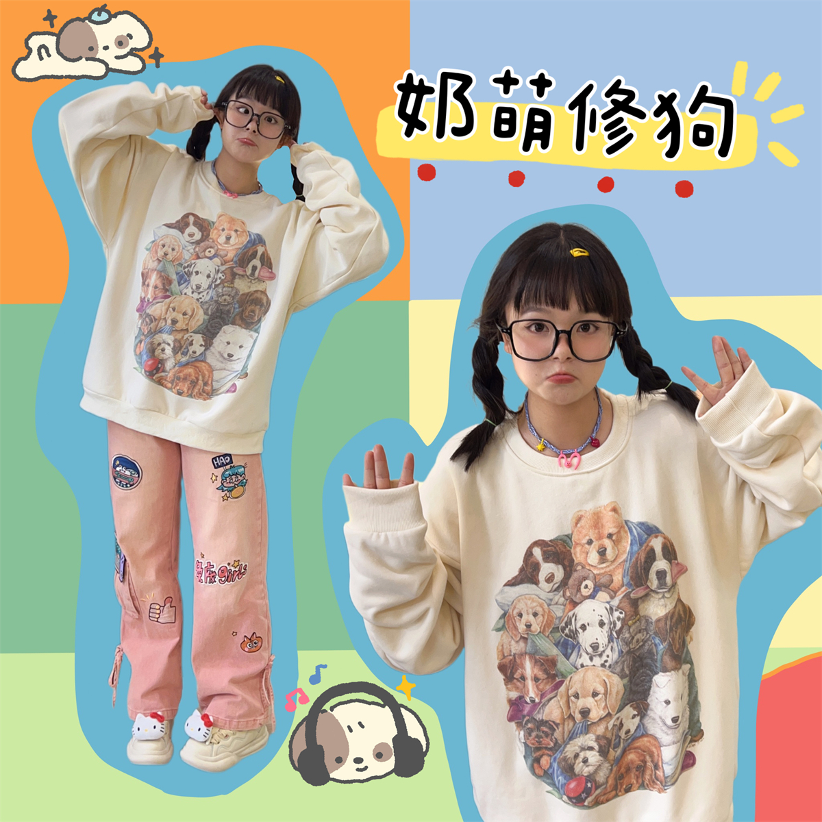 Robootoo狗子童趣古著復古做舊印花百搭奶白色圓領厚棉T2023年秋冬