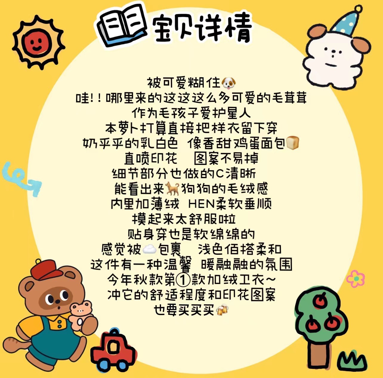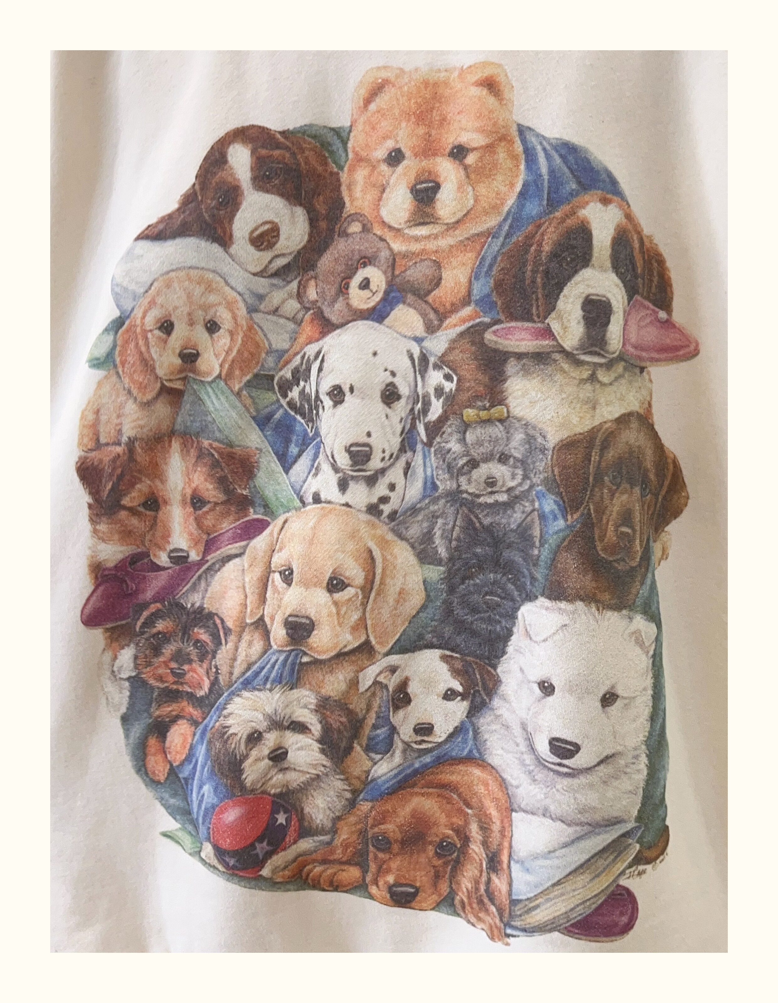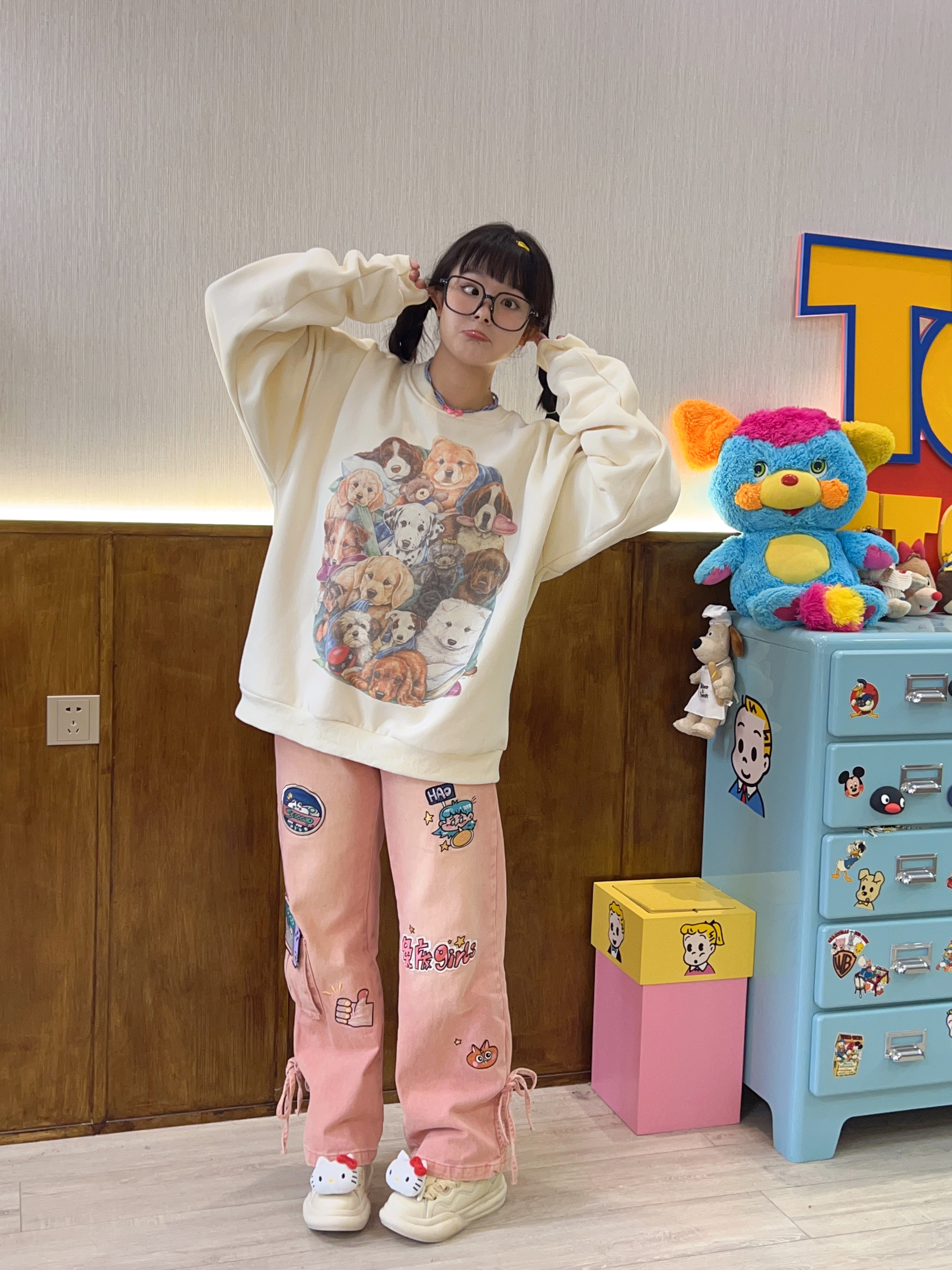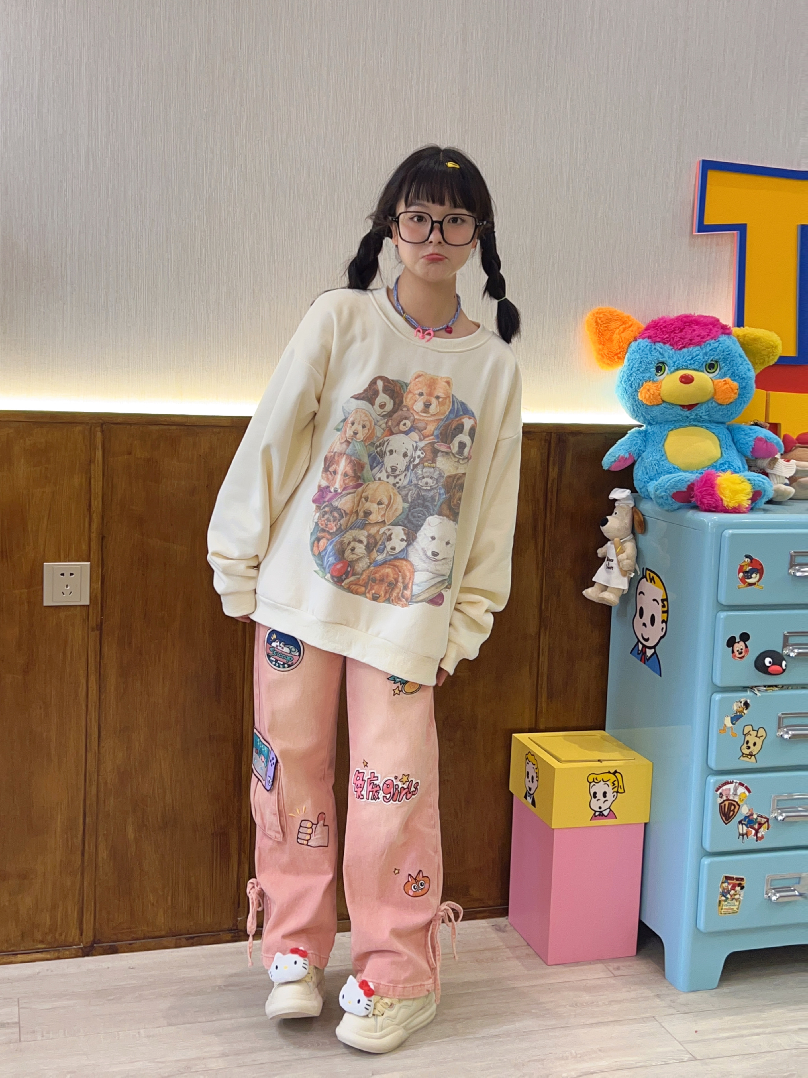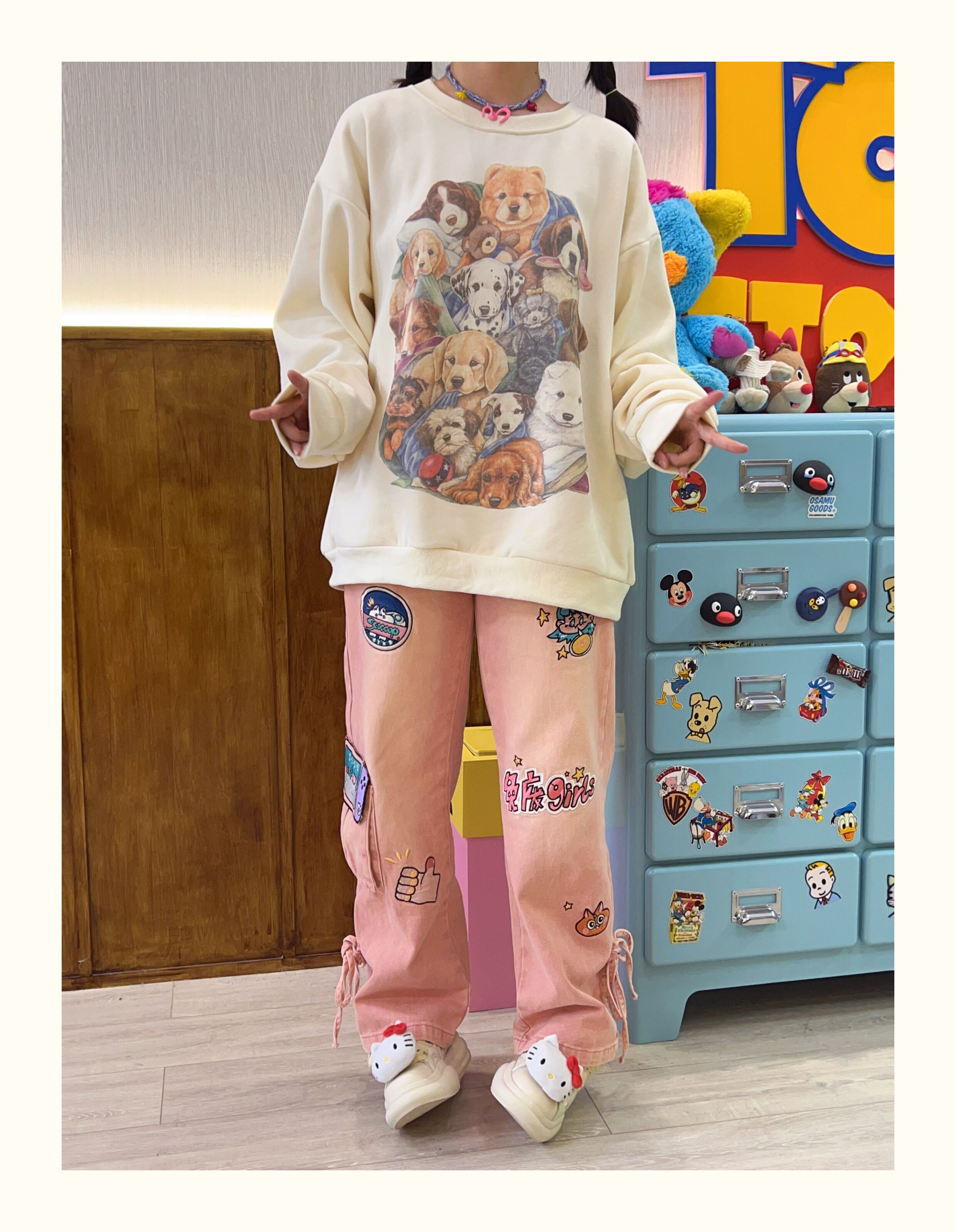 Robootoo狗子童趣古著復古做舊印花百搭奶白色圓領厚棉T2023年秋冬