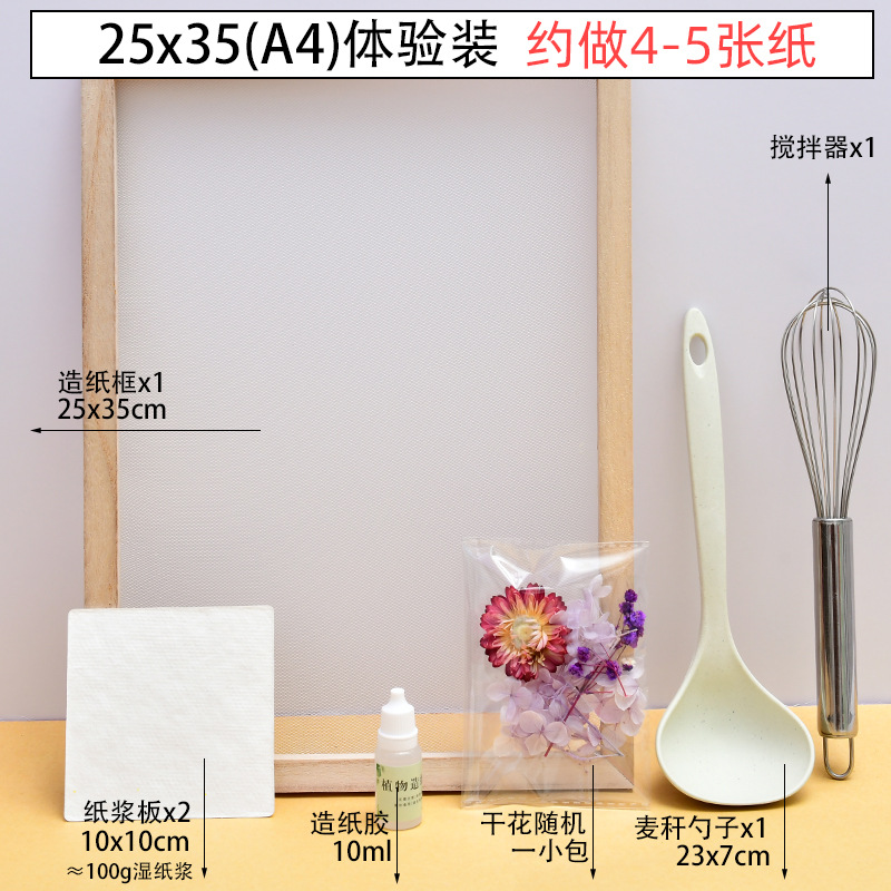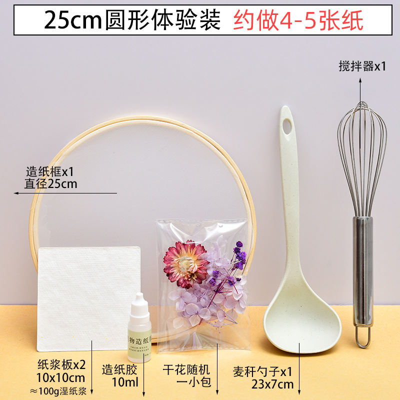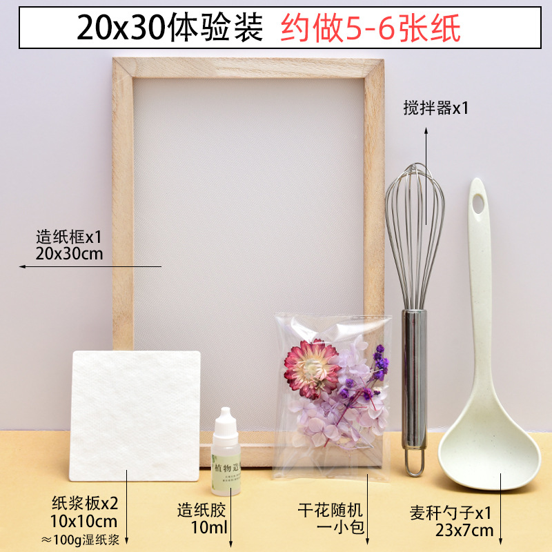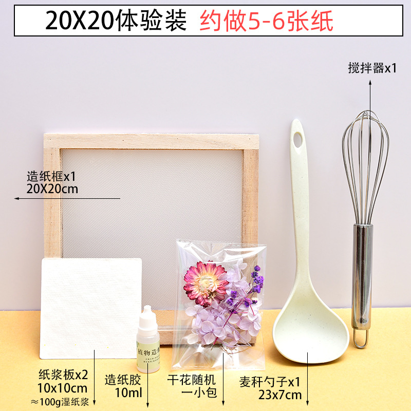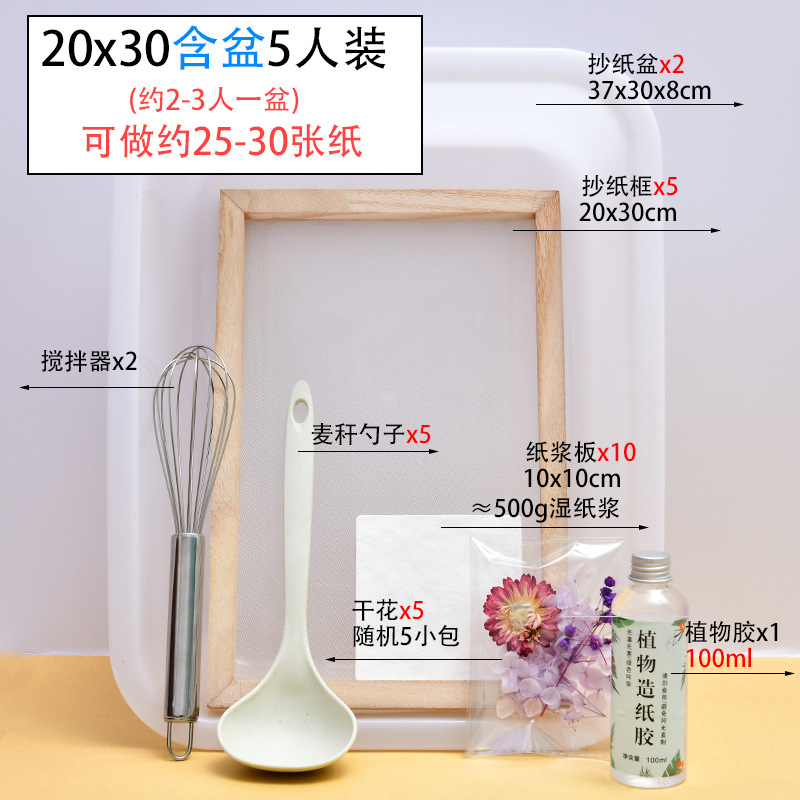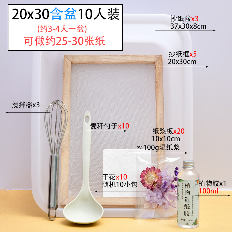 颜色 20x20体验装,20x30体验装,25x35(A4)体验装,25厘米圆形体验装,20x30含盆体验装,20x30含盆5人共享装,20x30含盆10人共享装,造纸胶10ml(1瓶),造纸胶100ml(1瓶),纸浆板10x10cm(1片),湿纸浆100g,抄纸盆37x30x8cm,抄纸框20x20cm,抄纸框20x30cm,抄纸框25x35cm,抄纸框圆形直径20cm,抄纸框圆形直径25cm,抄纸框圆形直径30cm,麦秆勺子,搅拌器