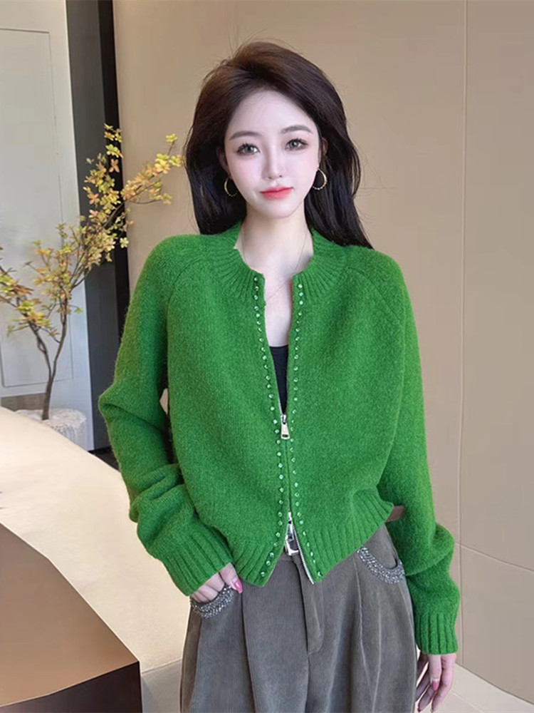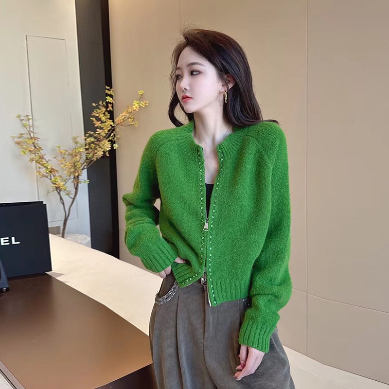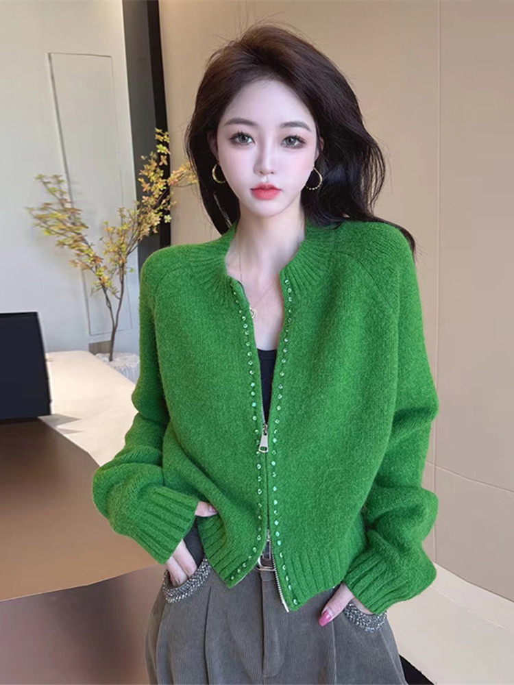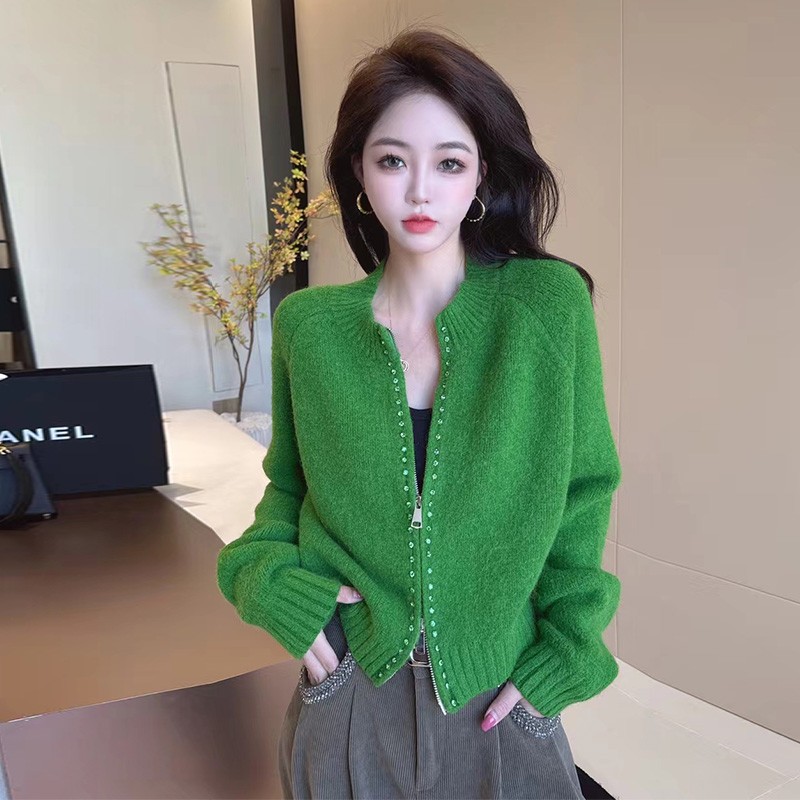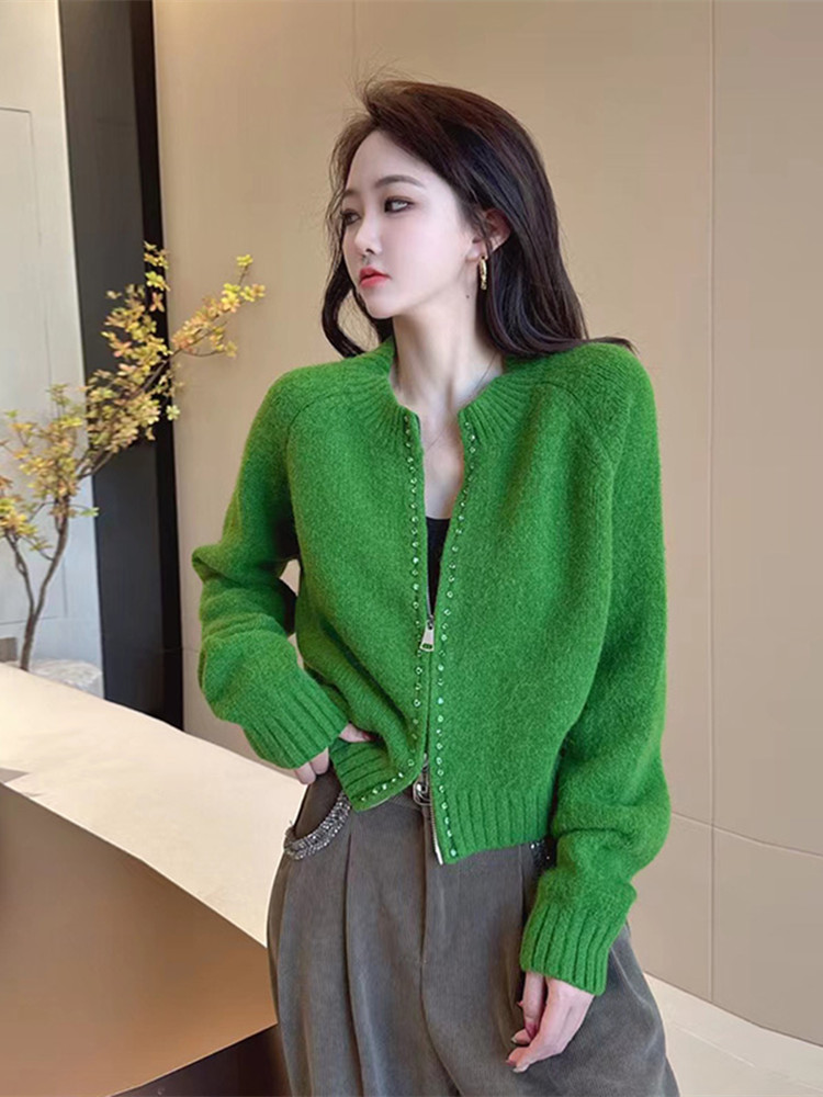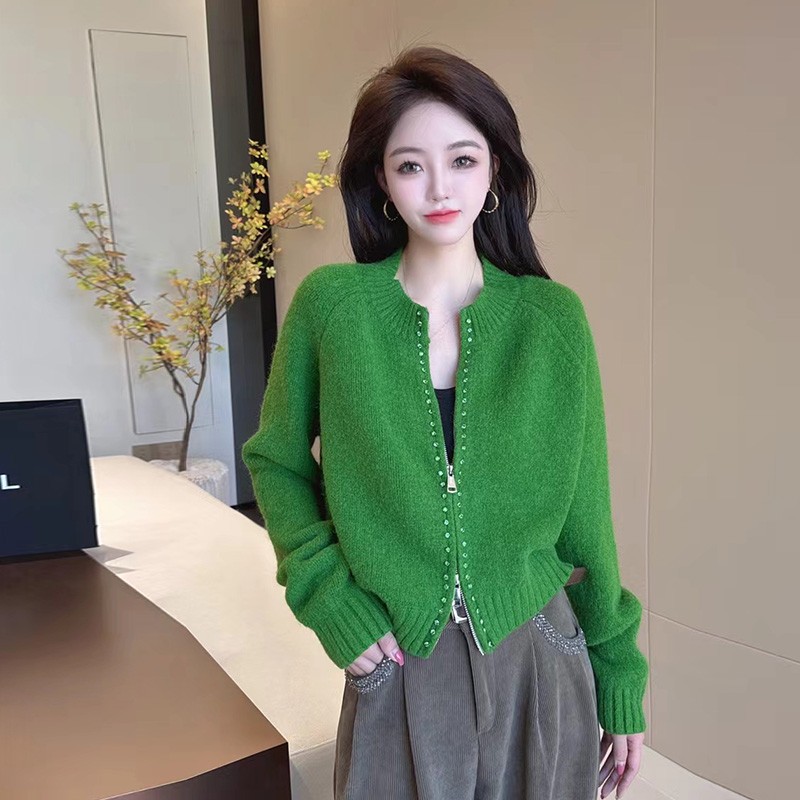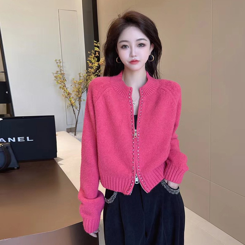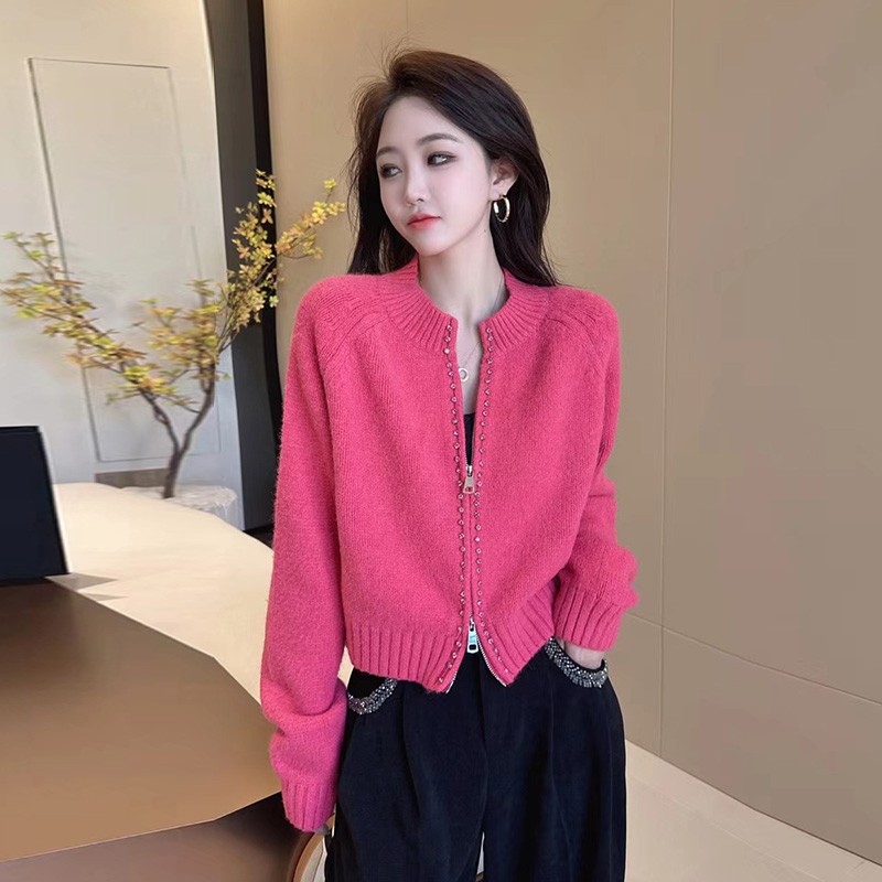 歐貨雙拉鍊玫紅色針織毛衣開衫外套女秋冬2023新款慵懶小個子上衣