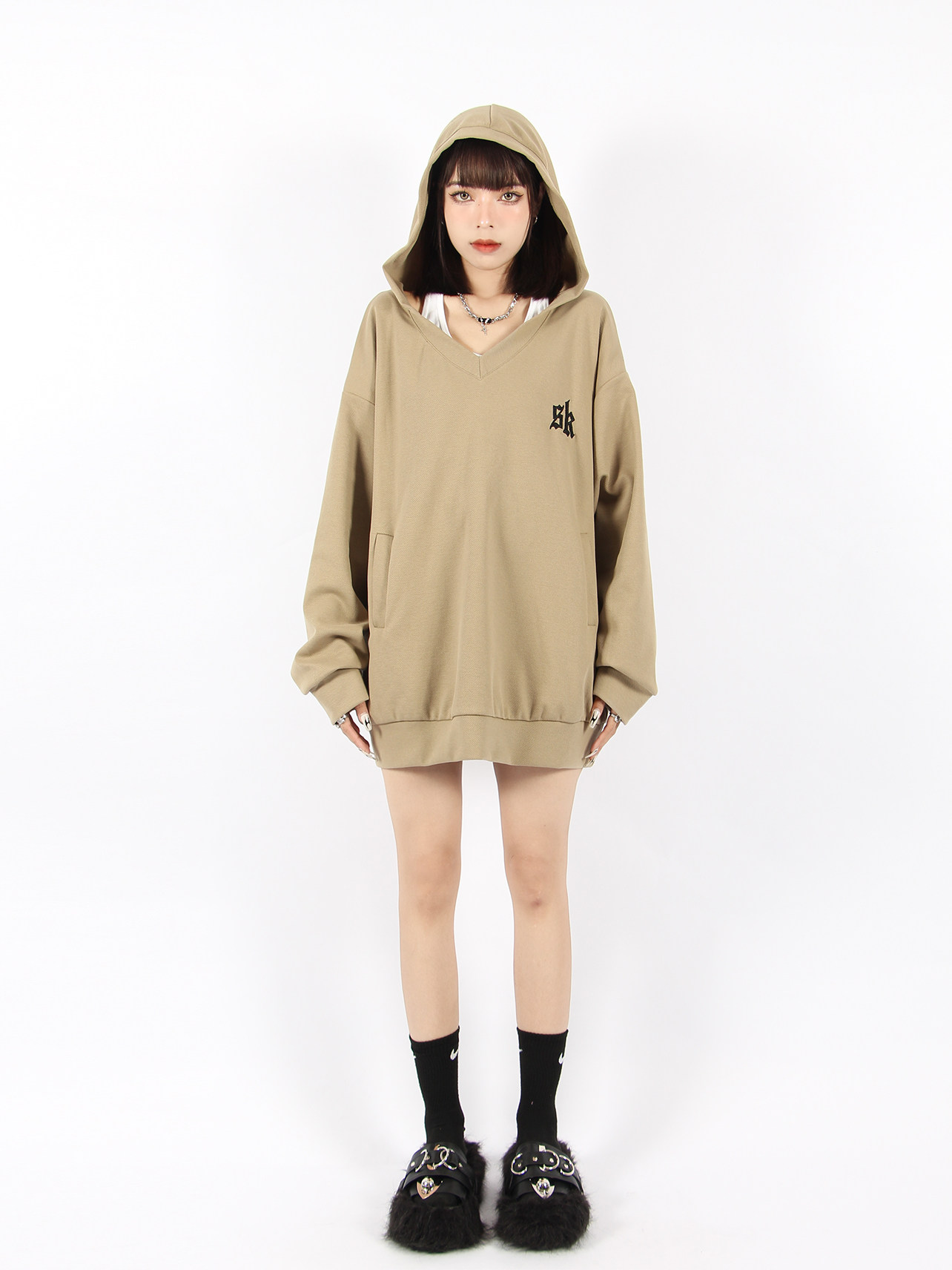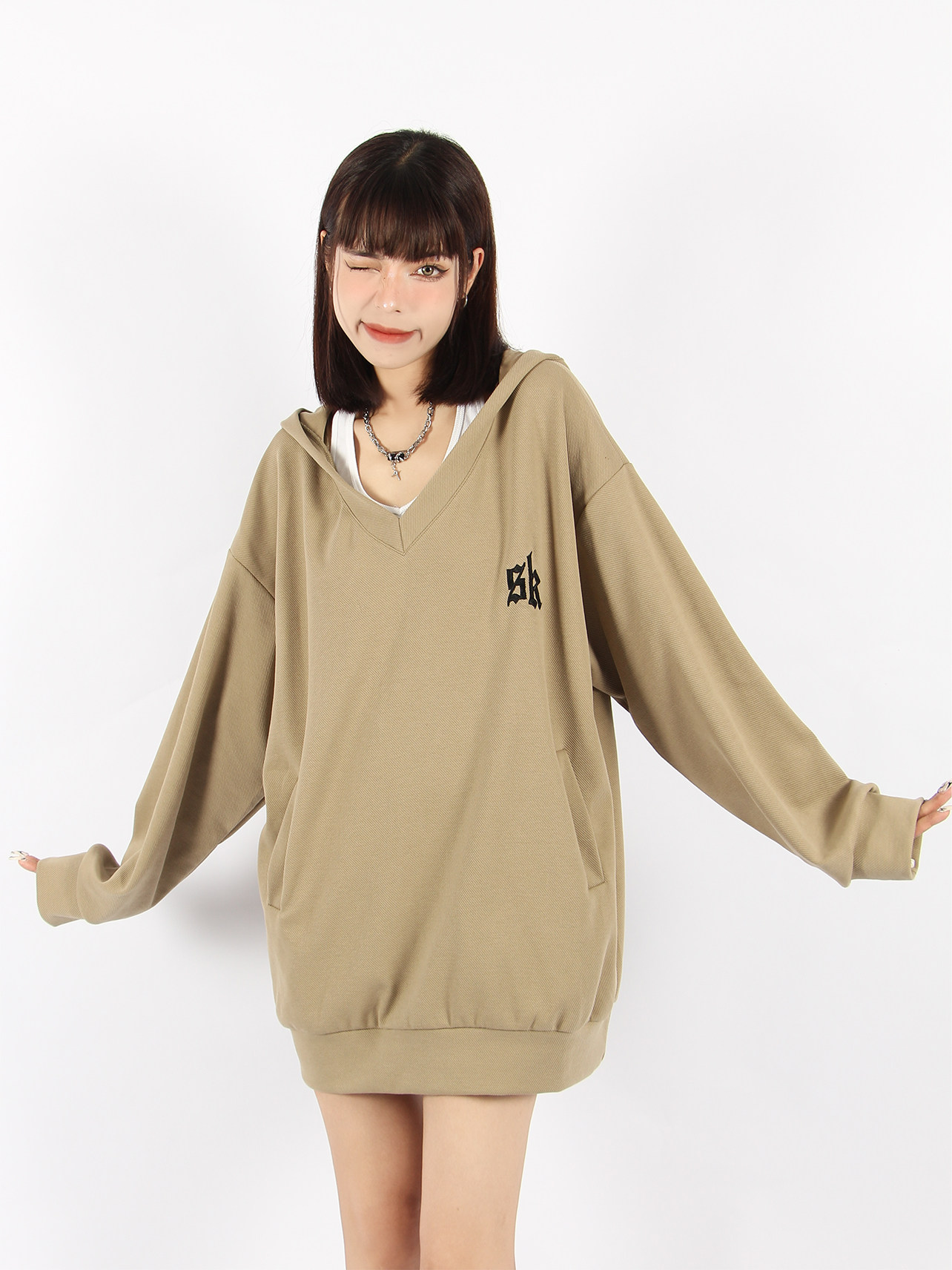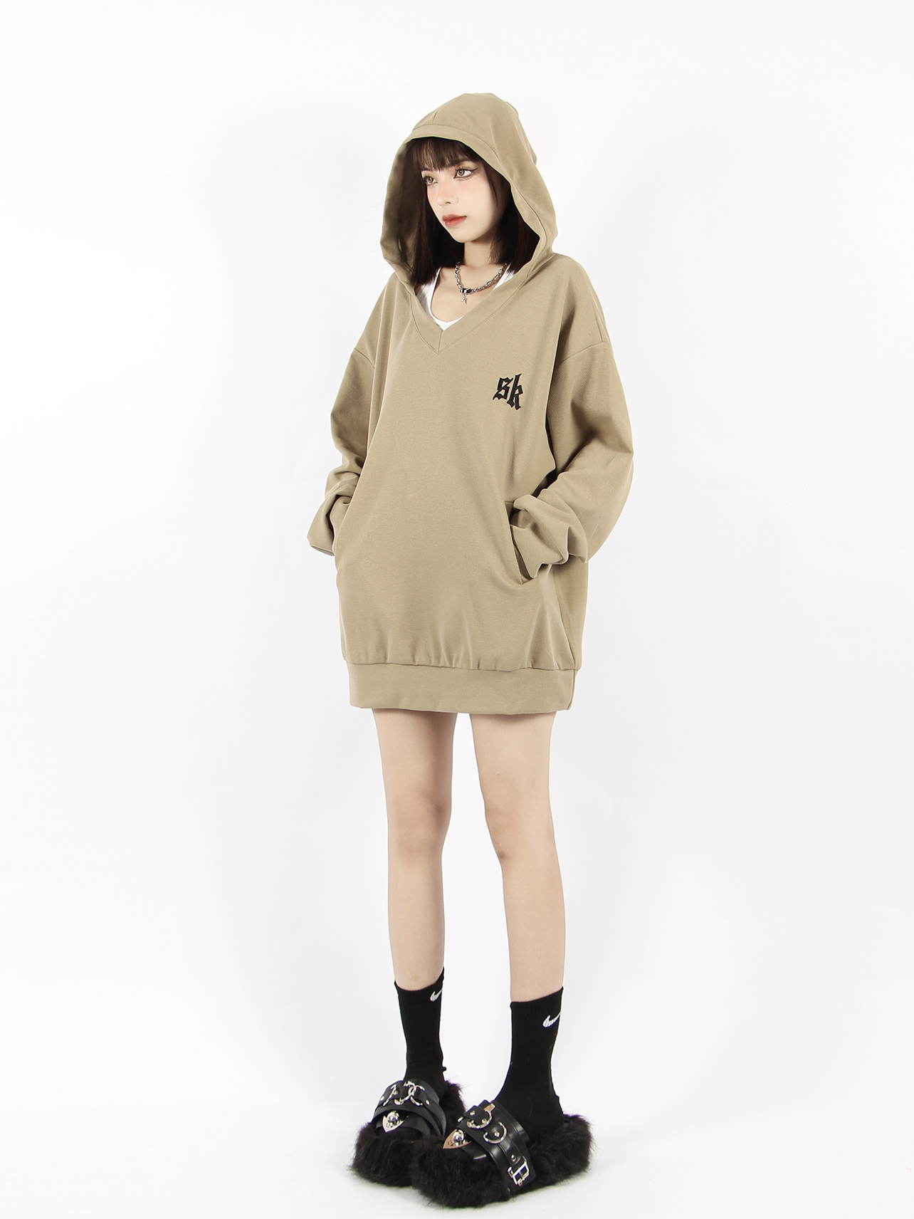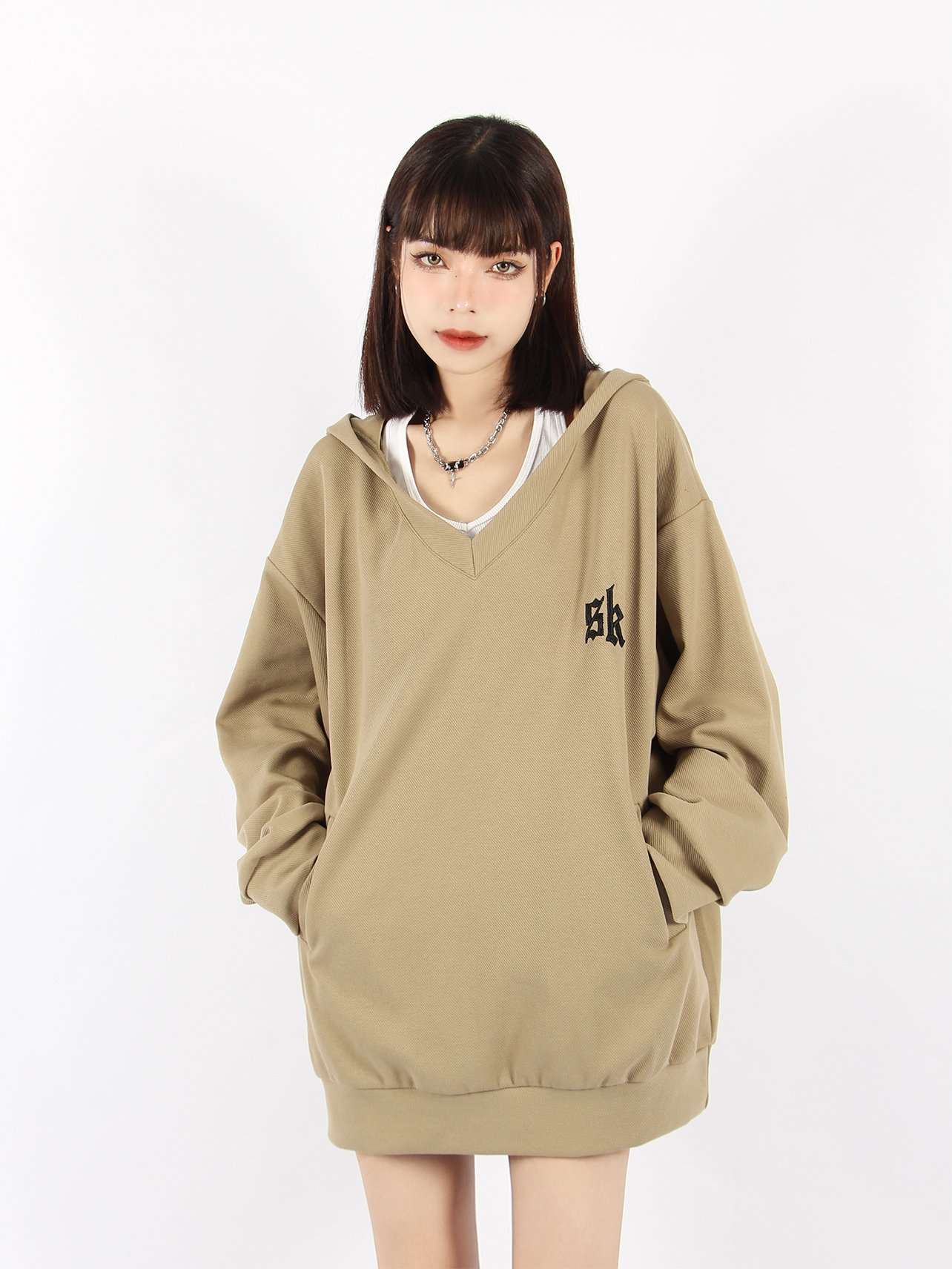 BIGGOLD 大V領連帽運動衫女春秋美式復古刺繡潮牌ins休閒慵懶風外套