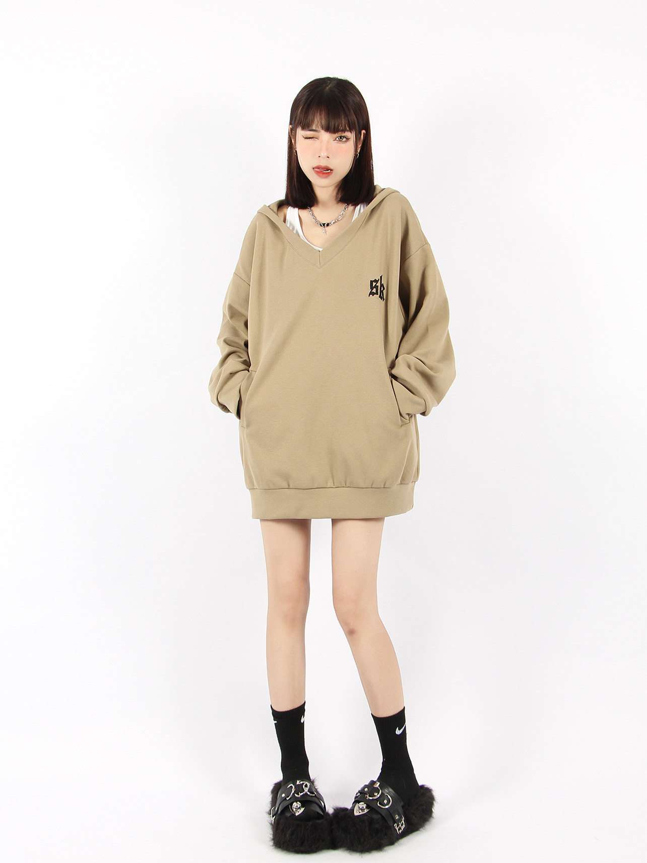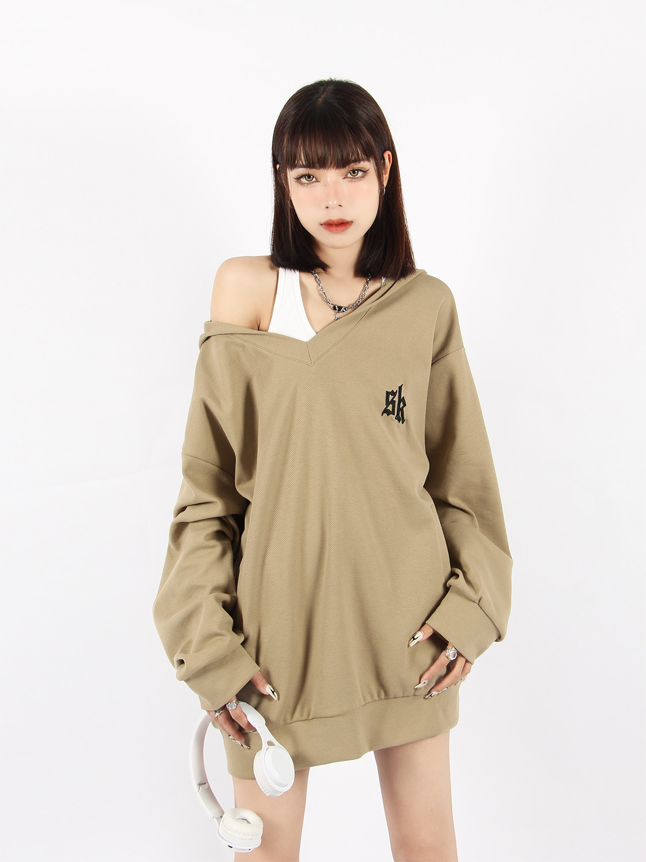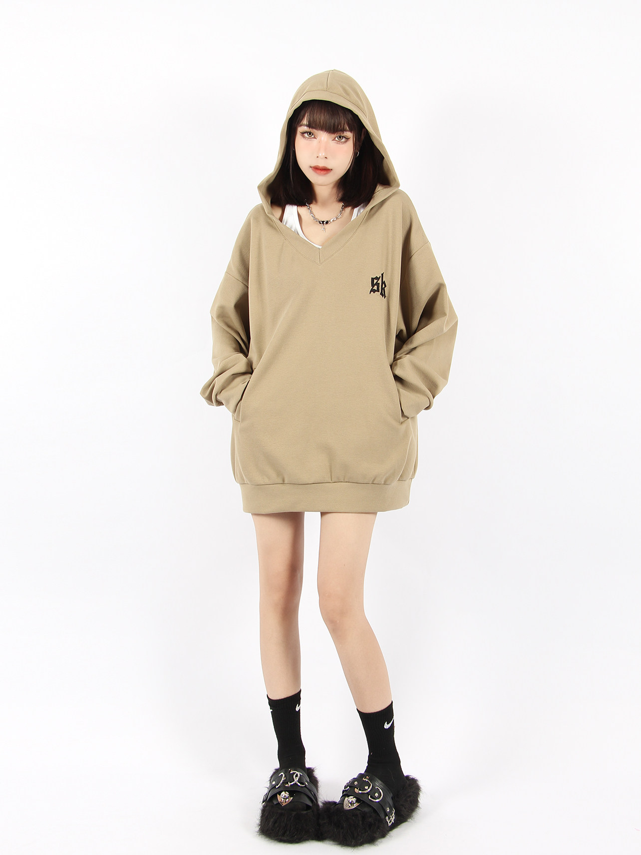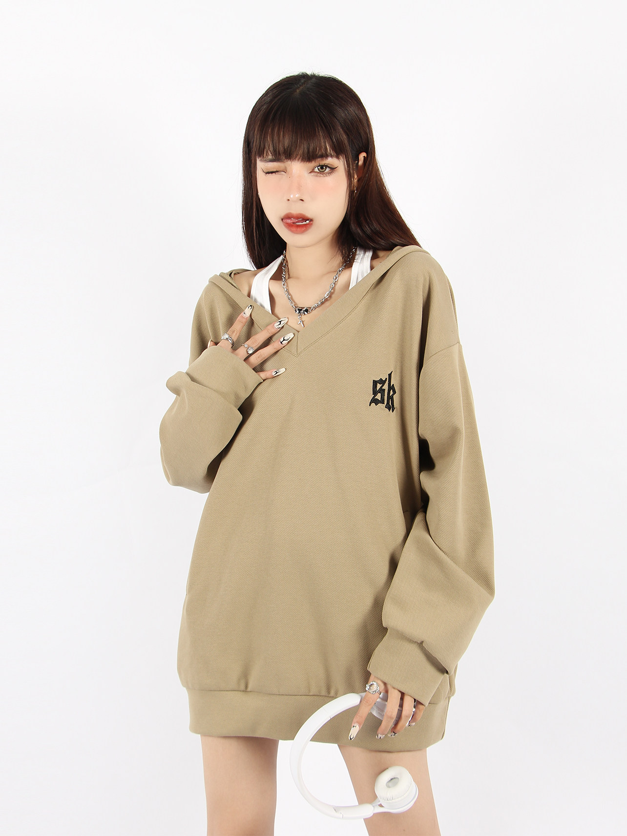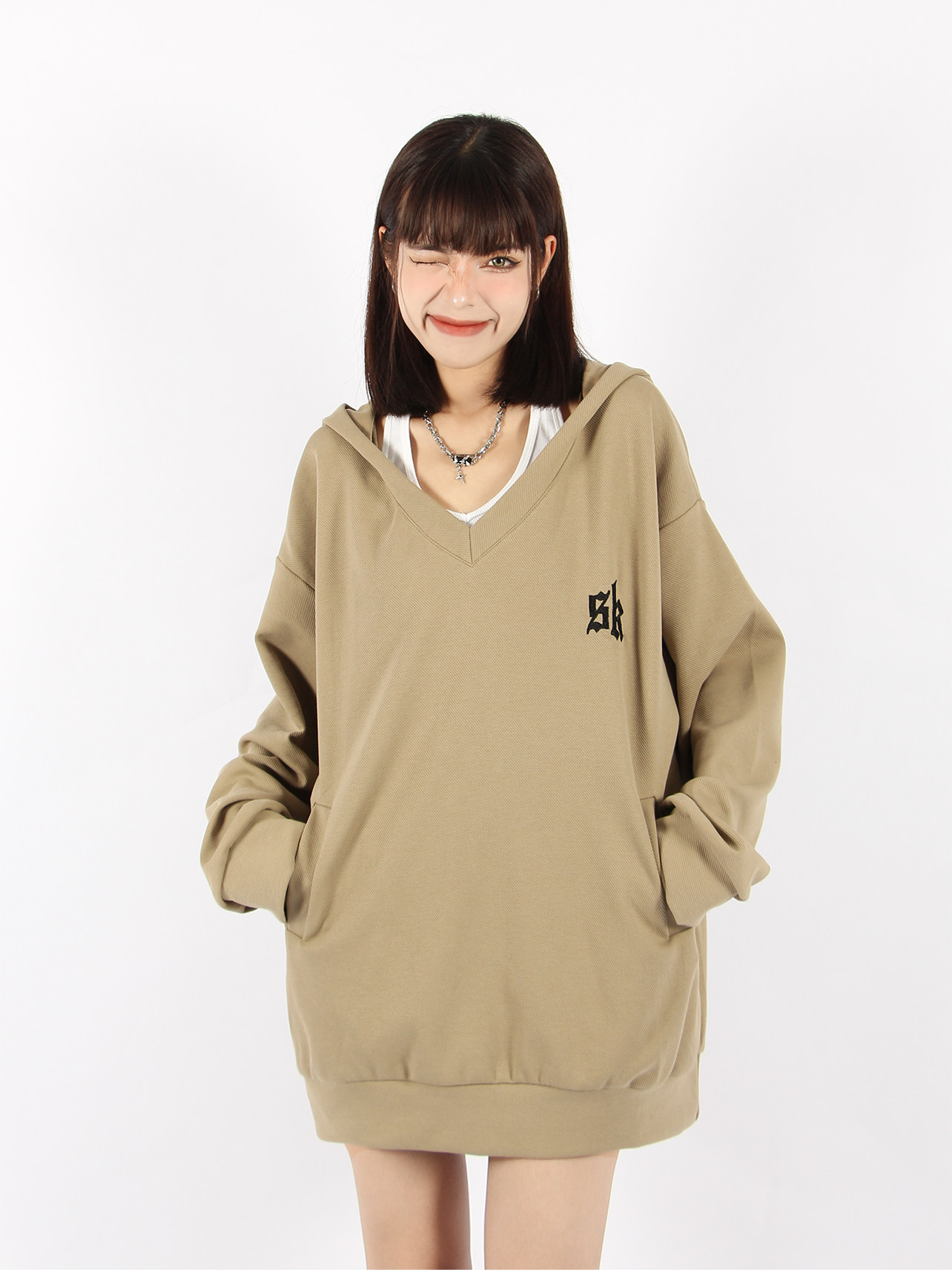 BIGGOLD 大V領連帽運動衫女春秋美式復古刺繡潮牌ins休閒慵懶風外套