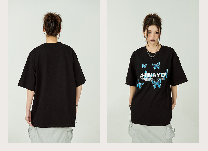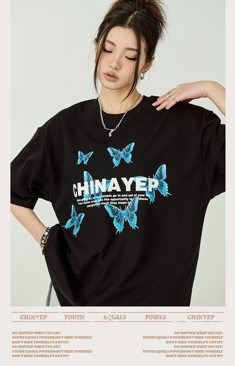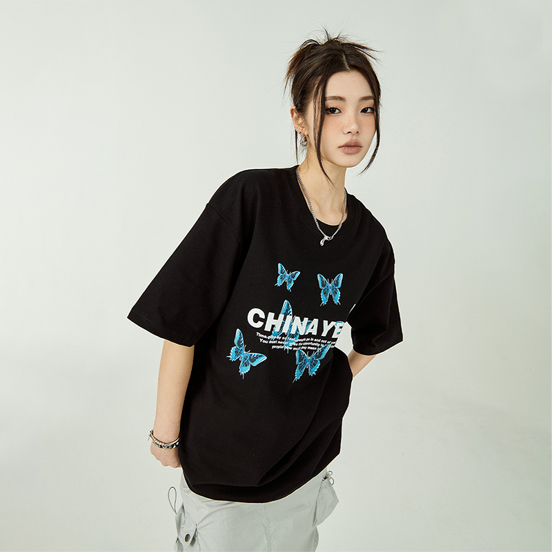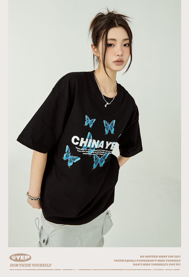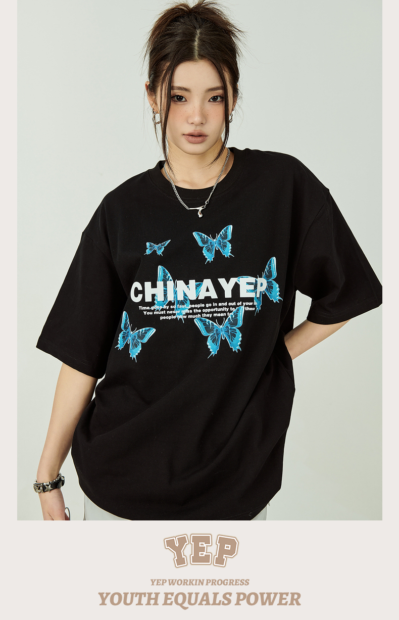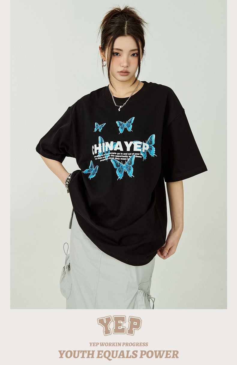 YEP寬鬆蝴蝶印花短袖T恤女夏季2023新款復古美式街頭ins潮牌上衣