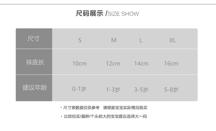 童袜尺码 S 0-1岁,M 1-3岁,L 3-5岁,XL 5-8岁