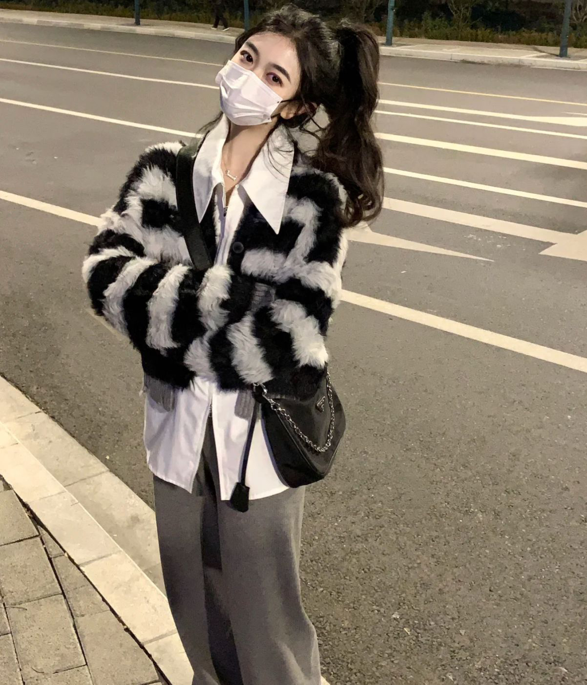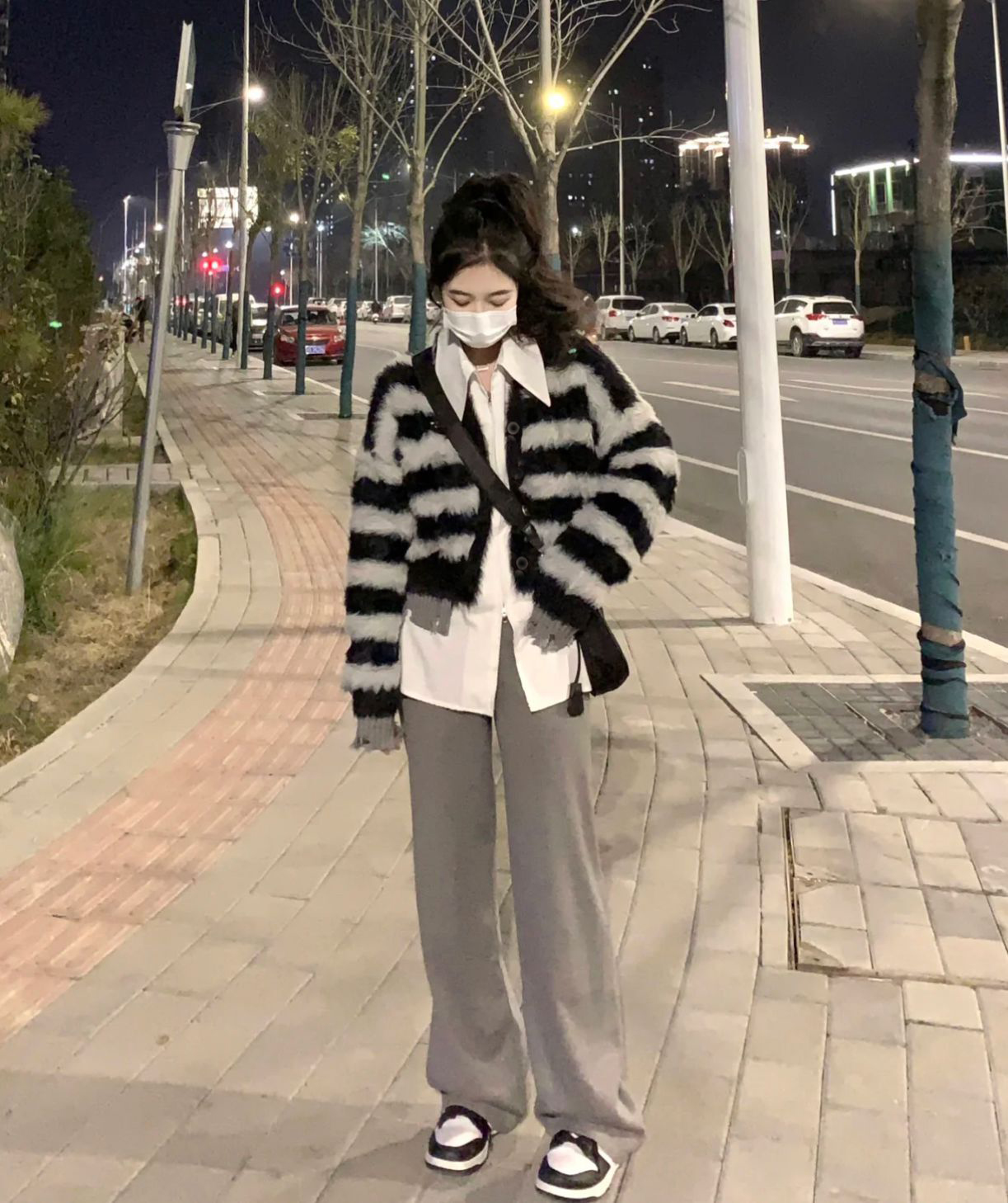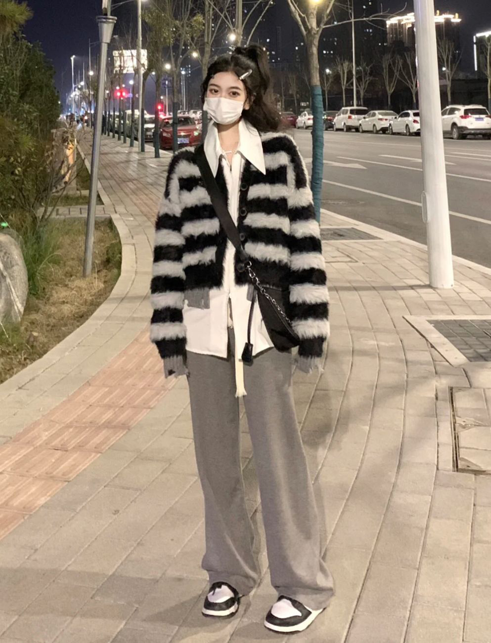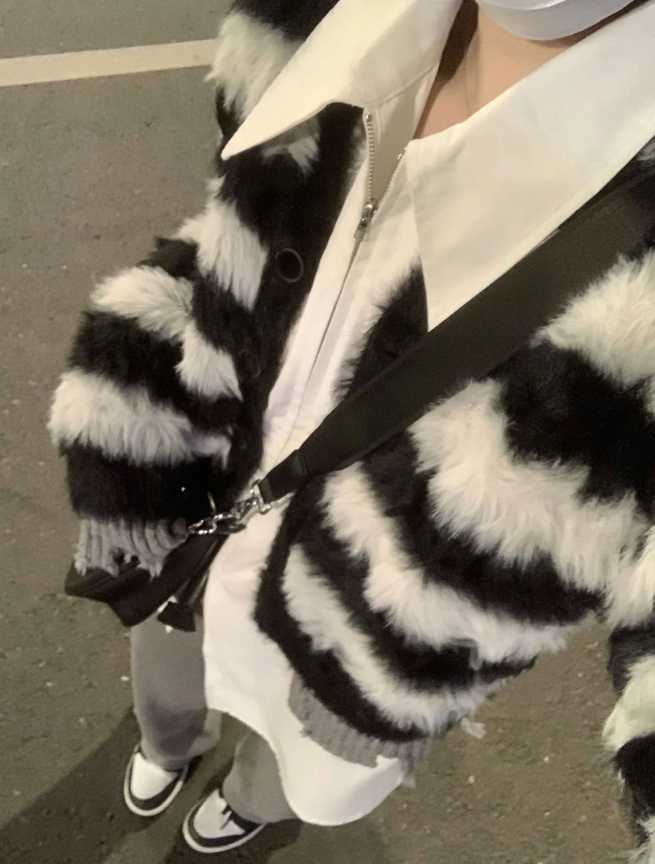 超韓系!馬海毛撞色條紋毛衣開衫女秋季新款韓版高腰短款針織外搭