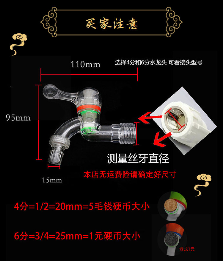 规格 透明单水龙头4分一个装,透明单水龙头4分二个装,透明单水龙头4分三个装,透明单水龙头6分一个装,透明单水龙头6分二个装,透明单水龙头6分三个装,透明三角阀4分一个装,透明三角阀4分二个装,透明三角阀4分三个装,双开龙头4分一个装 带包装,加长单水龙头四分一个装 带包装