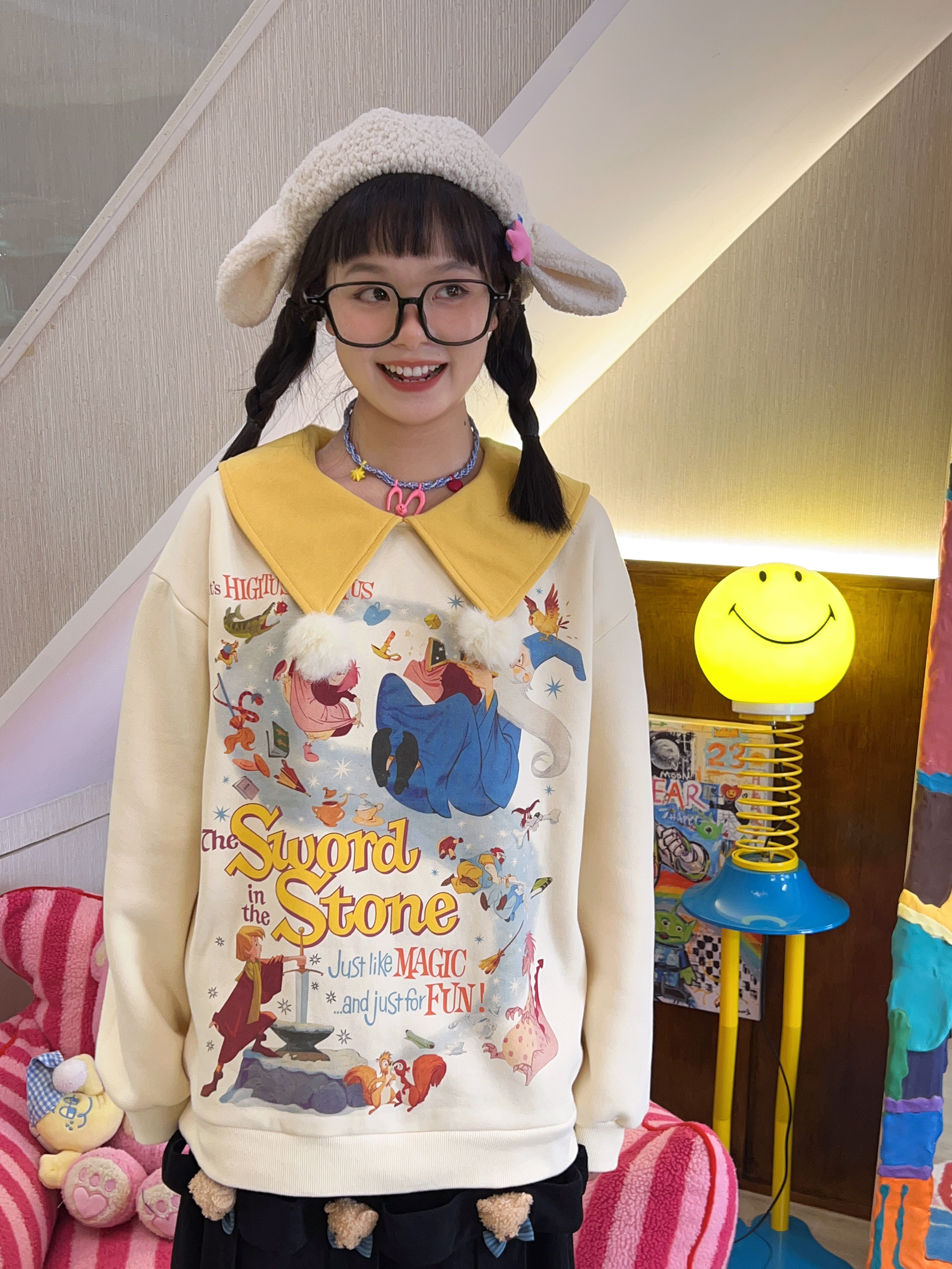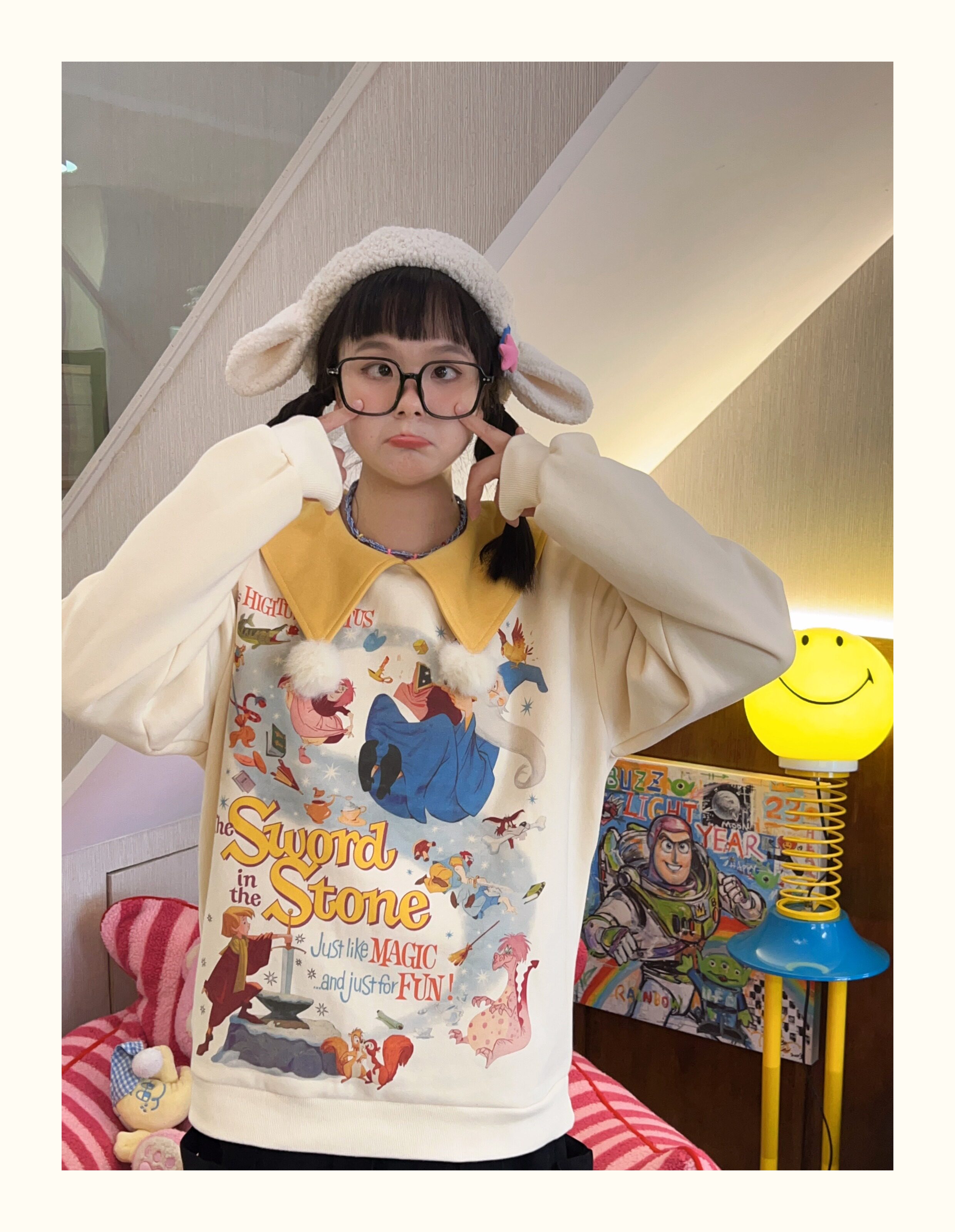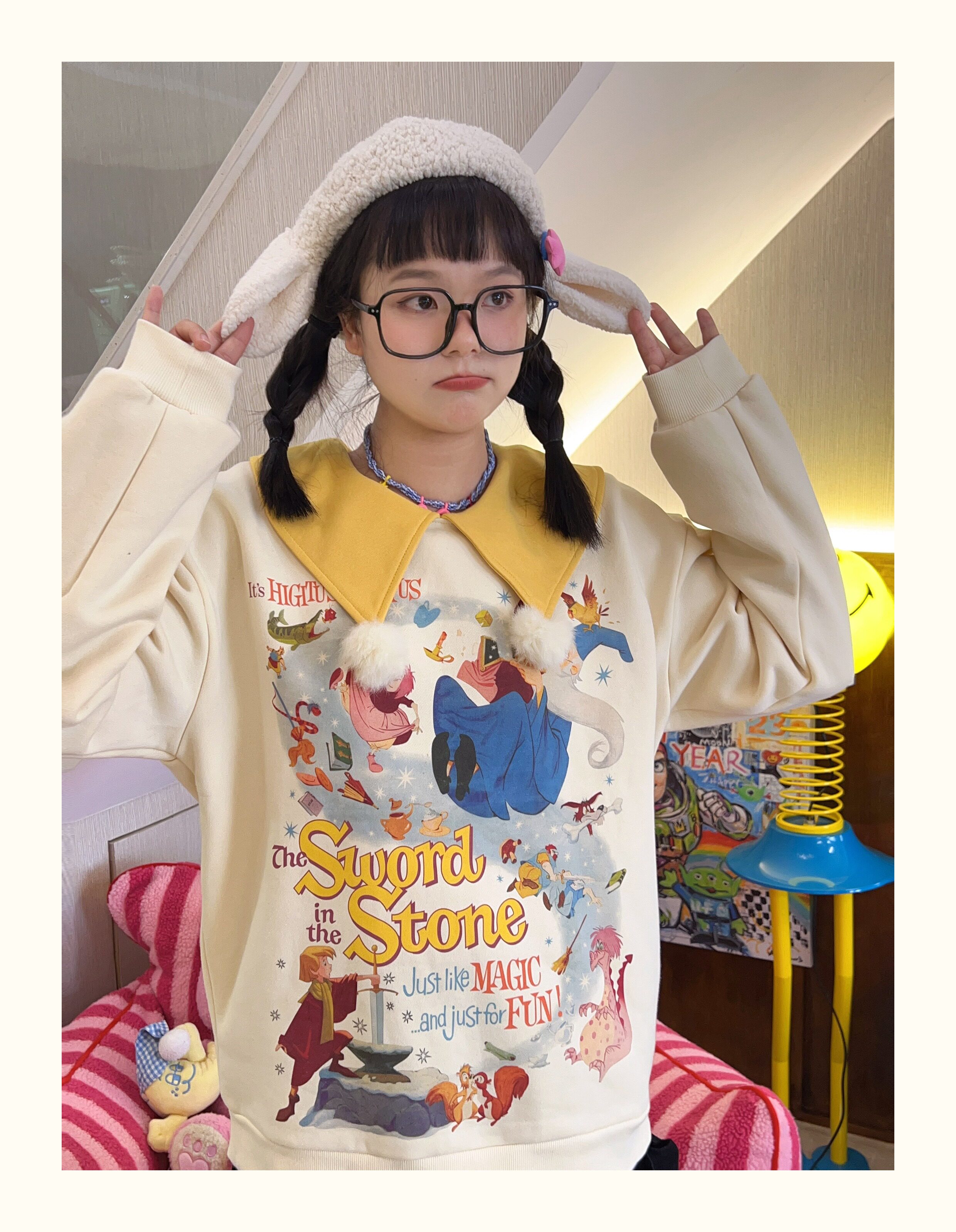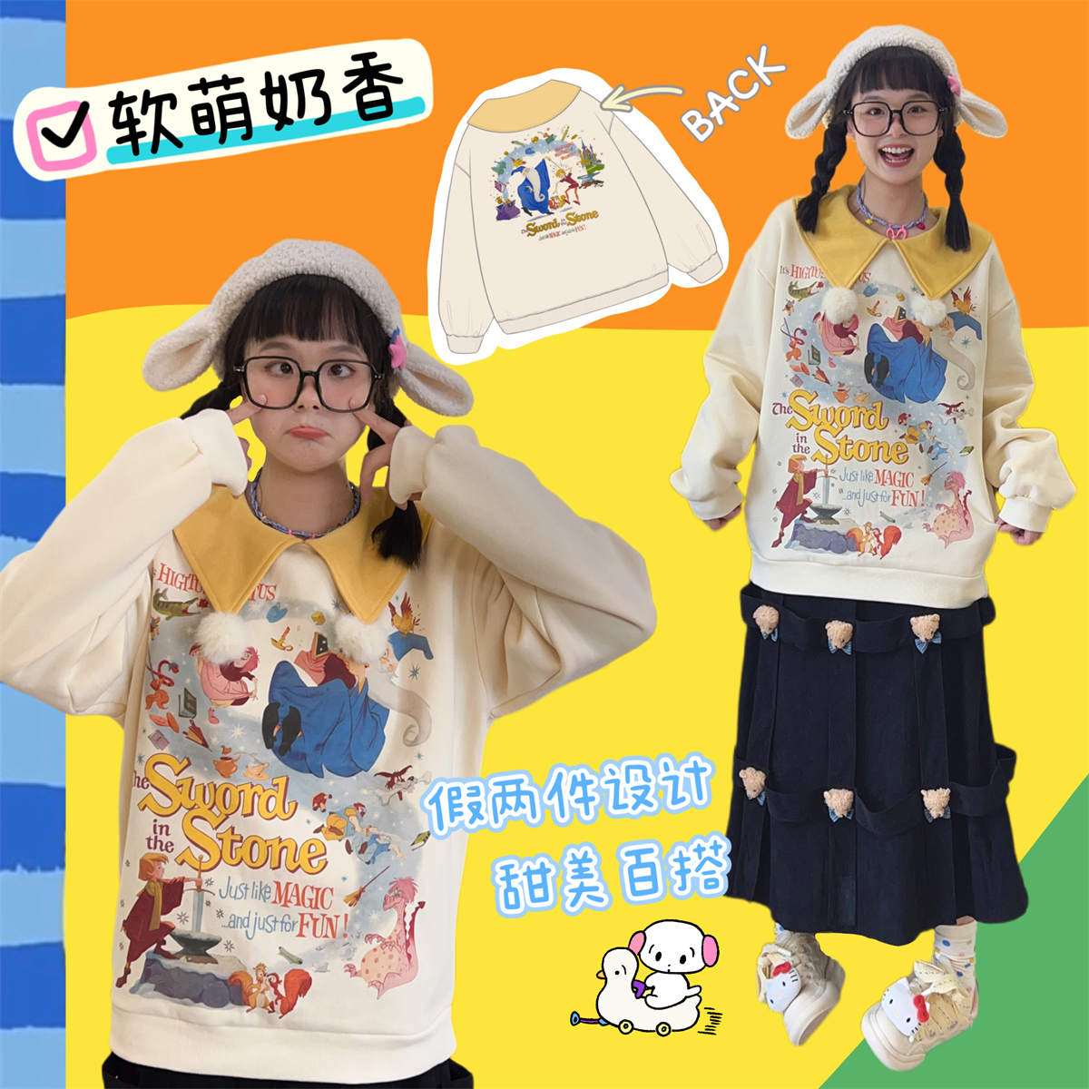 Robootoo原創美式童趣印花翻領小眾可愛減齡套頭加絨衛衣2023秋冬
