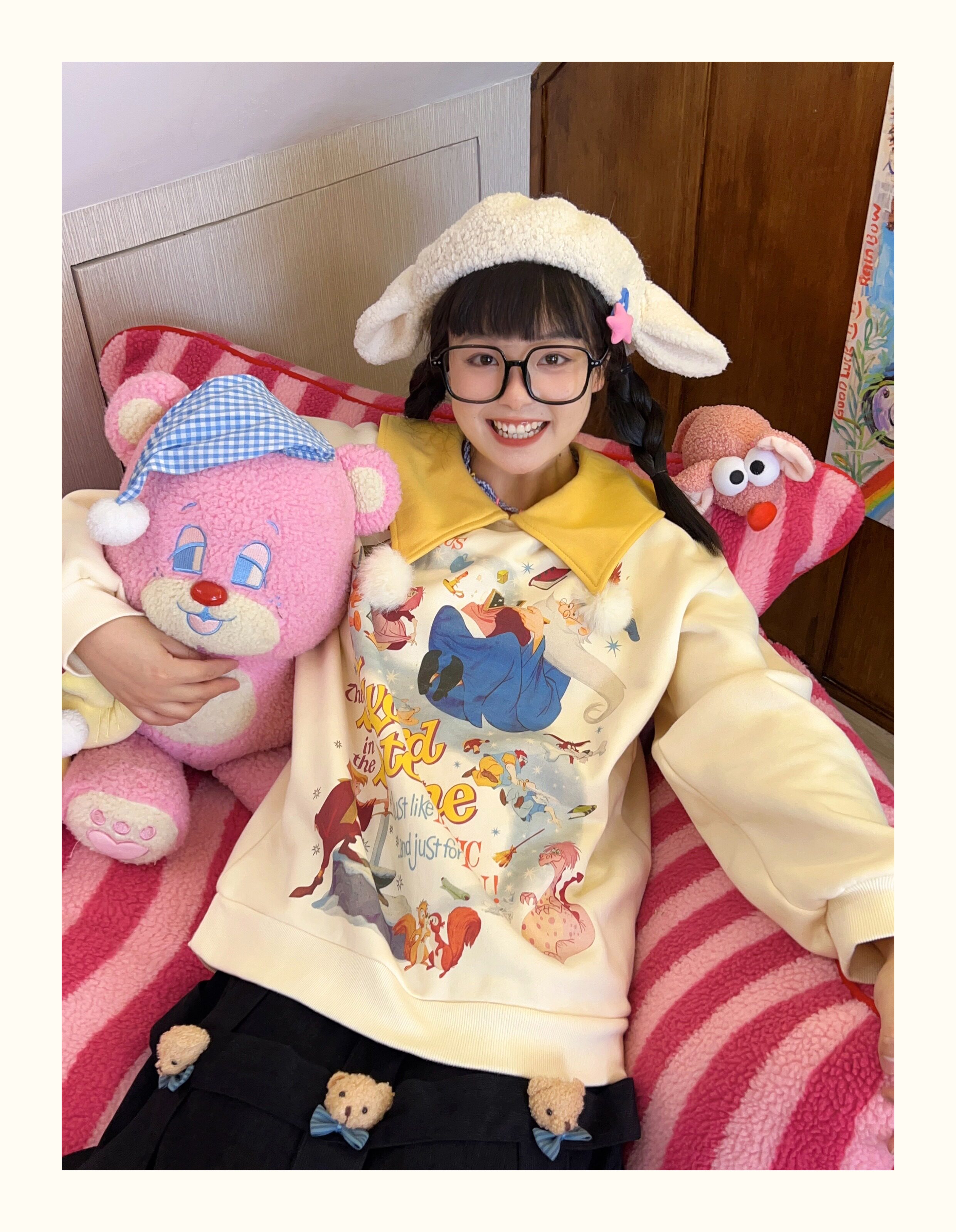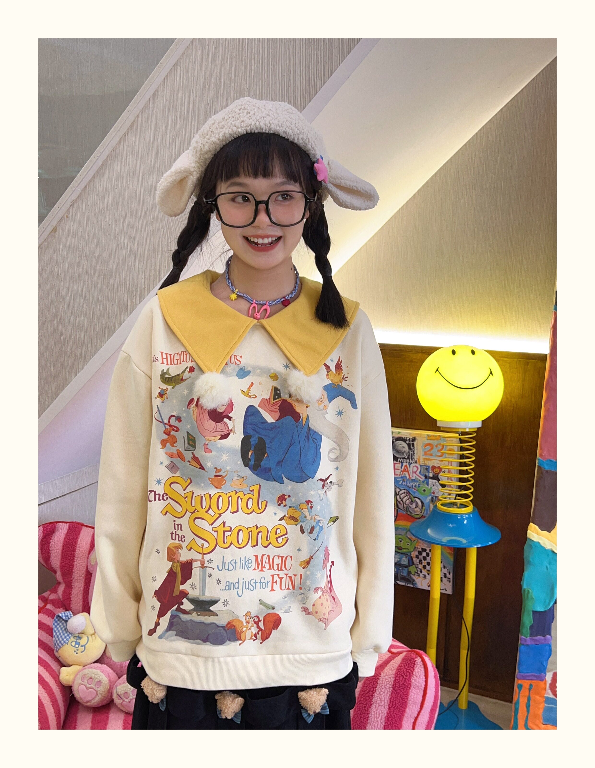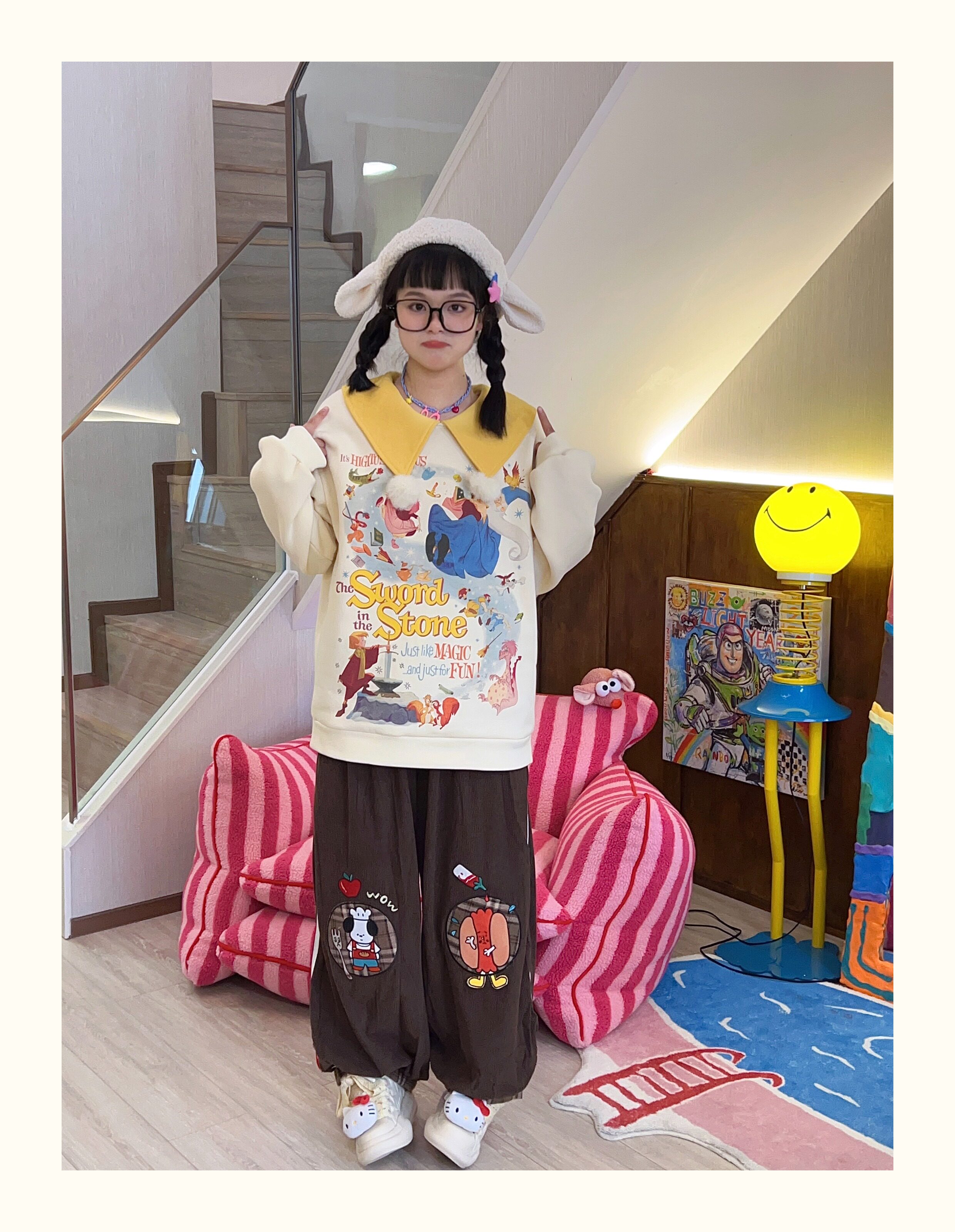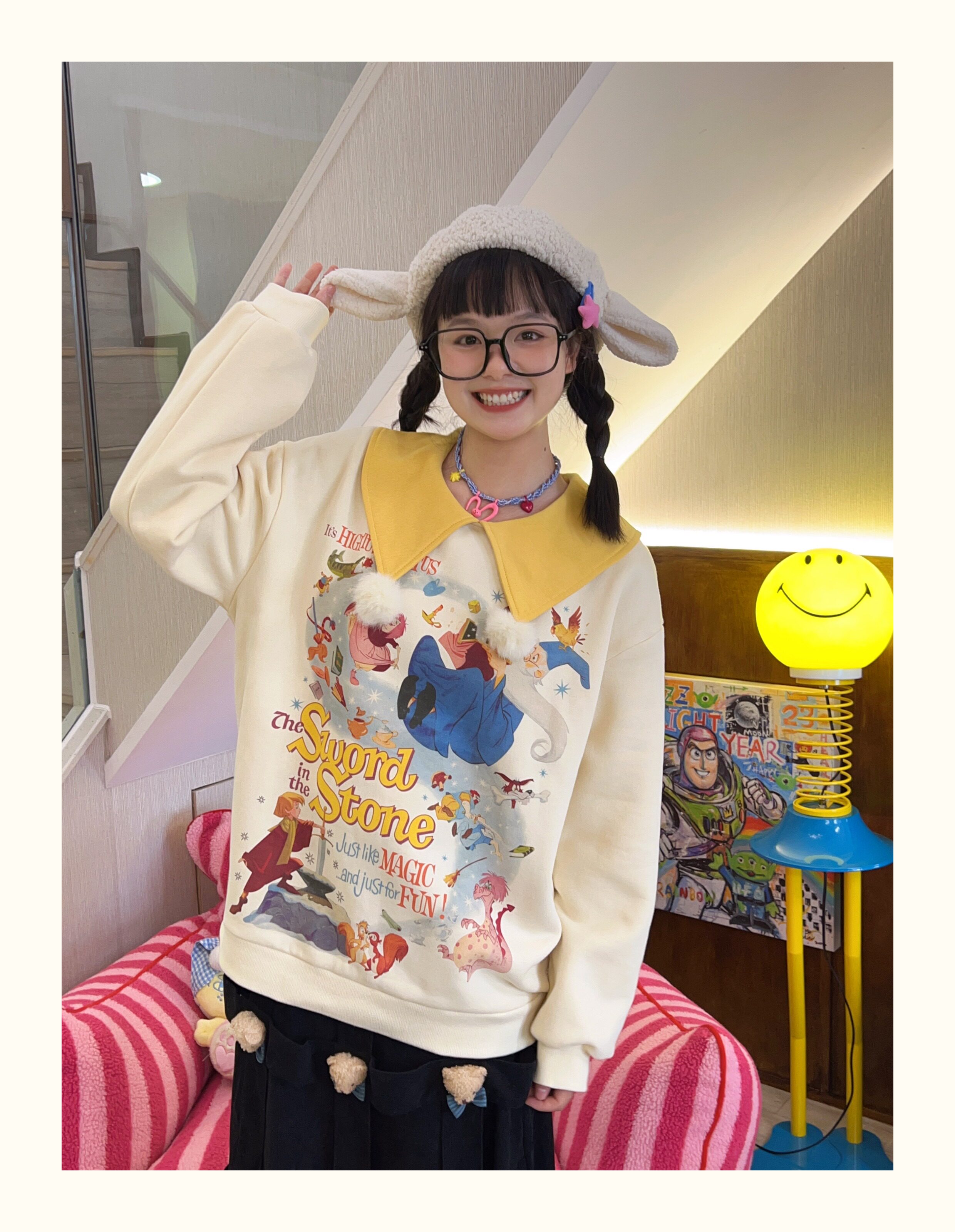 Robootoo原創美式童趣印花翻領小眾可愛減齡套頭加絨衛衣2023秋冬