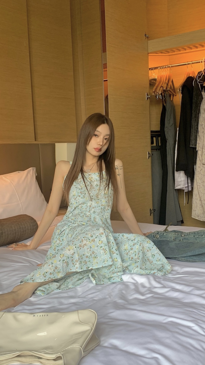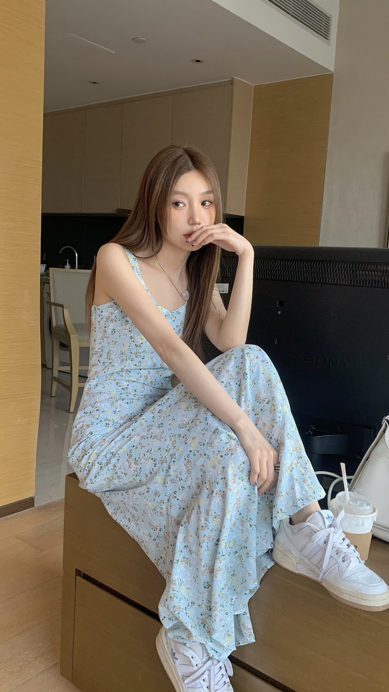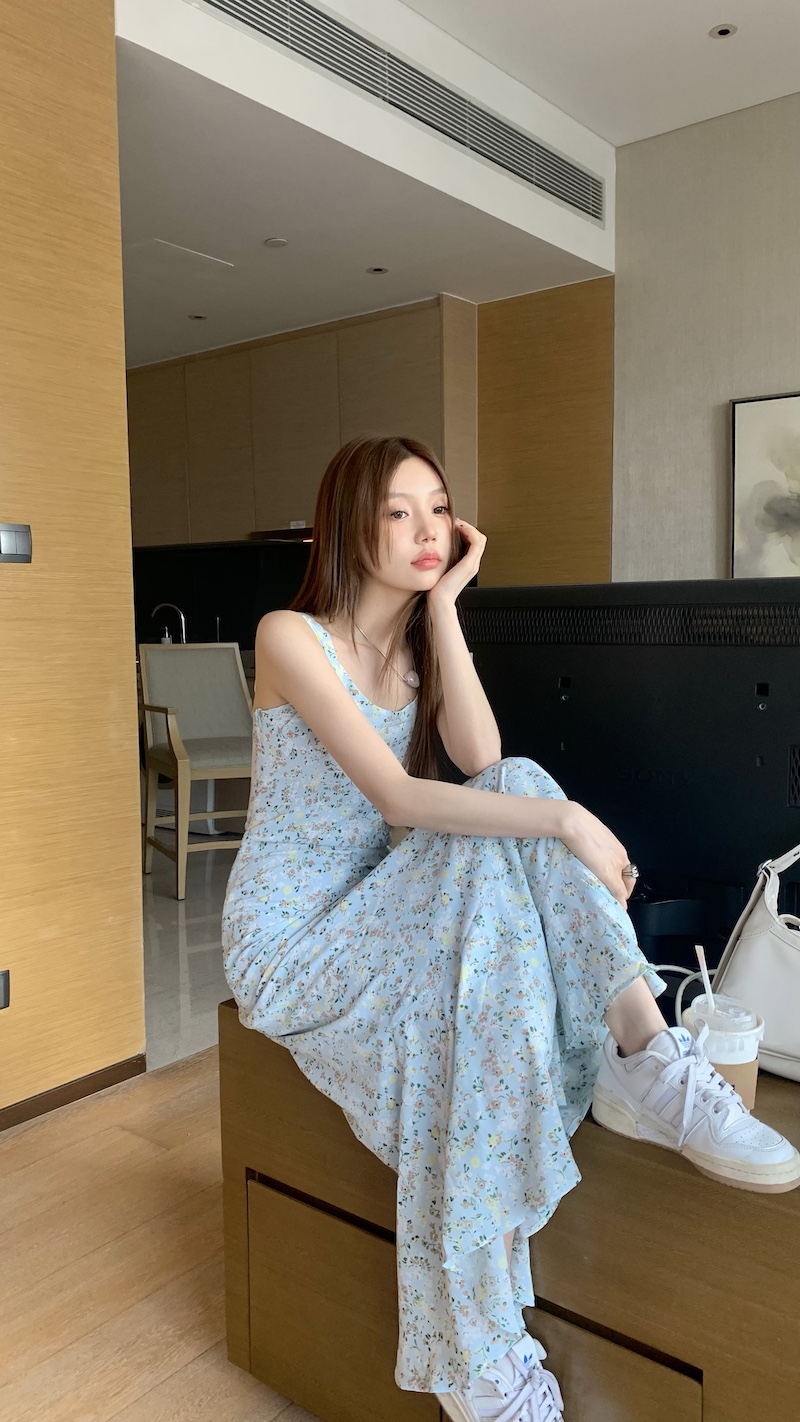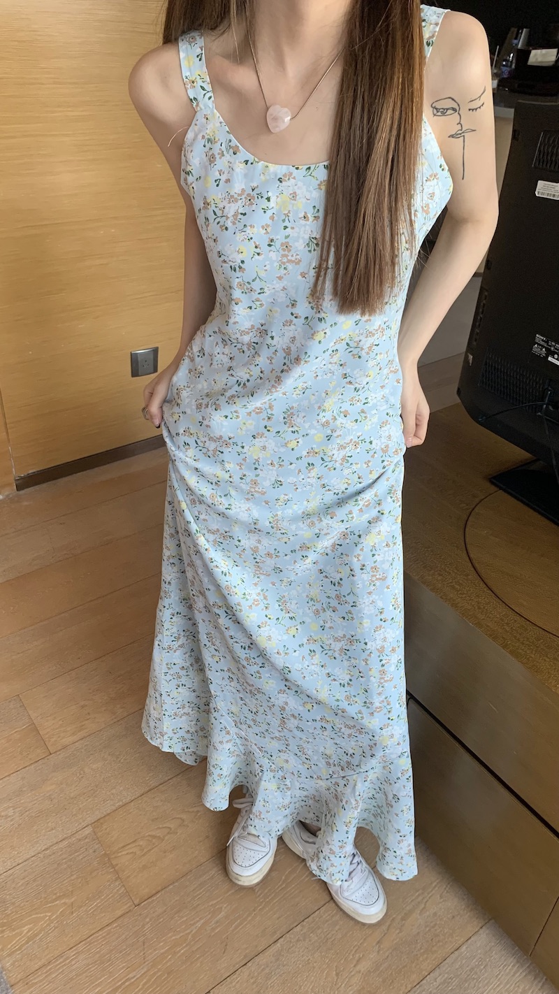 PPHOME甜柔安妮~修身顯瘦中長版小碎花雪紡洋裝女打底背心裙子