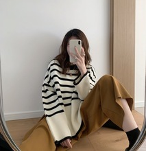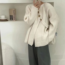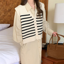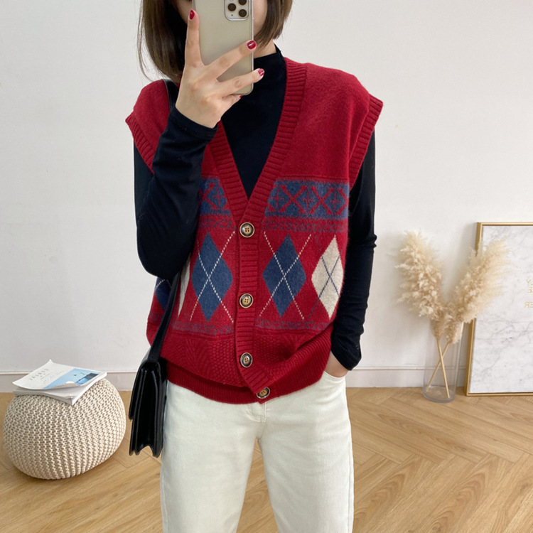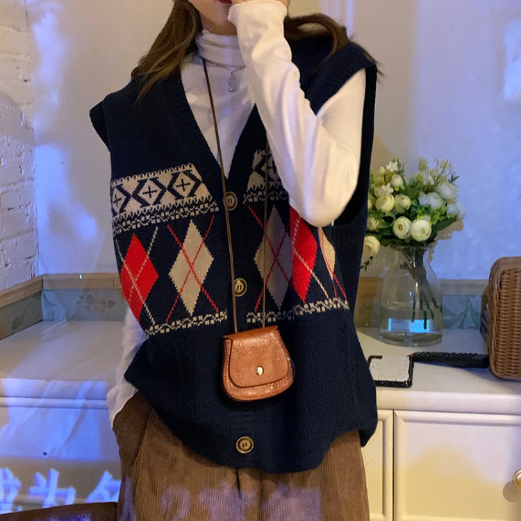 秋季新款复古撞色菱格针织开衫V领毛衣宽松女士坎肩背心马甲女