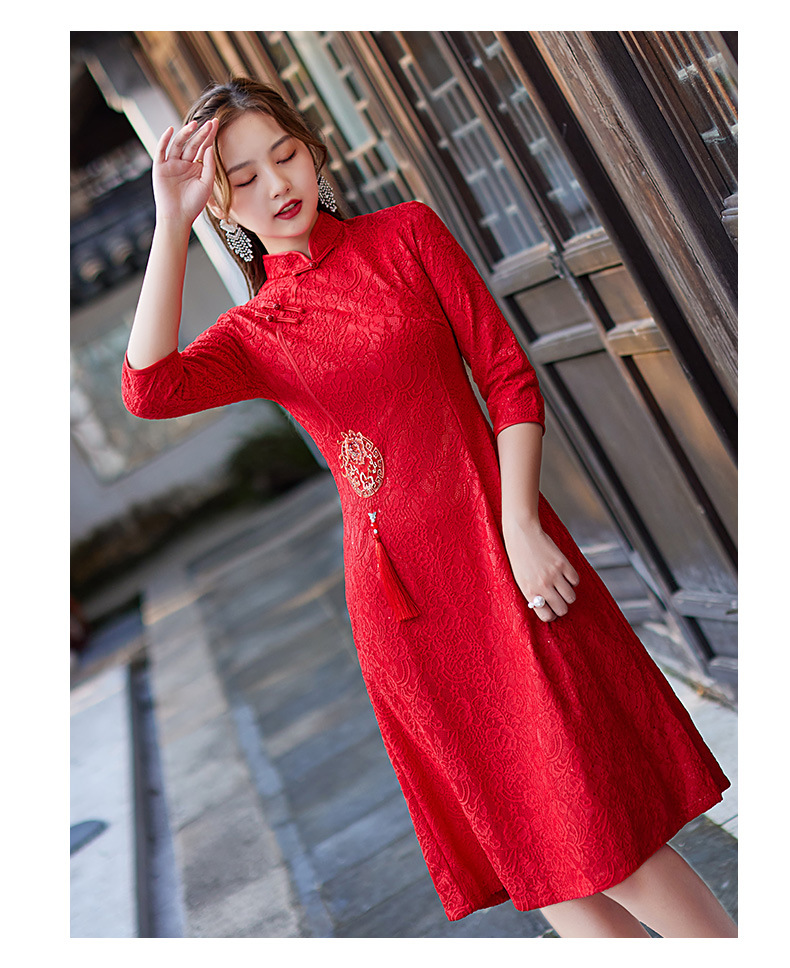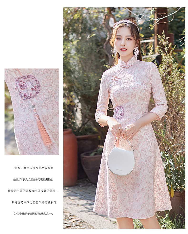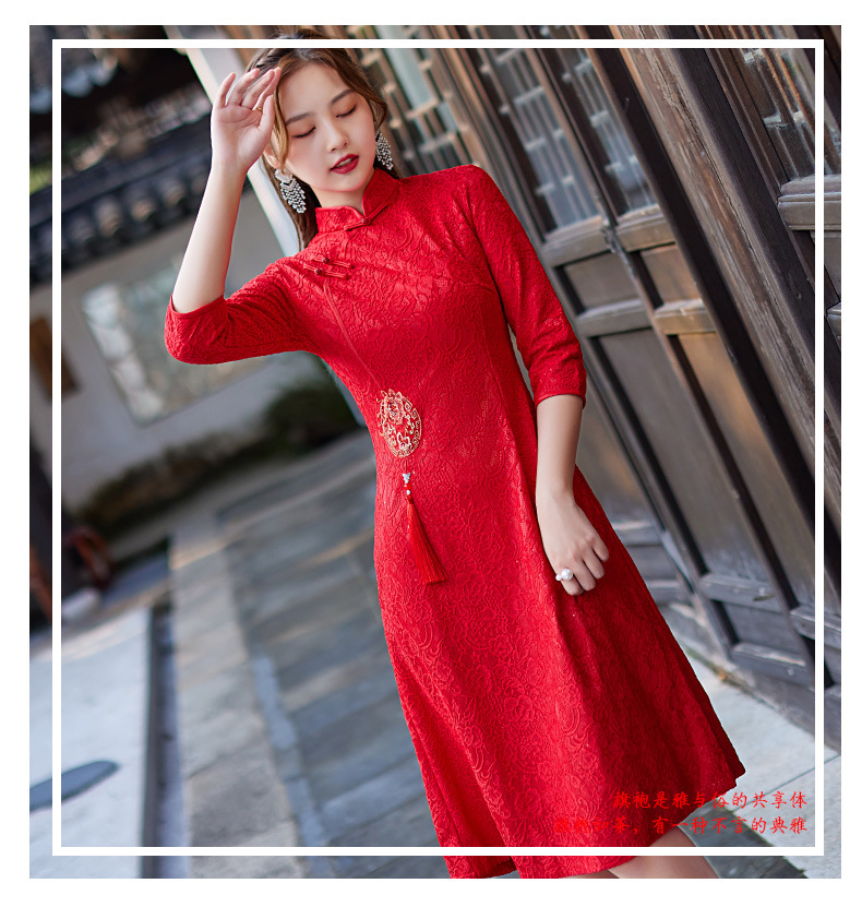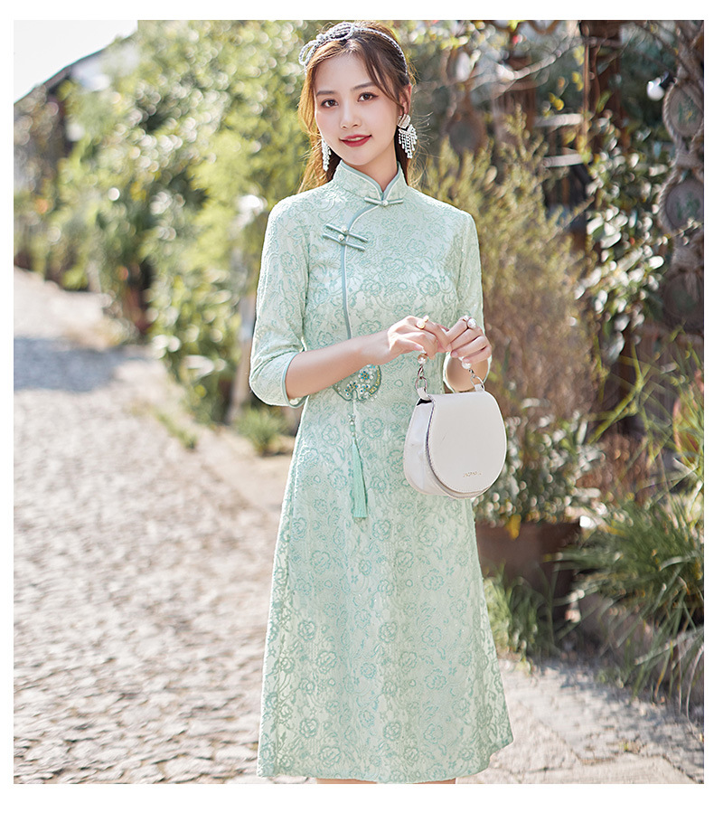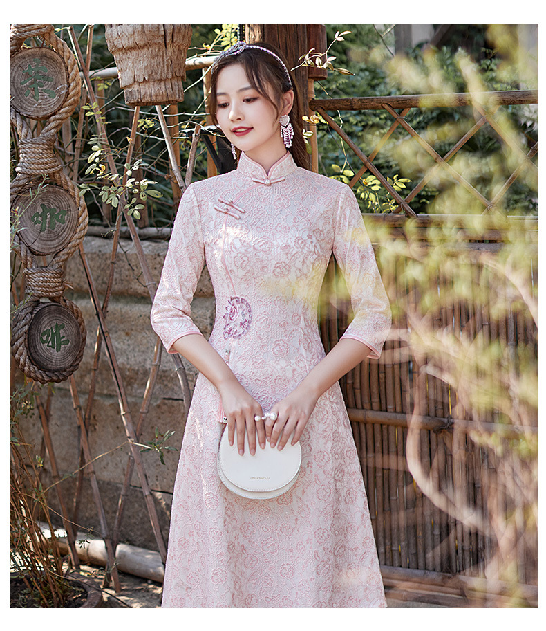 蕾丝中长款日常旗袍2023新款秋冬装七分袖改良A摆中国风连衣裙