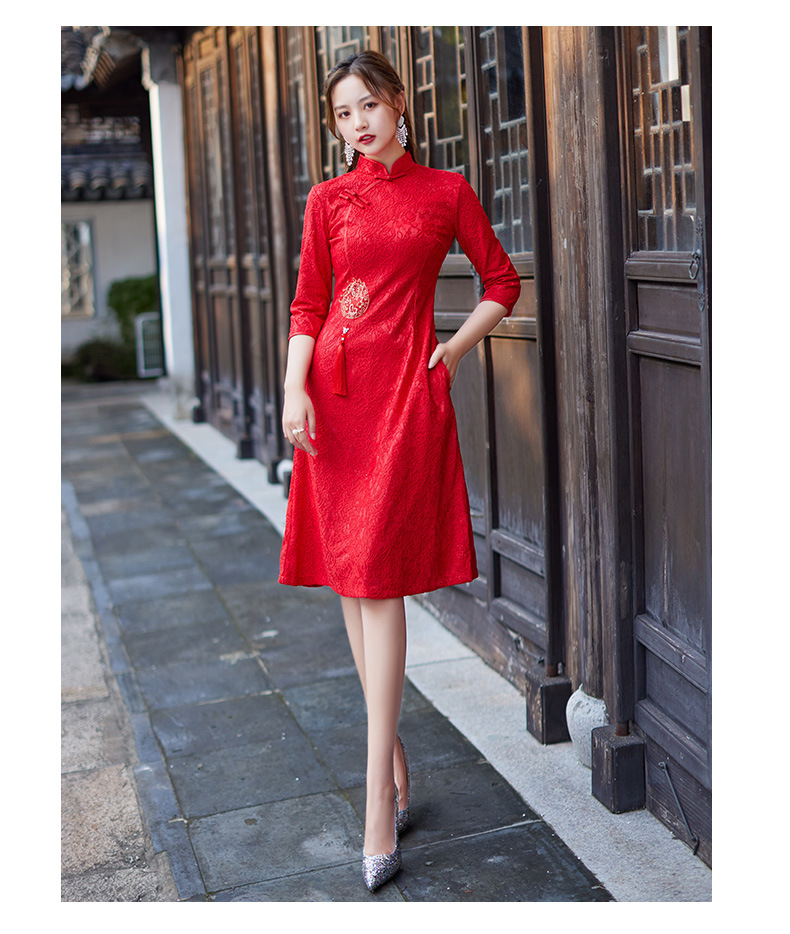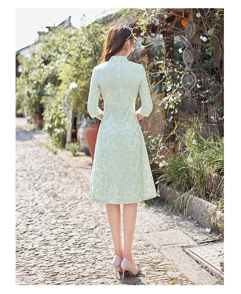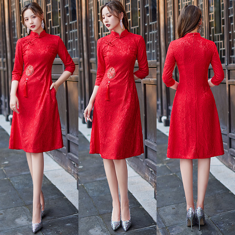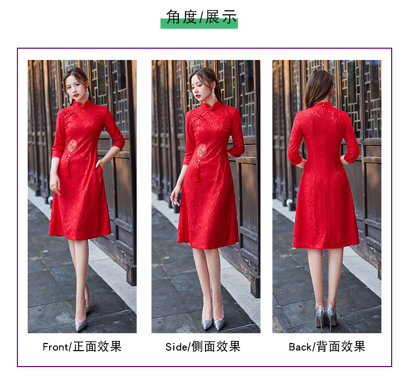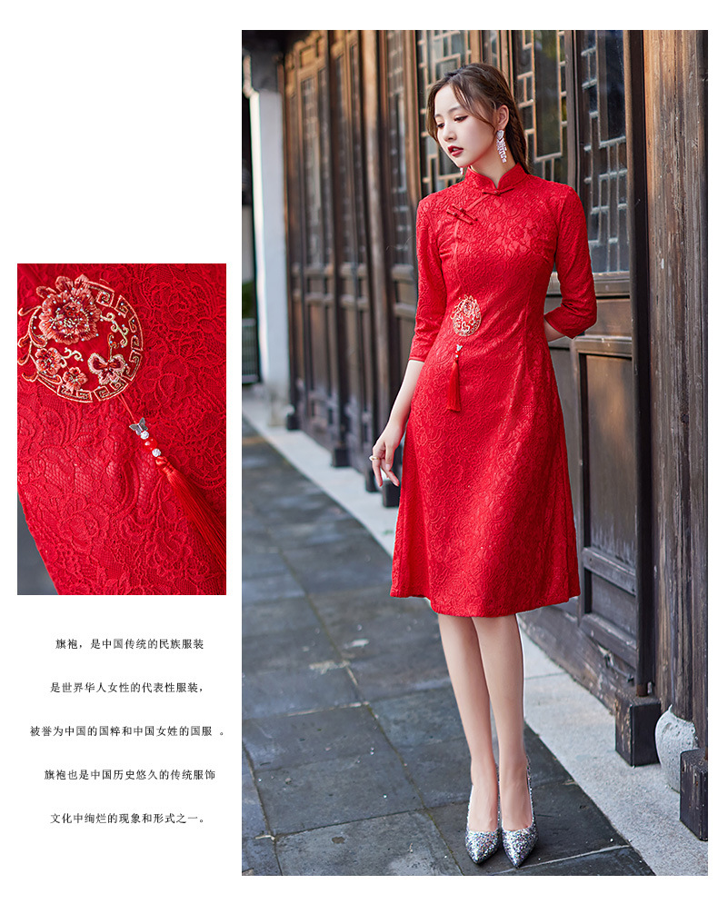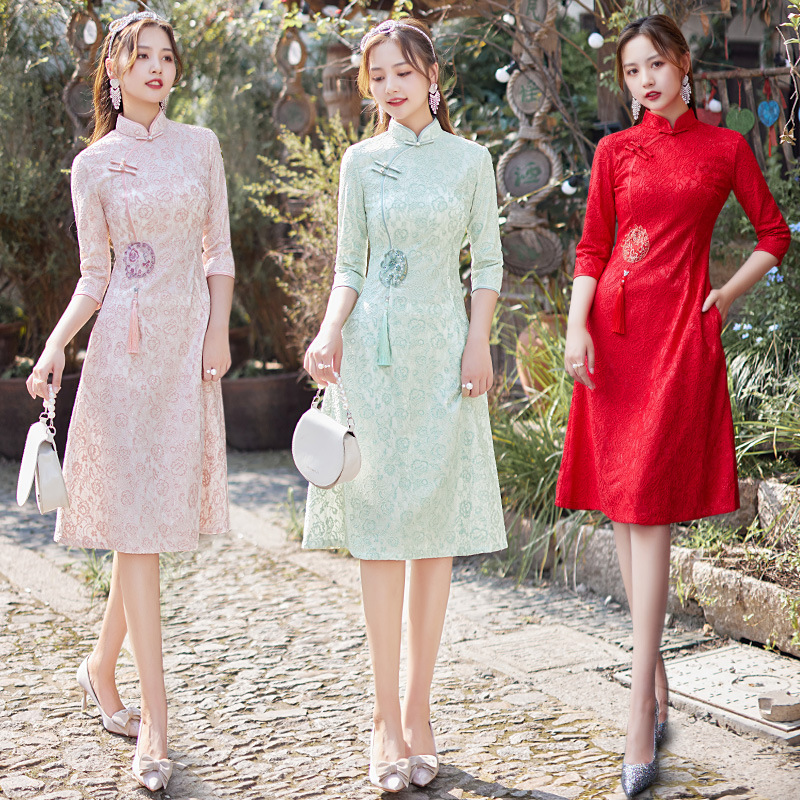 蕾丝中长款日常旗袍2023新款秋冬装七分袖改良A摆中国风连衣裙
