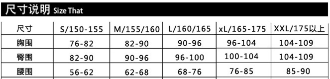 尺码 S码145~155,M码156~162,L码163~168,XL码168~172,XXL码173~180