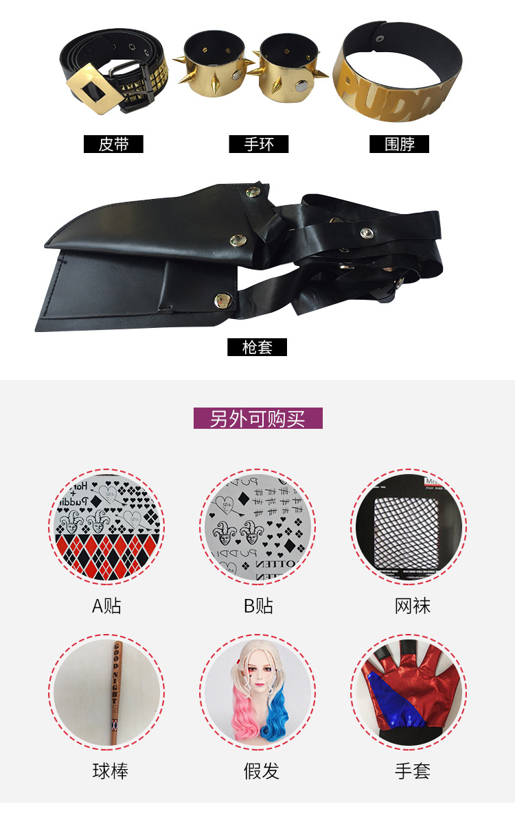 颜色 绣花外套T恤平短裤手套,绣花外套T恤三角裤手套,绣花外套,印花T恤,破洞T恤,平角短裤,三角短裤,小丑女假发,小丑女棒子,小丑女配件4件套,小丑女皮带,小丑女抢套,小丑女手环一对,小丑女白色围脖,小丑女黄围脖,小丑女网袜,小丑女A贴,小丑女B贴,小丑女手套一只,小丑女鞋子订做拍下备注尺码
