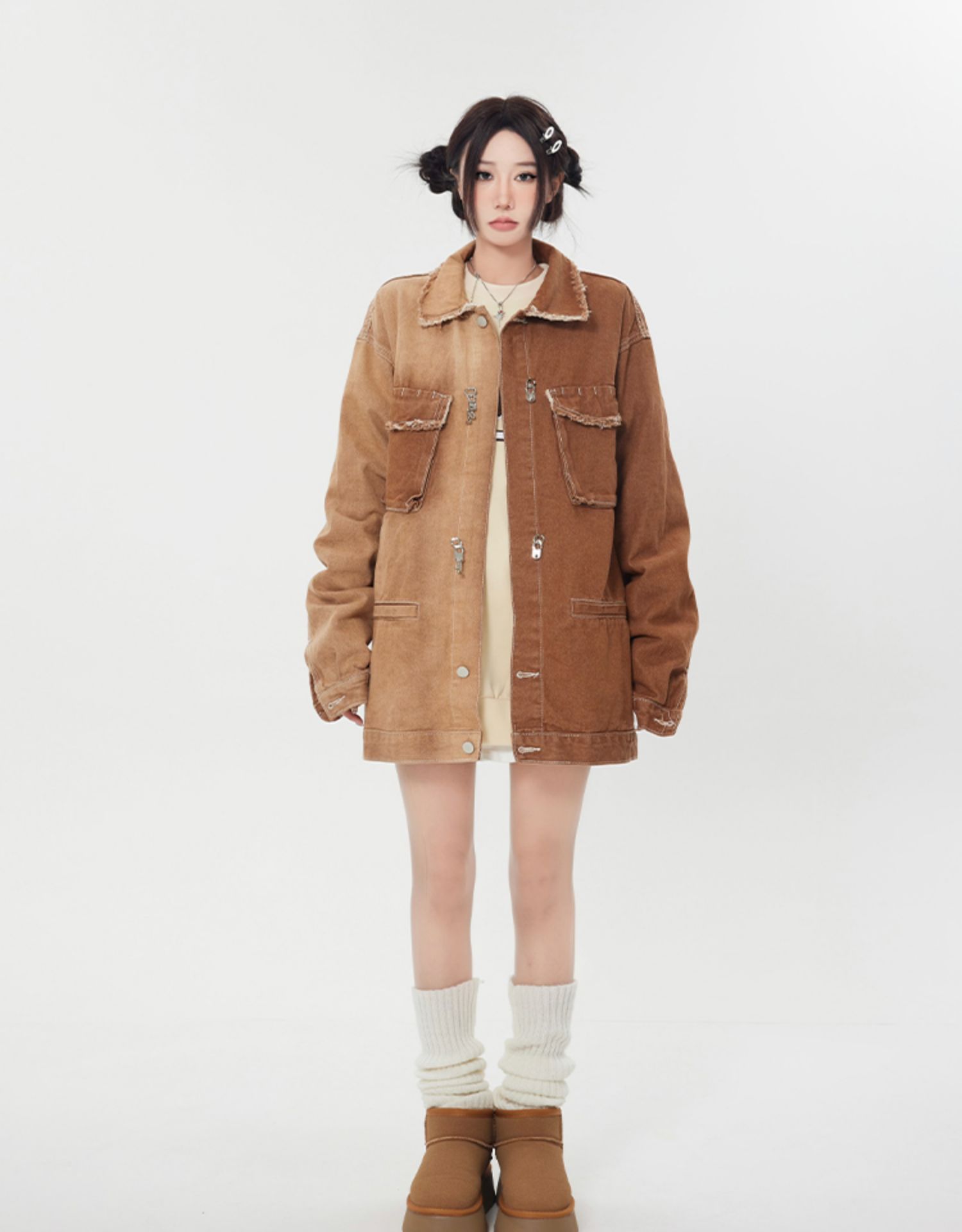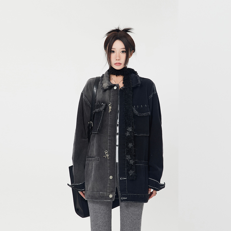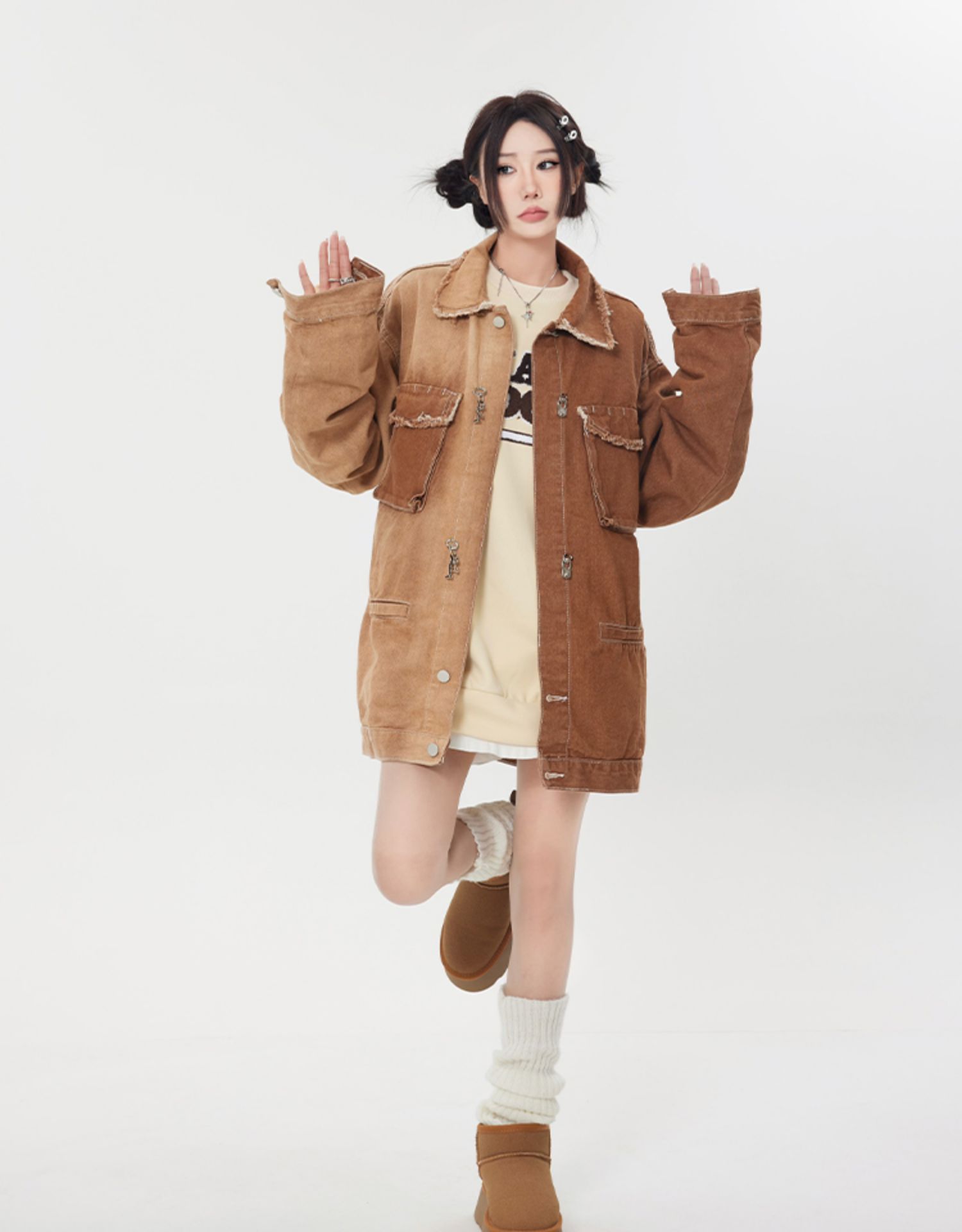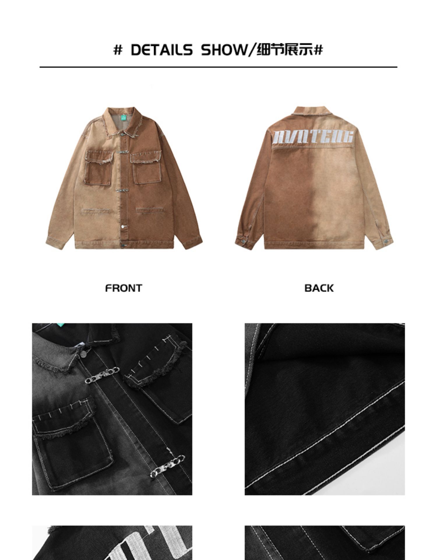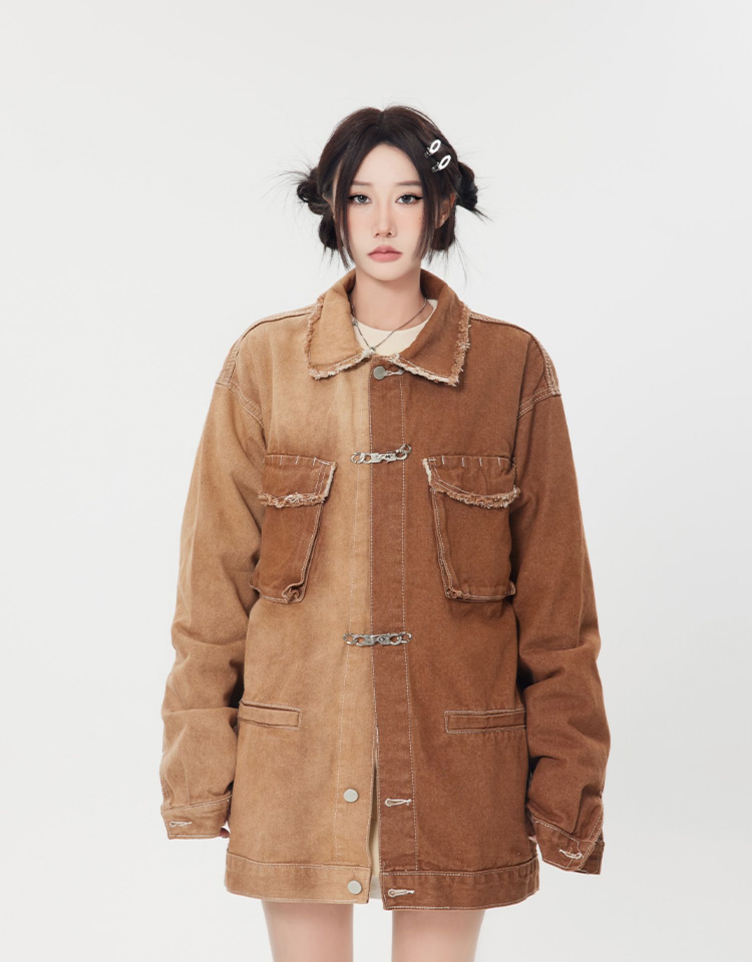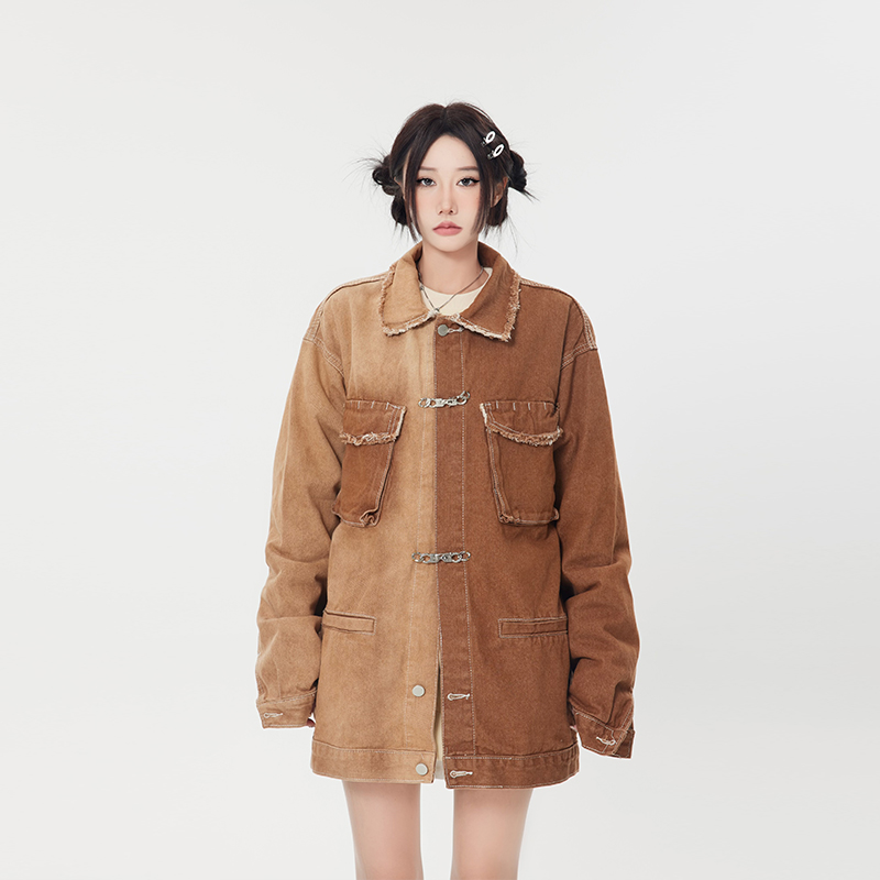 ZHL STUDIO美式復古拼色水洗毛邊牛仔外套女春季新款休閒情侶夾克