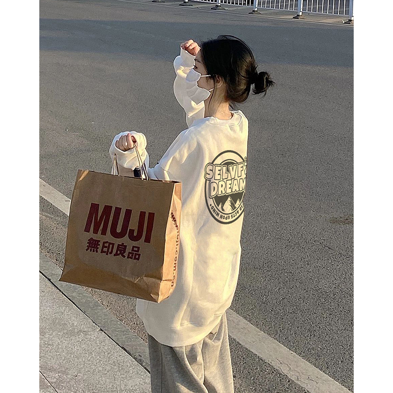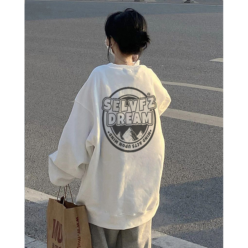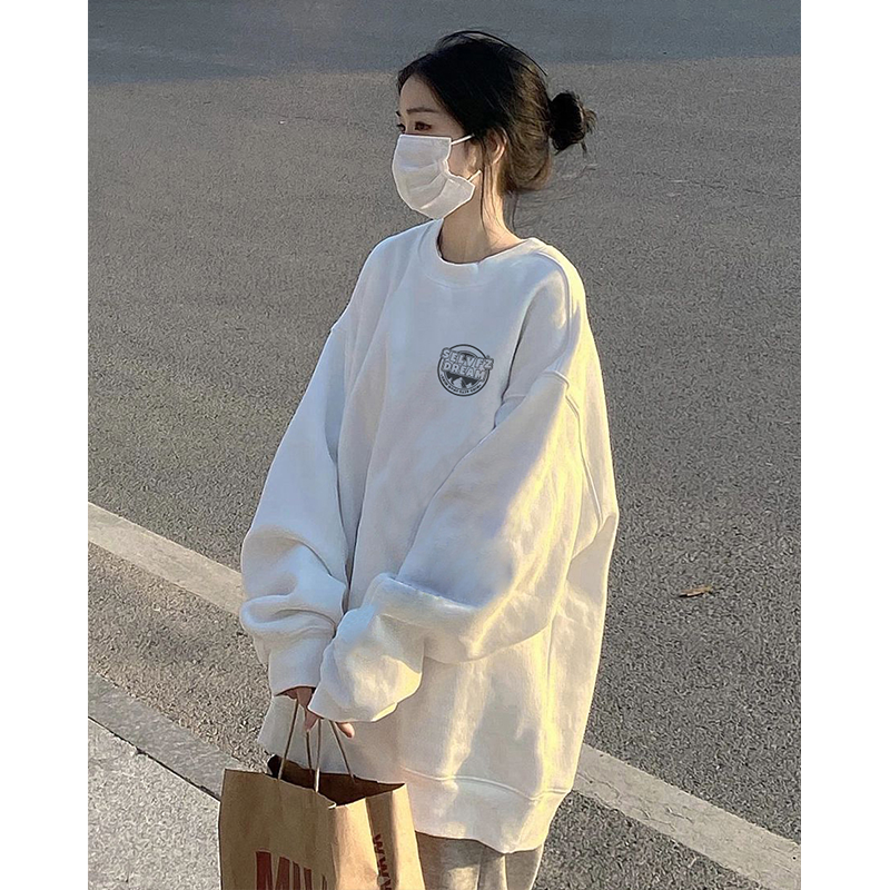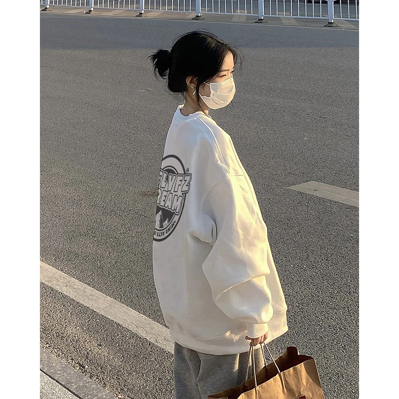 美式復古無帽衛衣女春秋款寬鬆bf慵懶風加絨加厚中長版圓領上衣潮