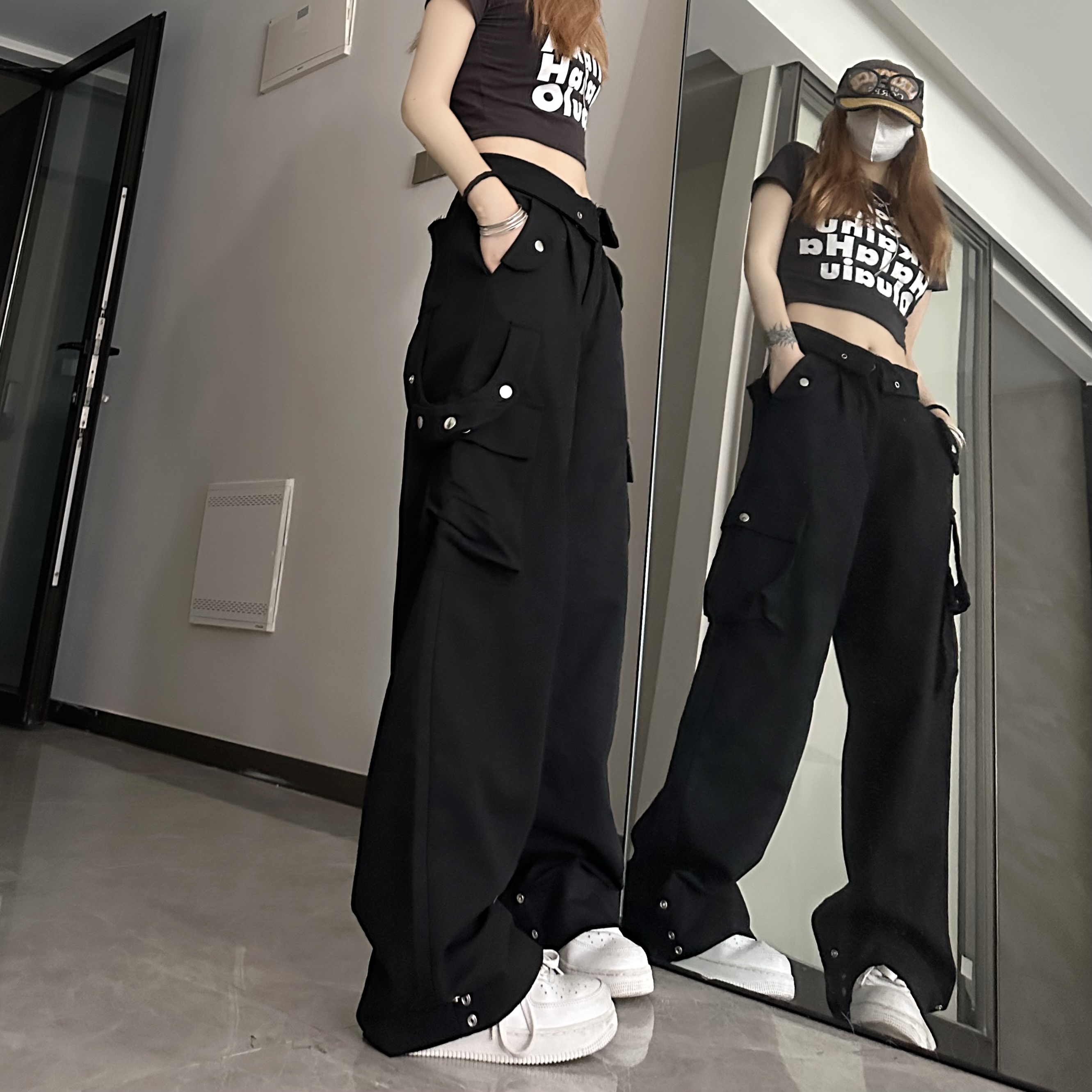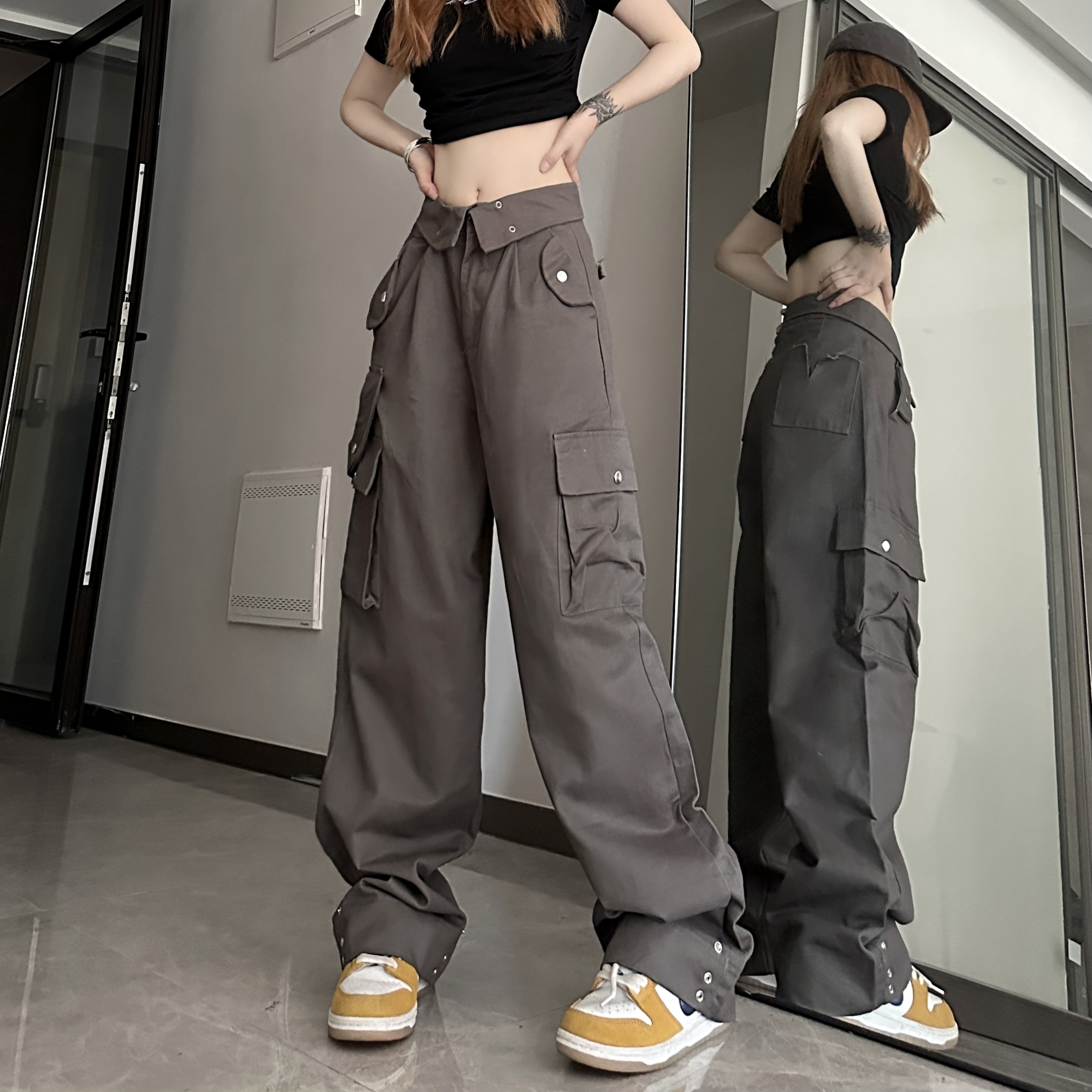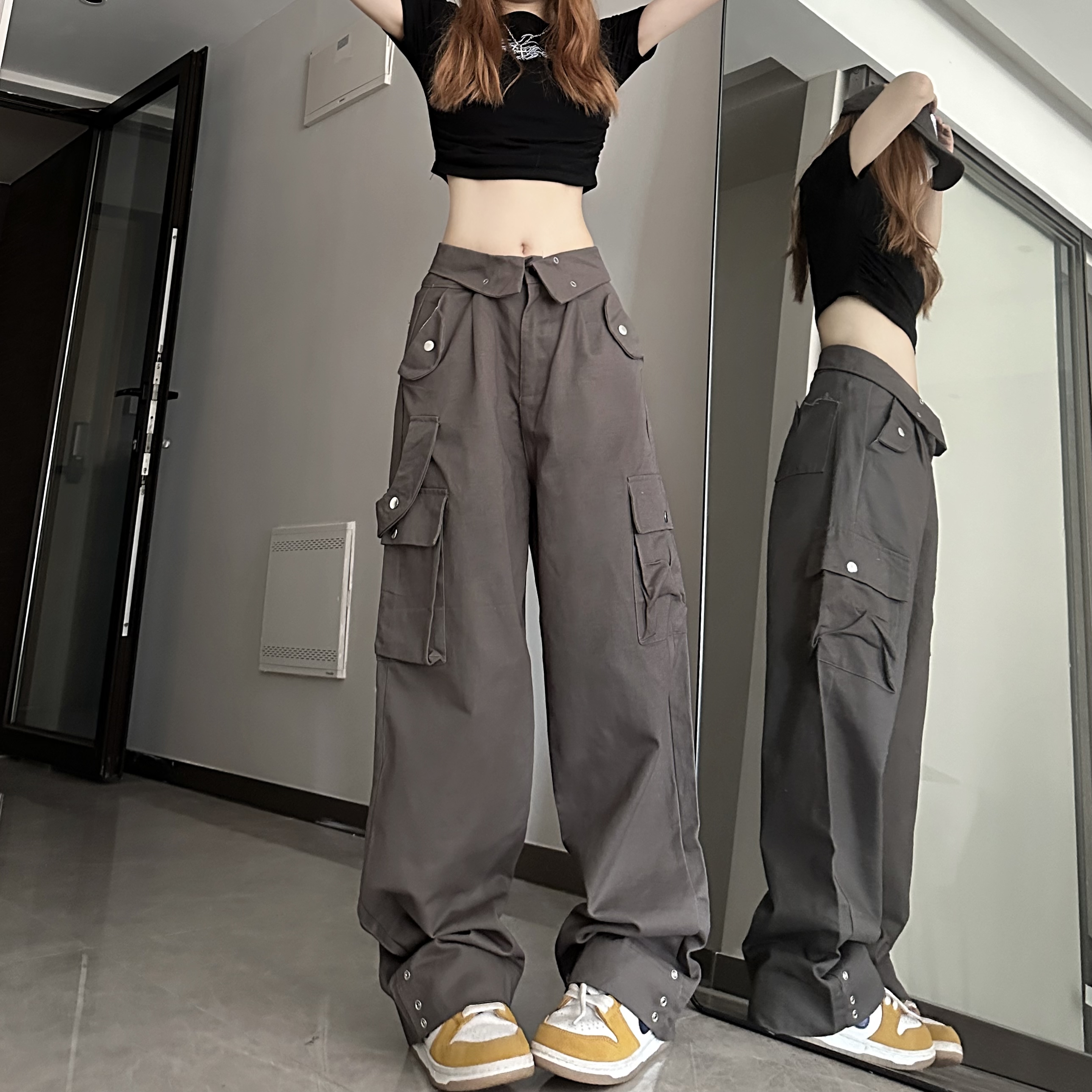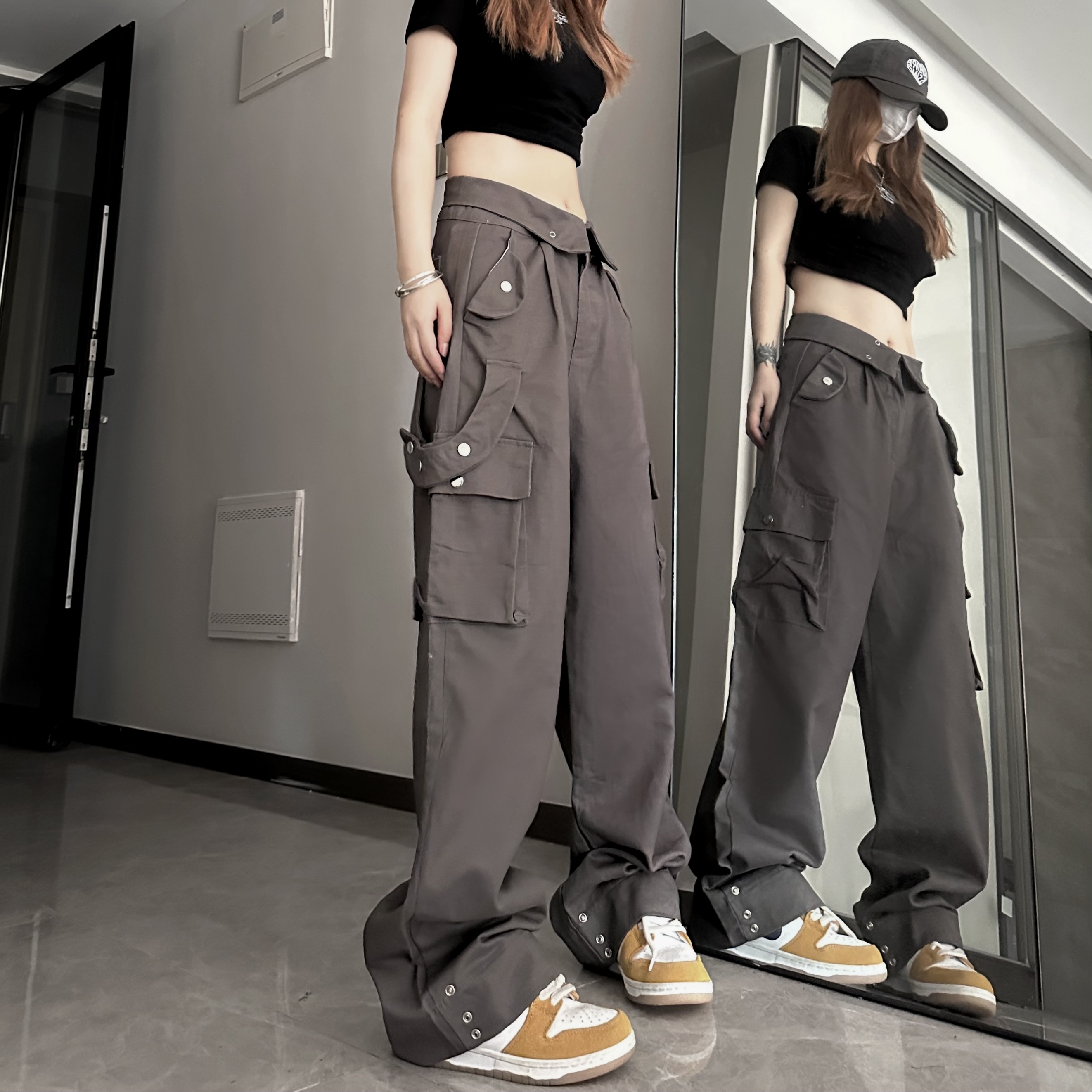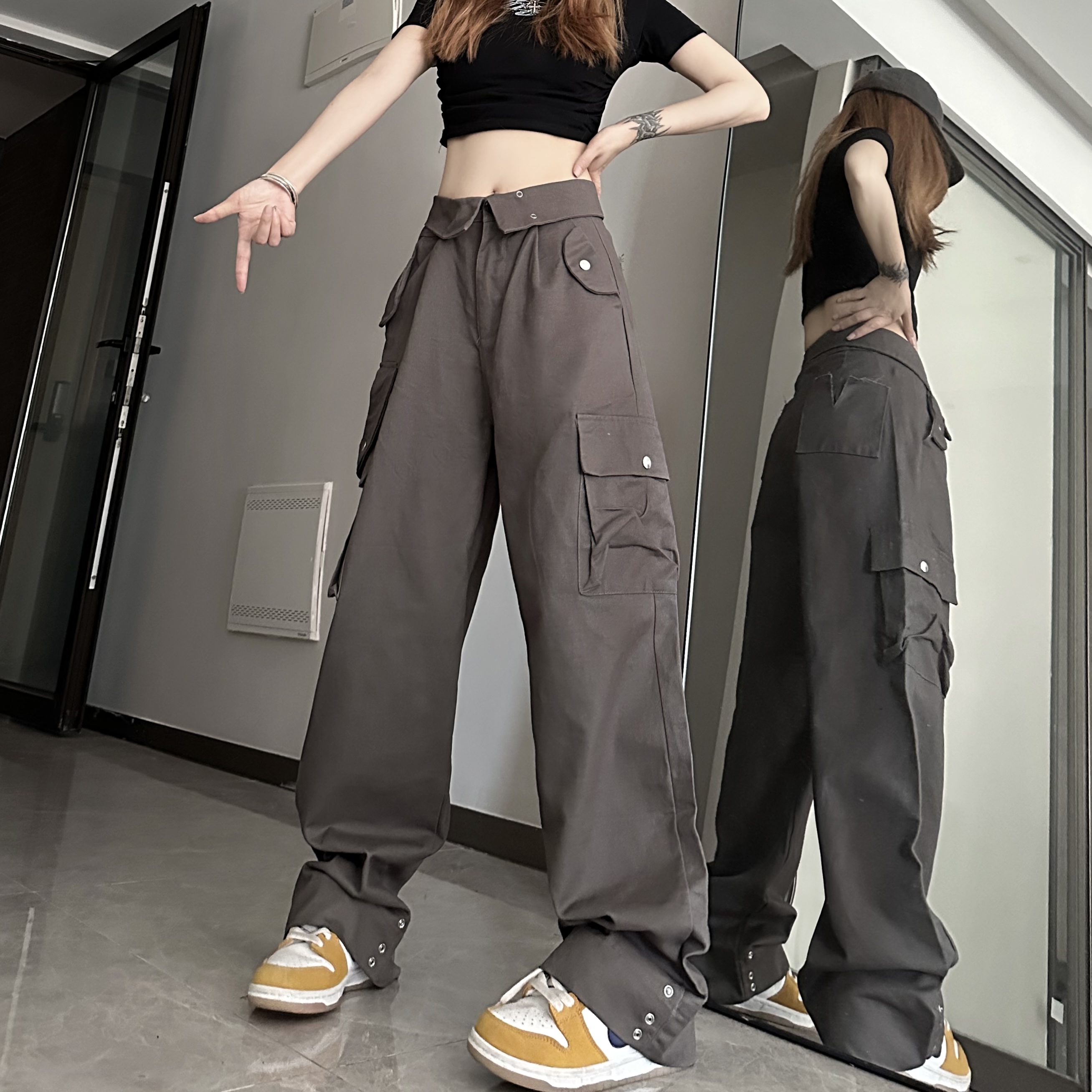 媽個雞媽 ins潮流夏季翻蓋腰頭美式工裝褲寬鬆直筒褲子男女休閒褲