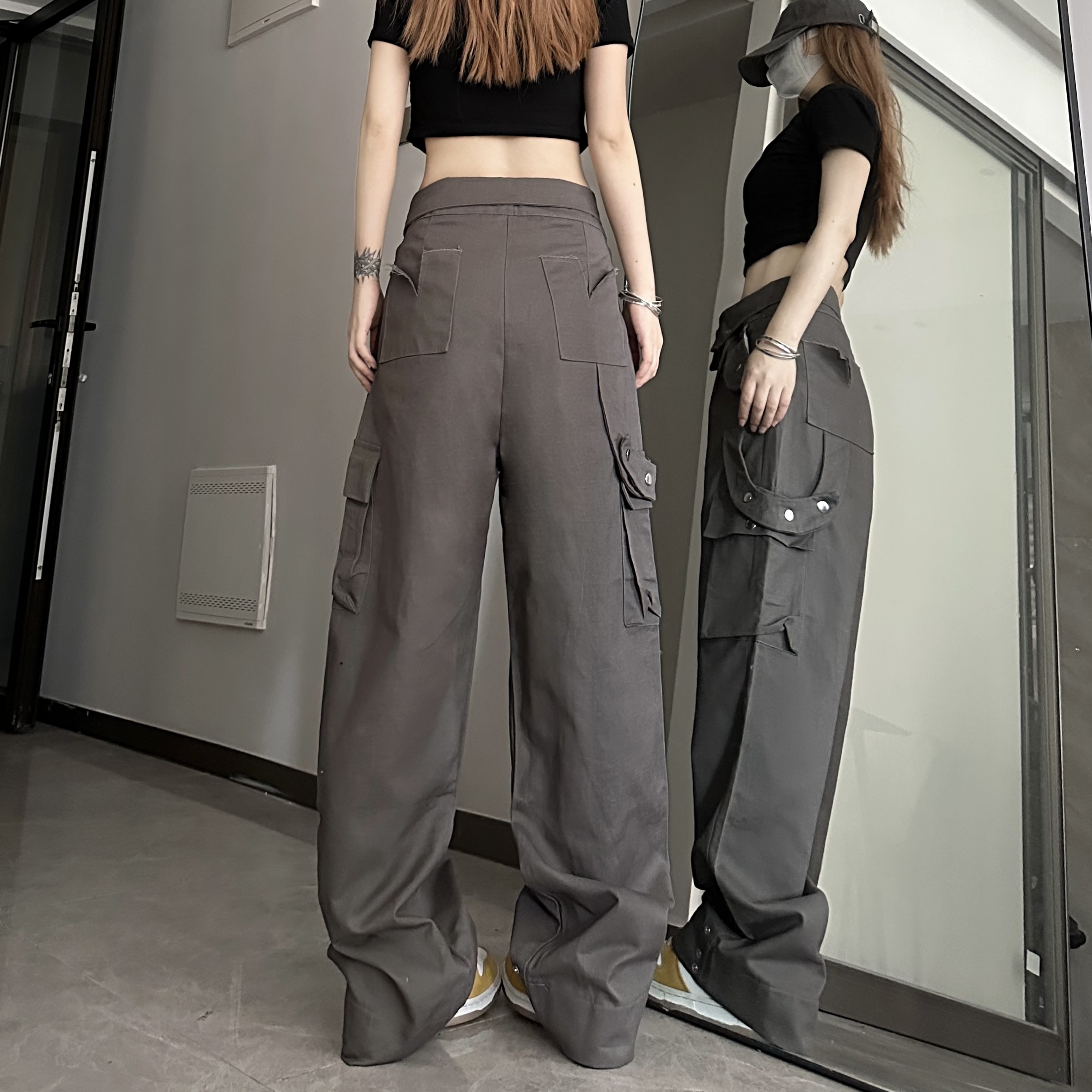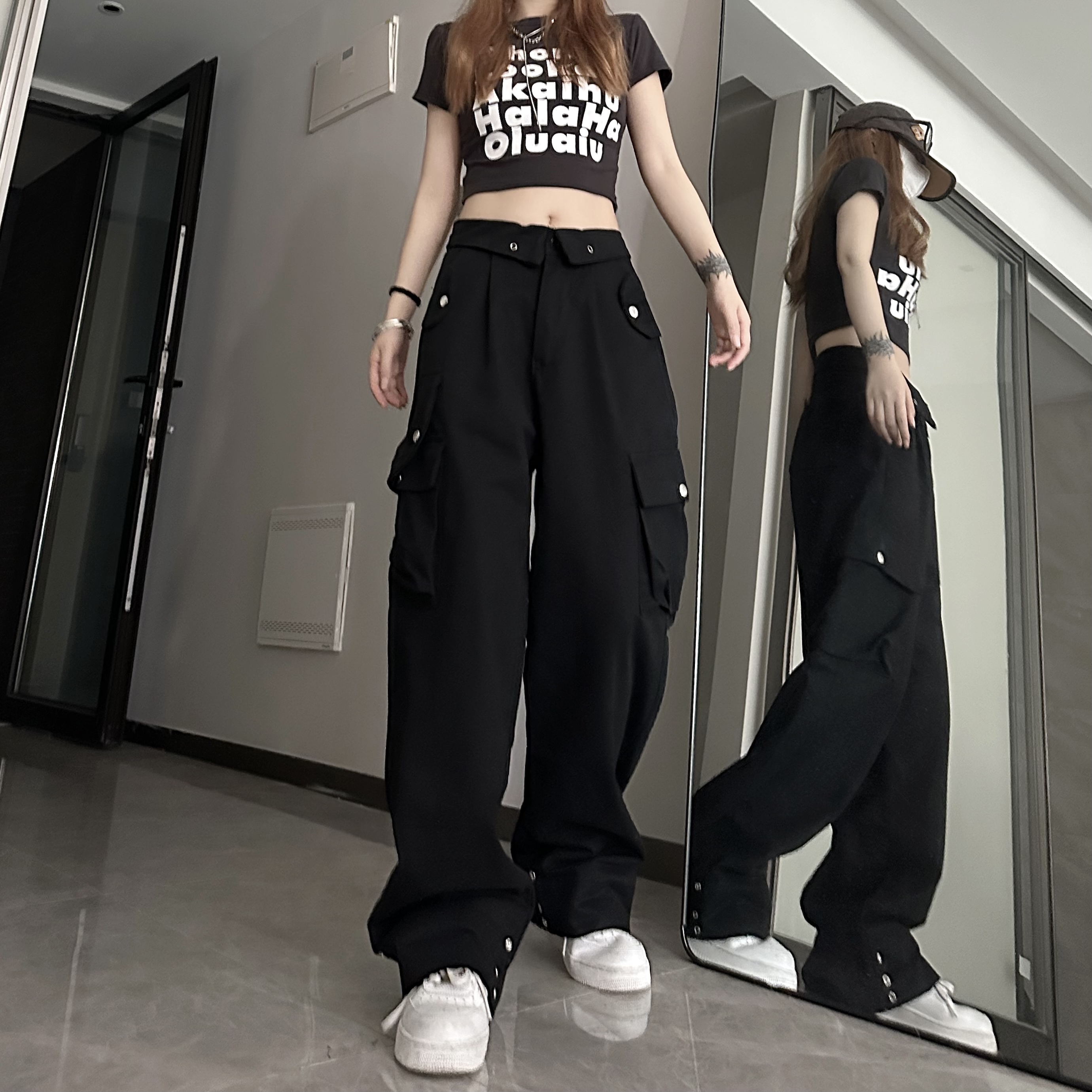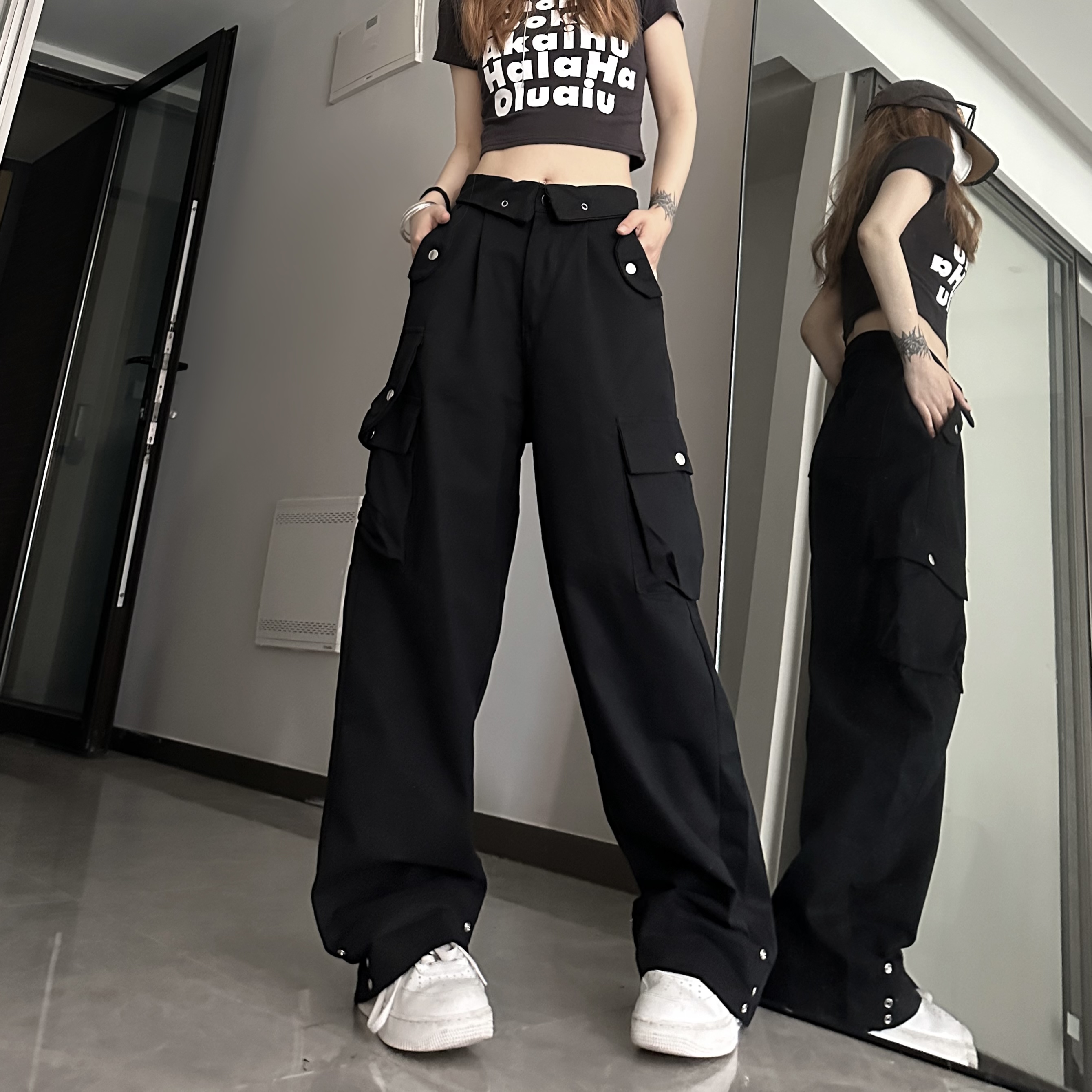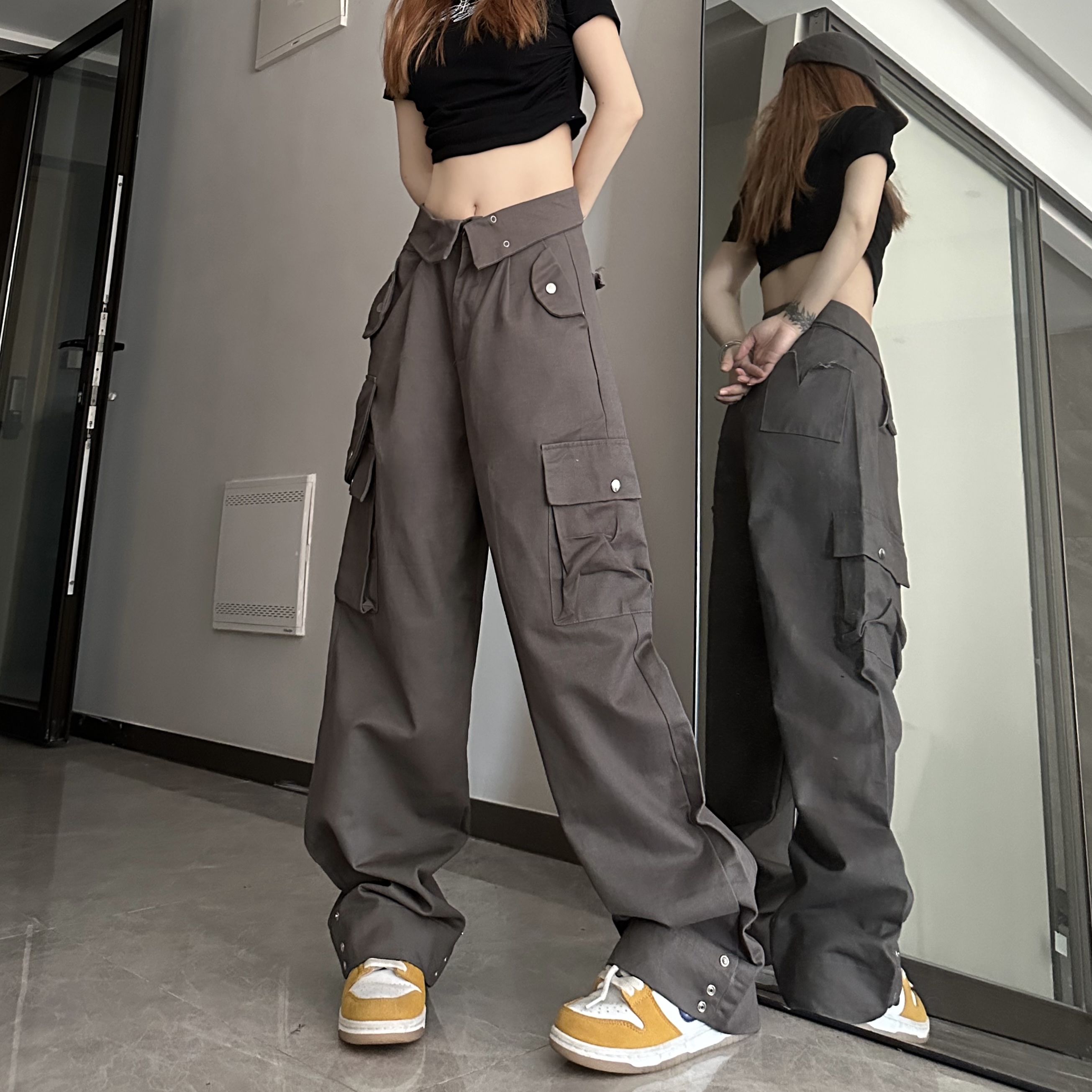 媽個雞媽 ins潮流夏季翻蓋腰頭美式工裝褲寬鬆直筒褲子男女休閒褲