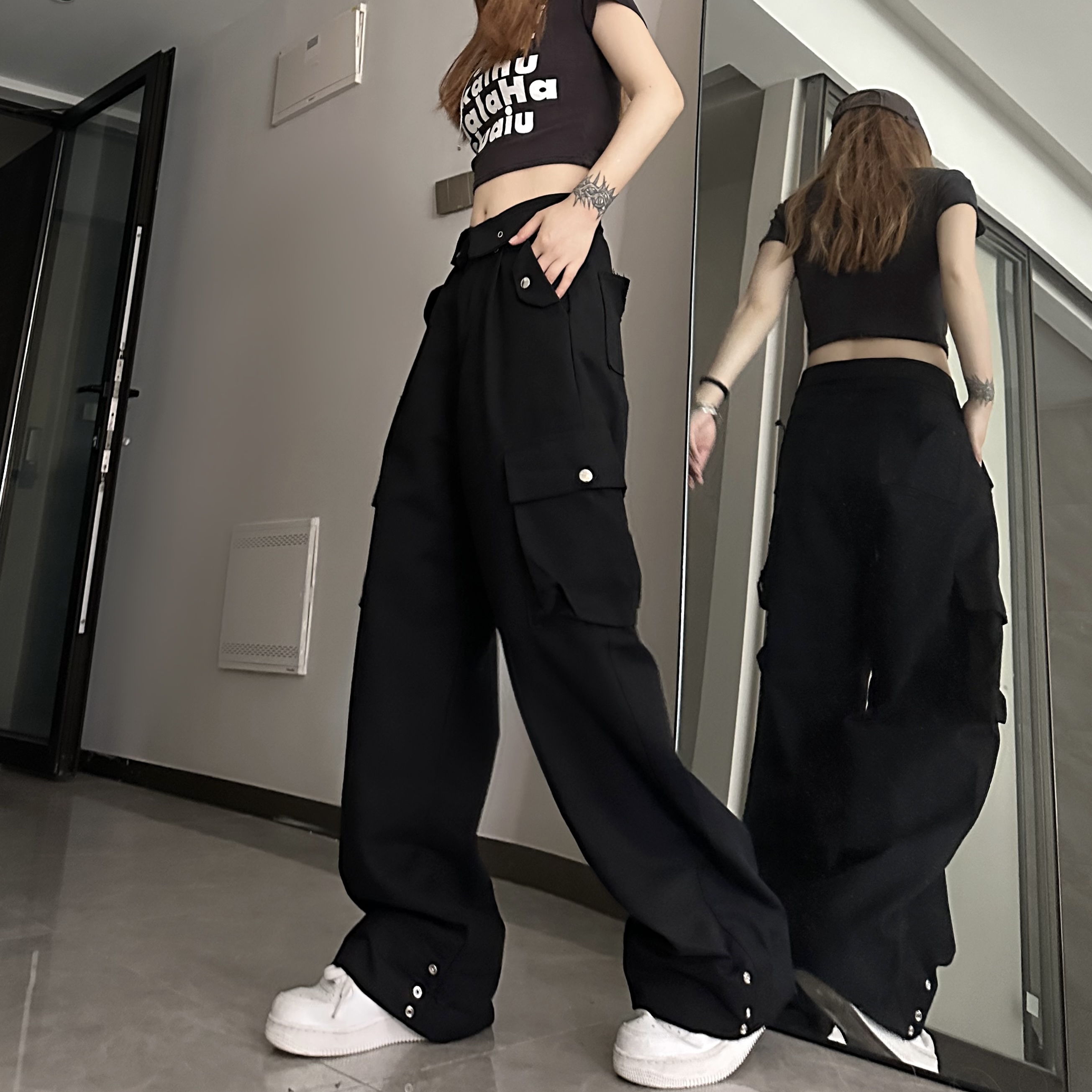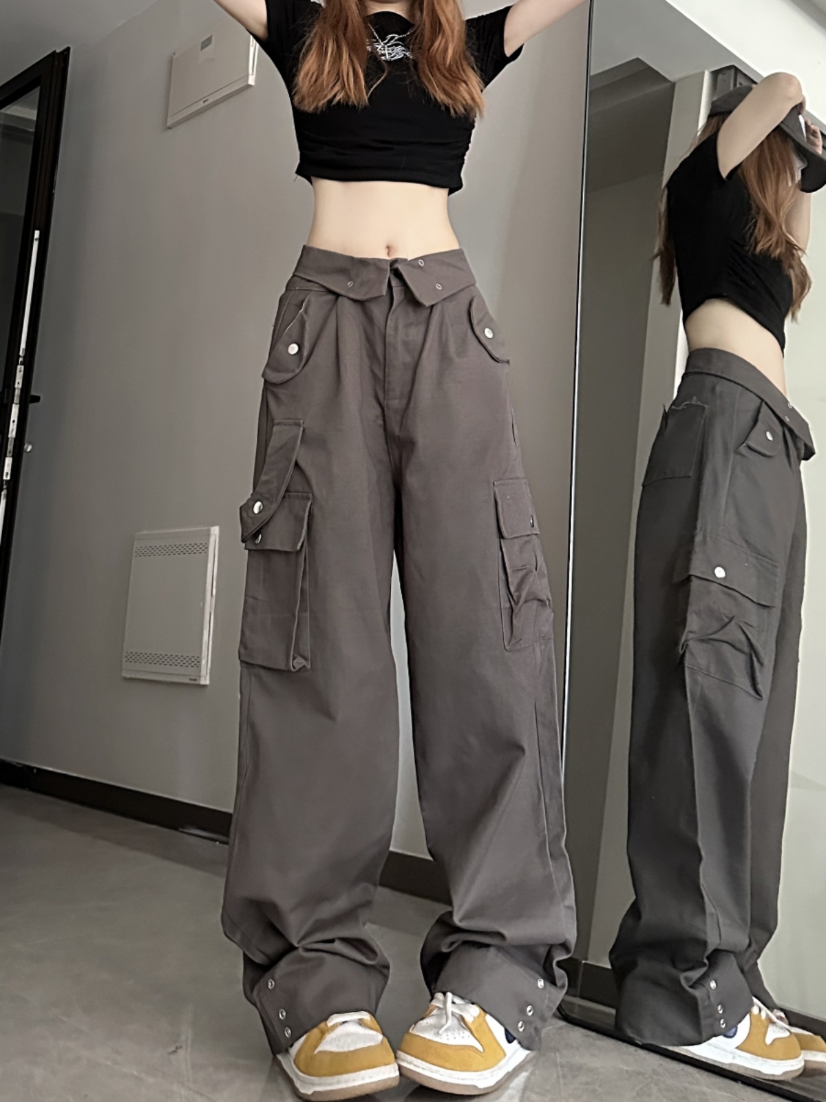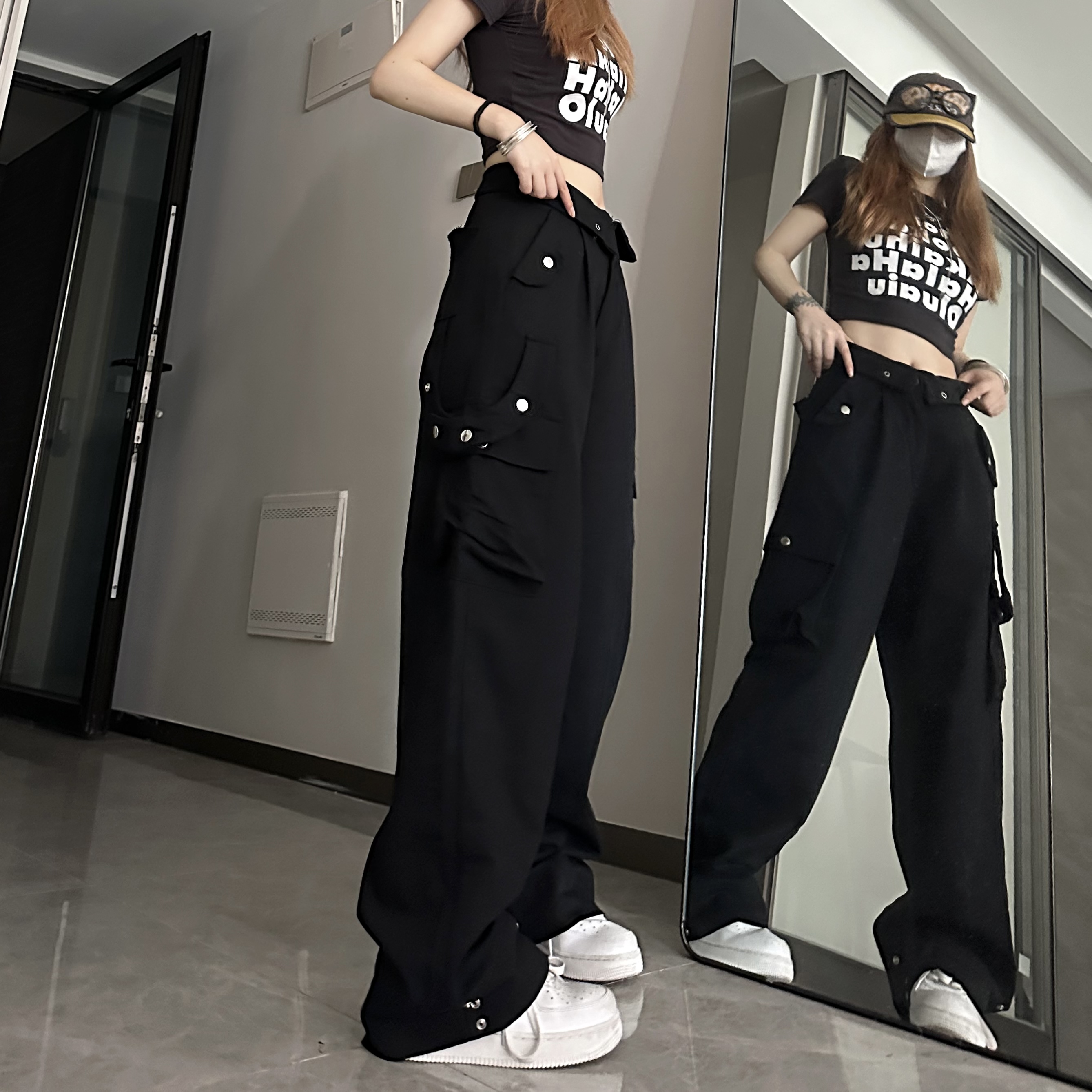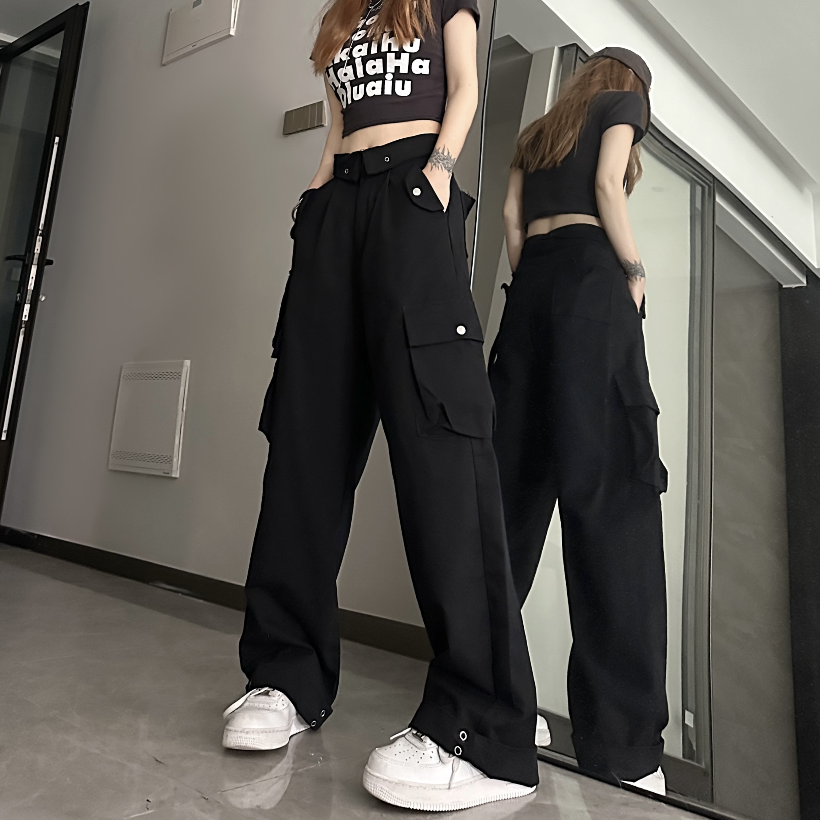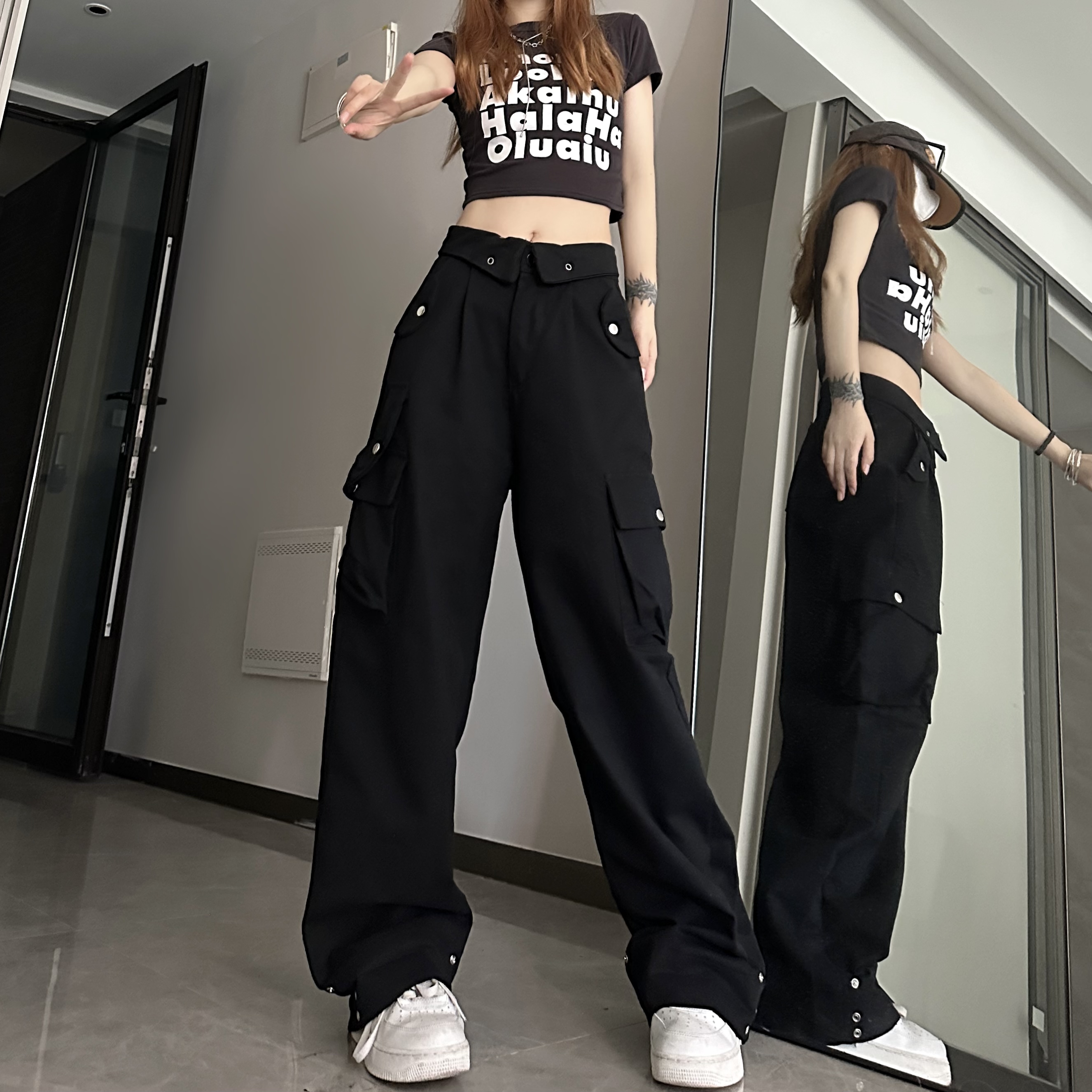 媽個雞媽 ins潮流夏季翻蓋腰頭美式工裝褲寬鬆直筒褲子男女休閒褲