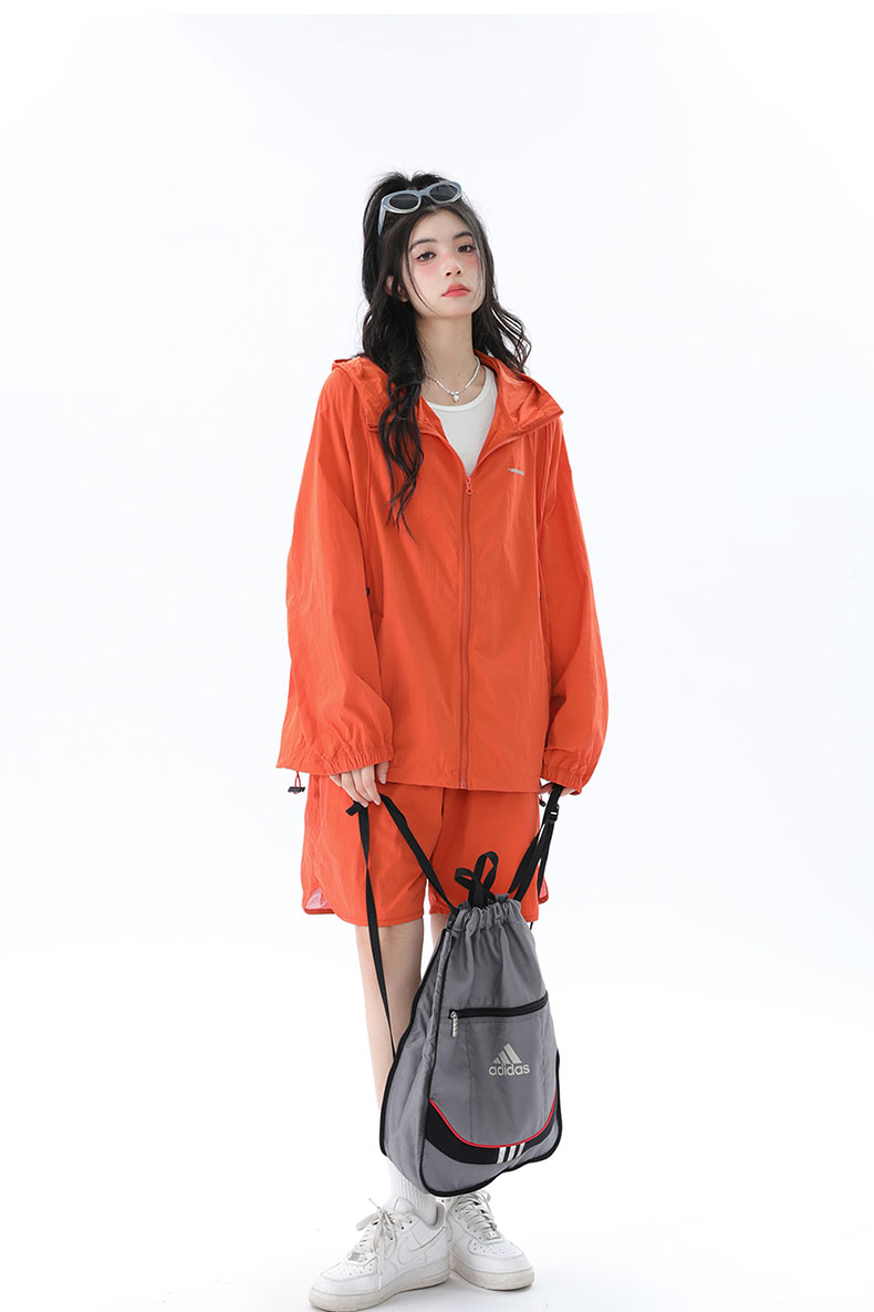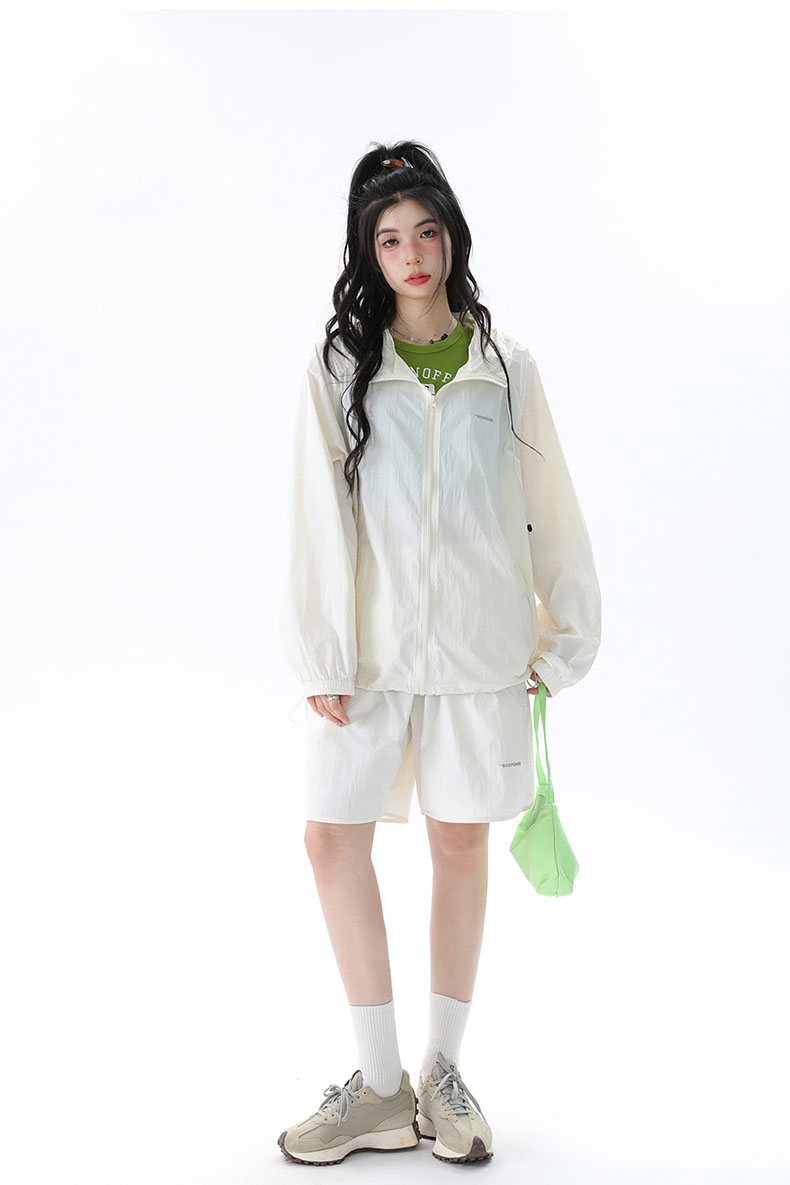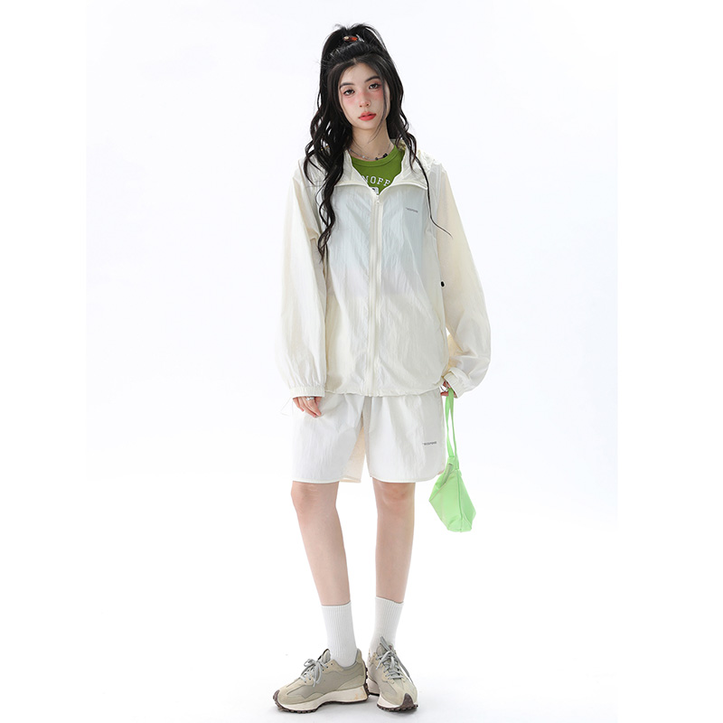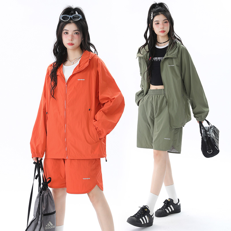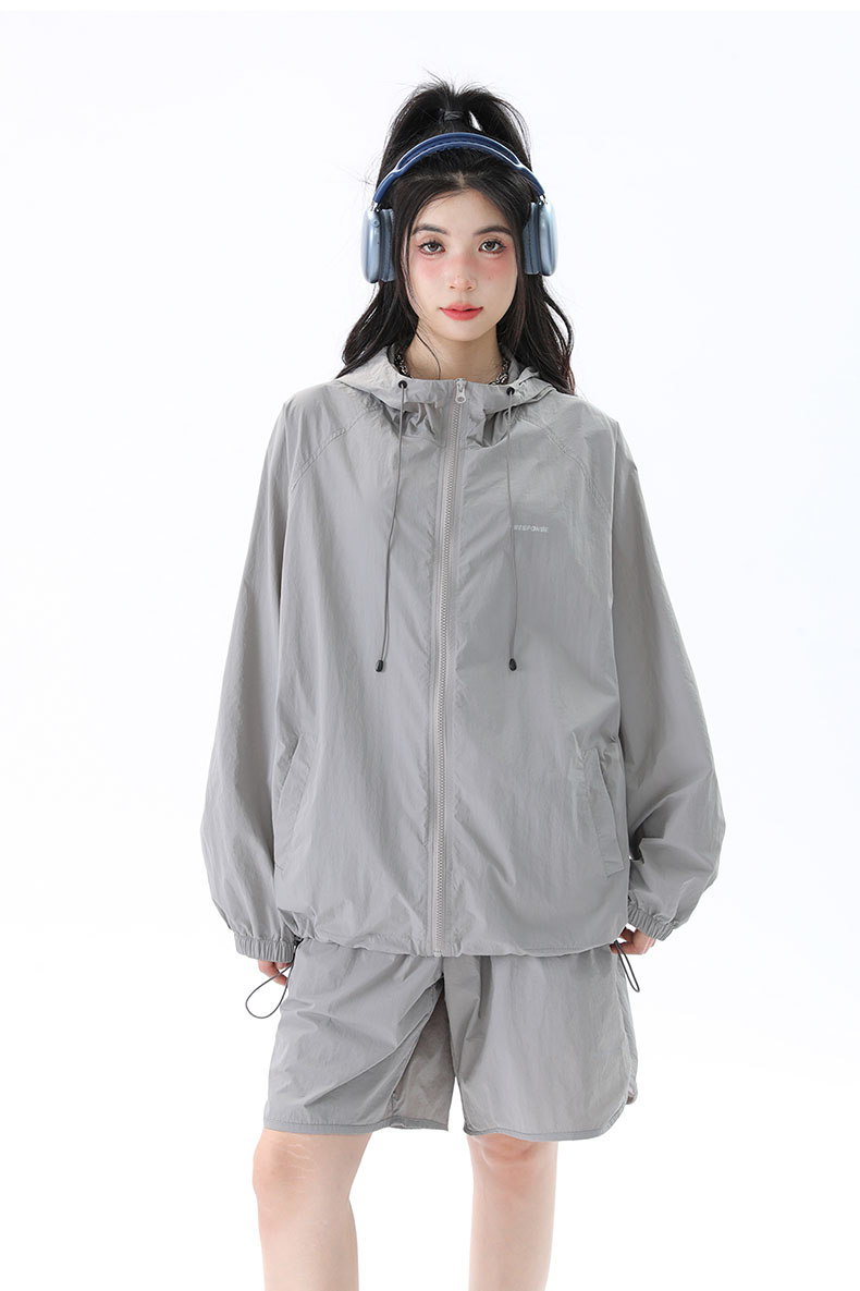 姝姬潮流寬鬆休閒防曬服套裝女國潮原創夏季拉鍊純色連帽防曬衣潮