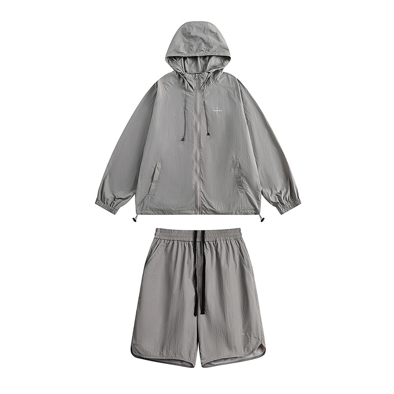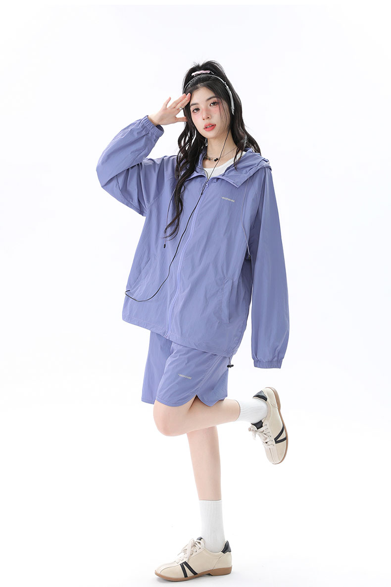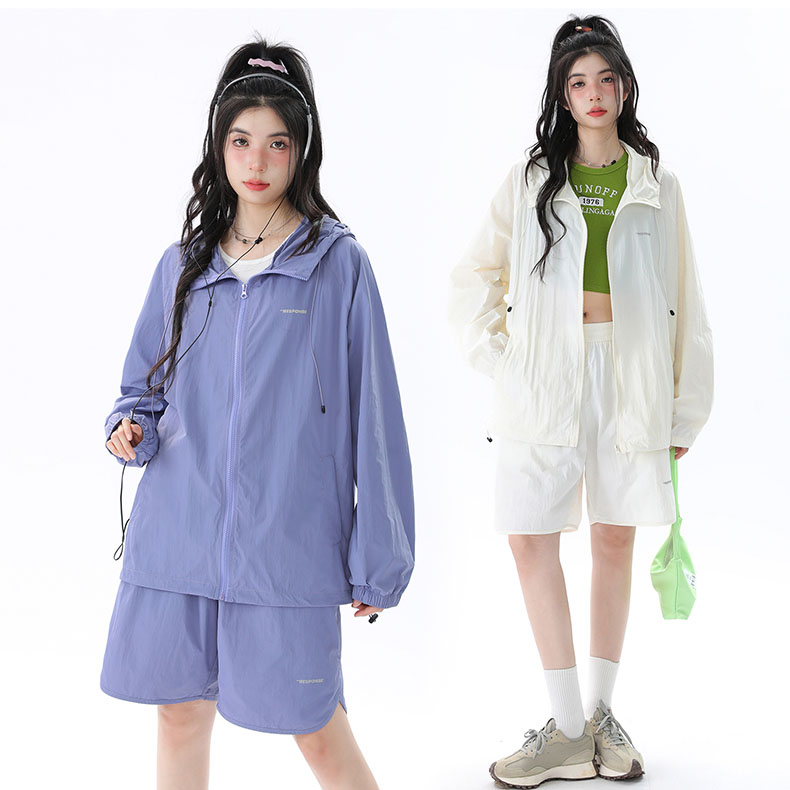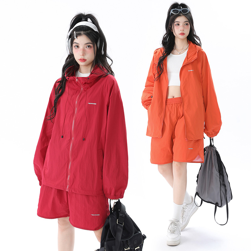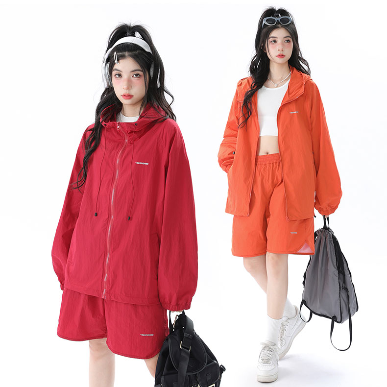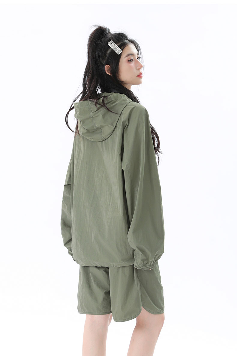 姝姬潮流寬鬆休閒防曬服套裝女國潮原創夏季拉鍊純色連帽防曬衣潮