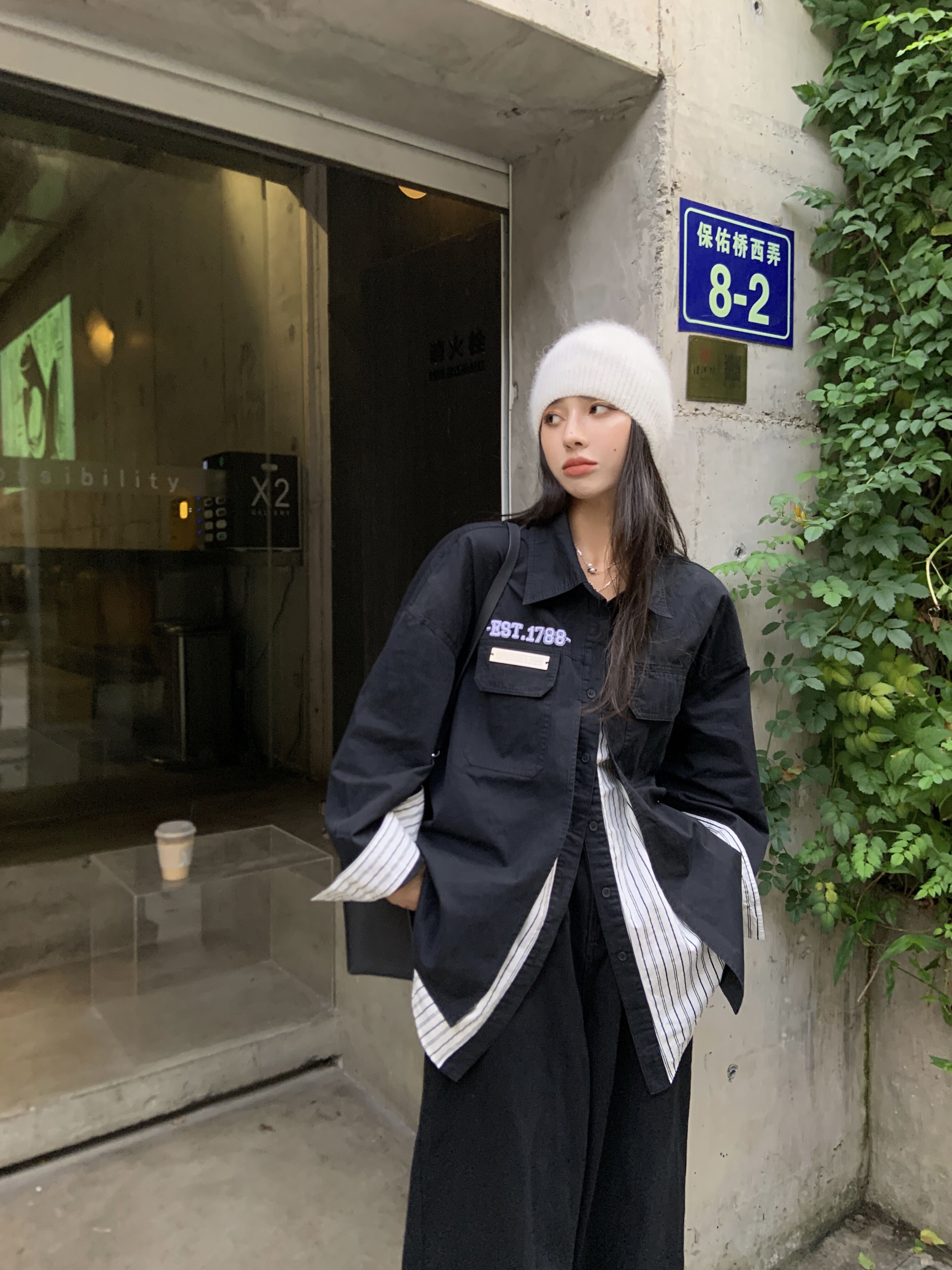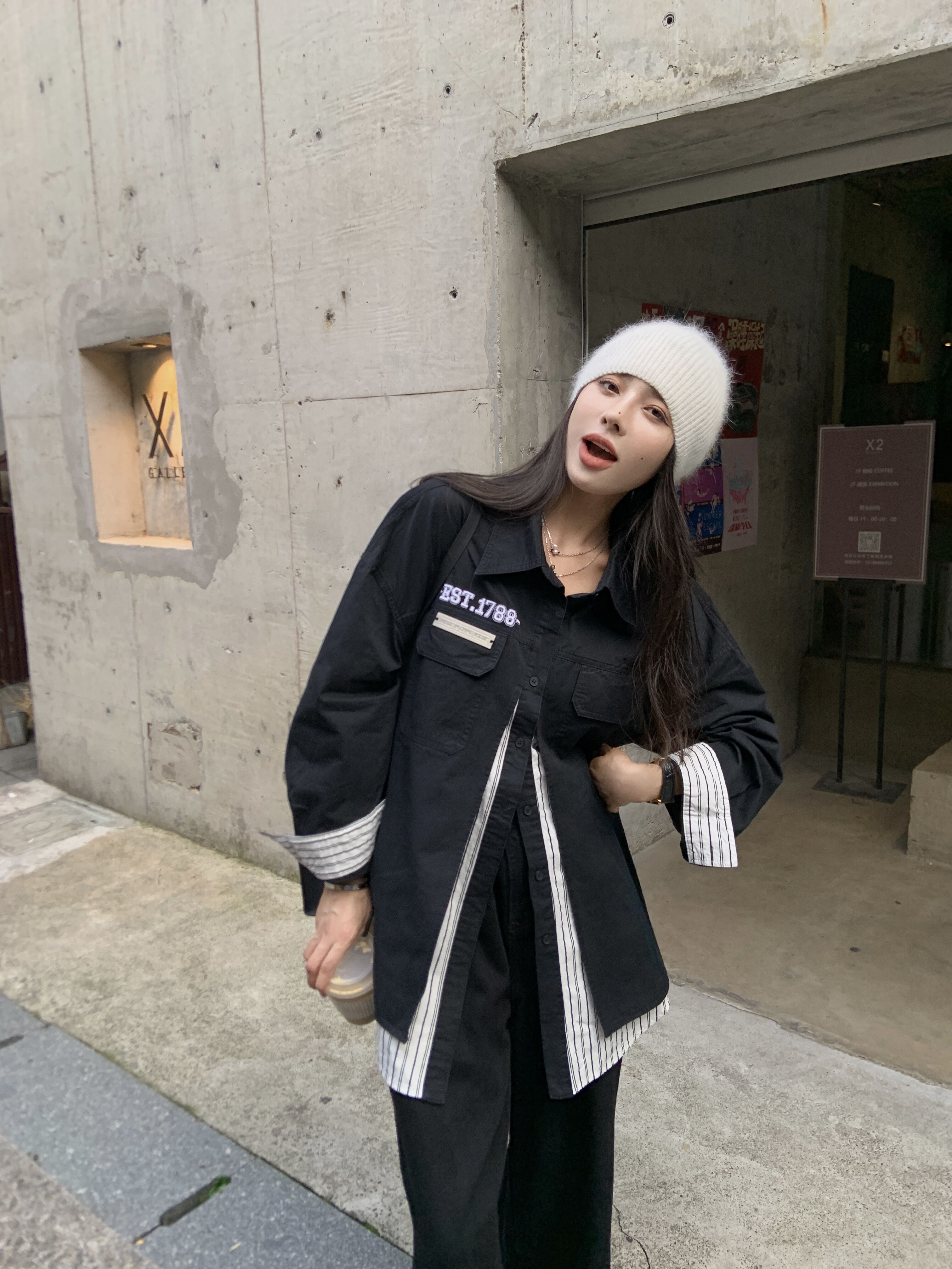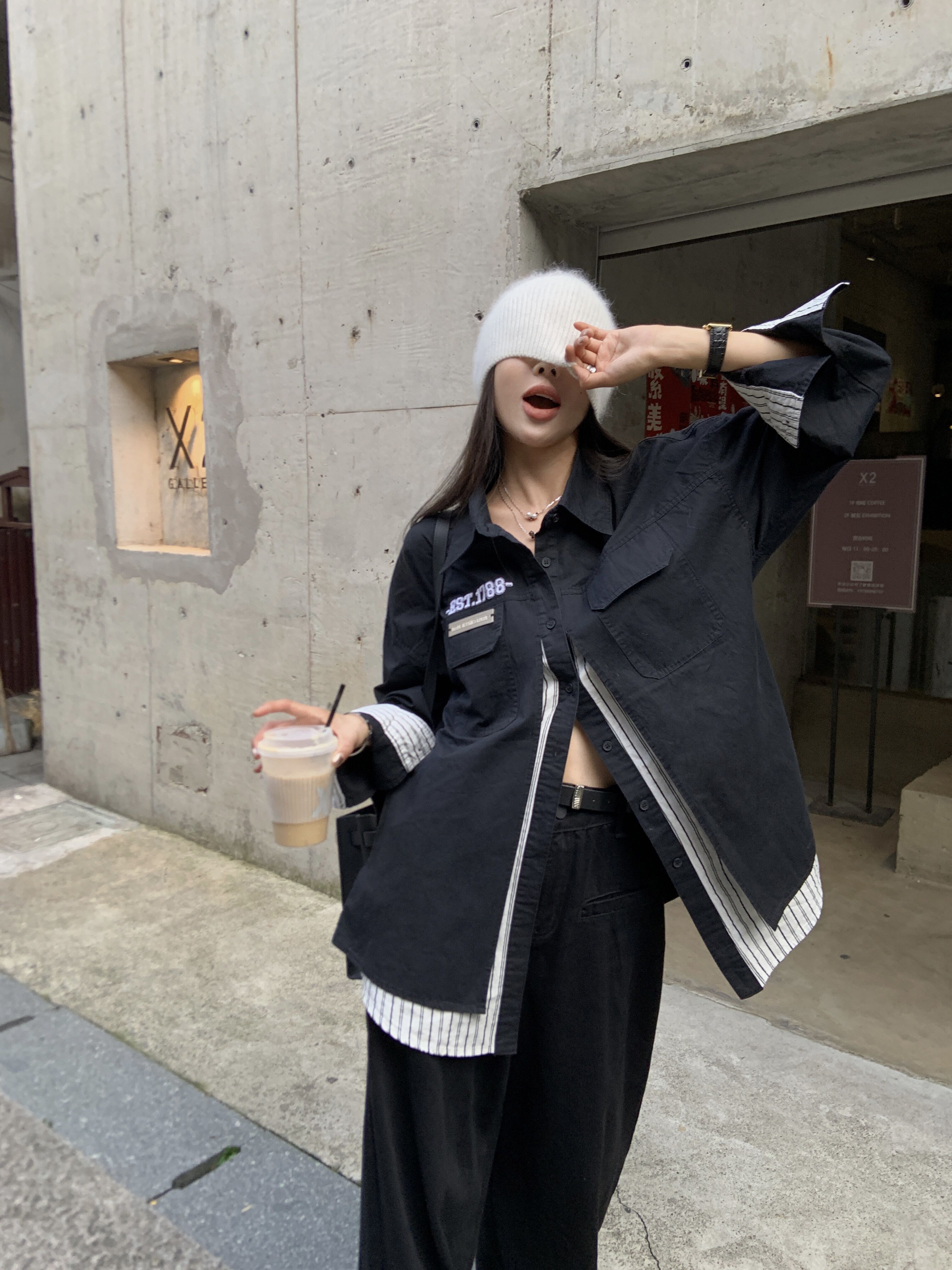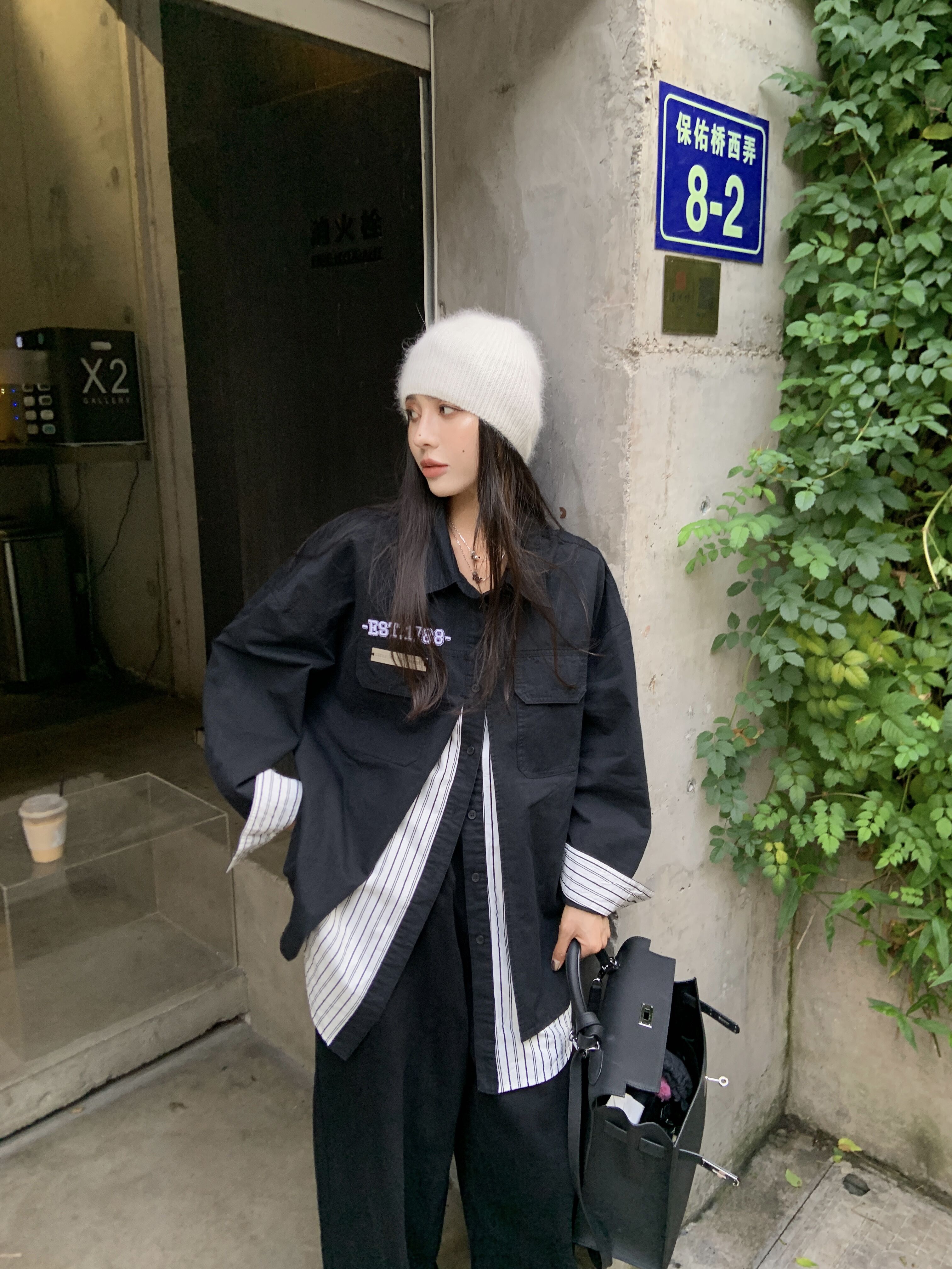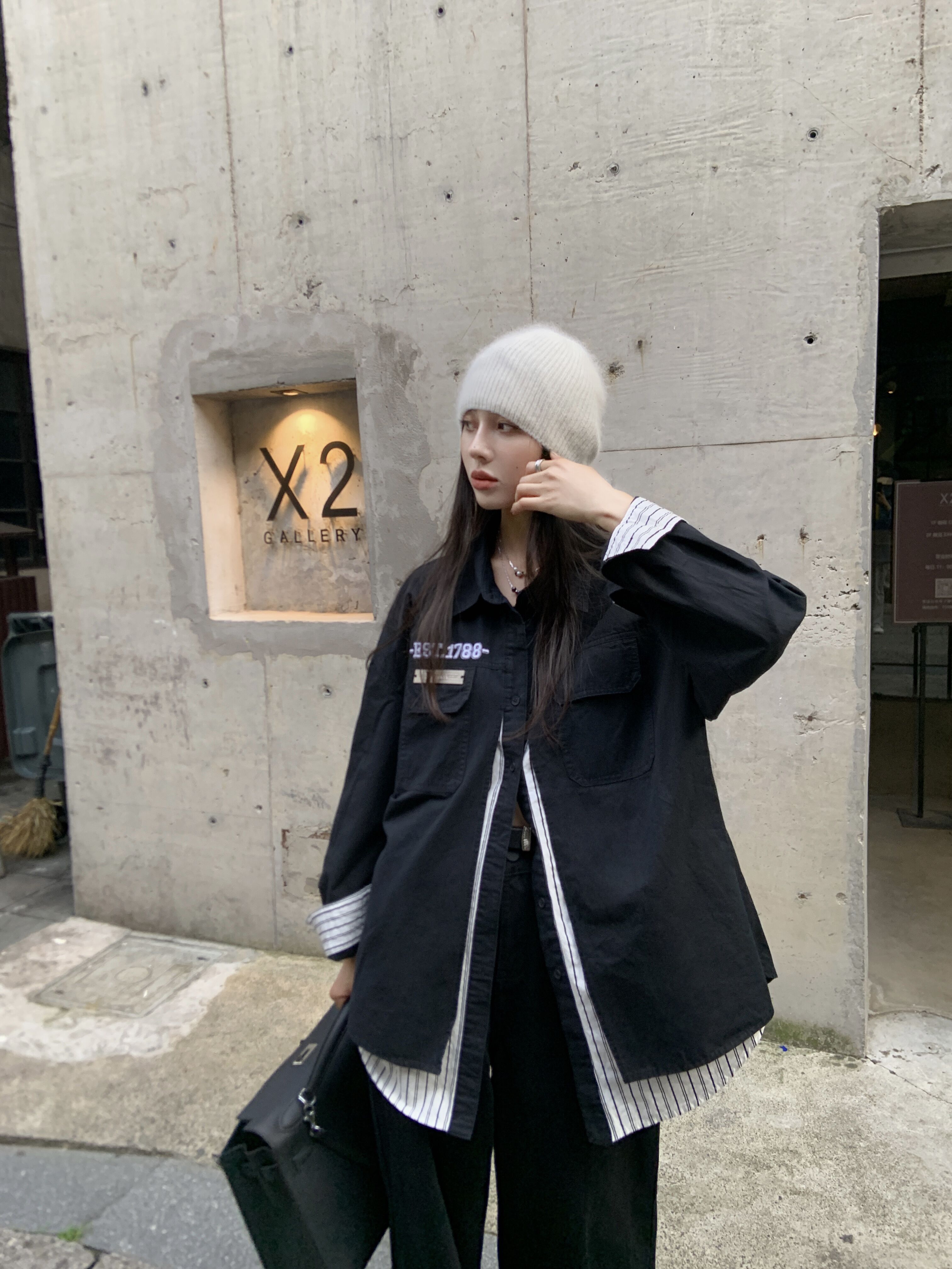 假兩件條紋工裝襯衫外套女秋裝新款寬鬆顯瘦襯衫開衫長袖黑色上衣