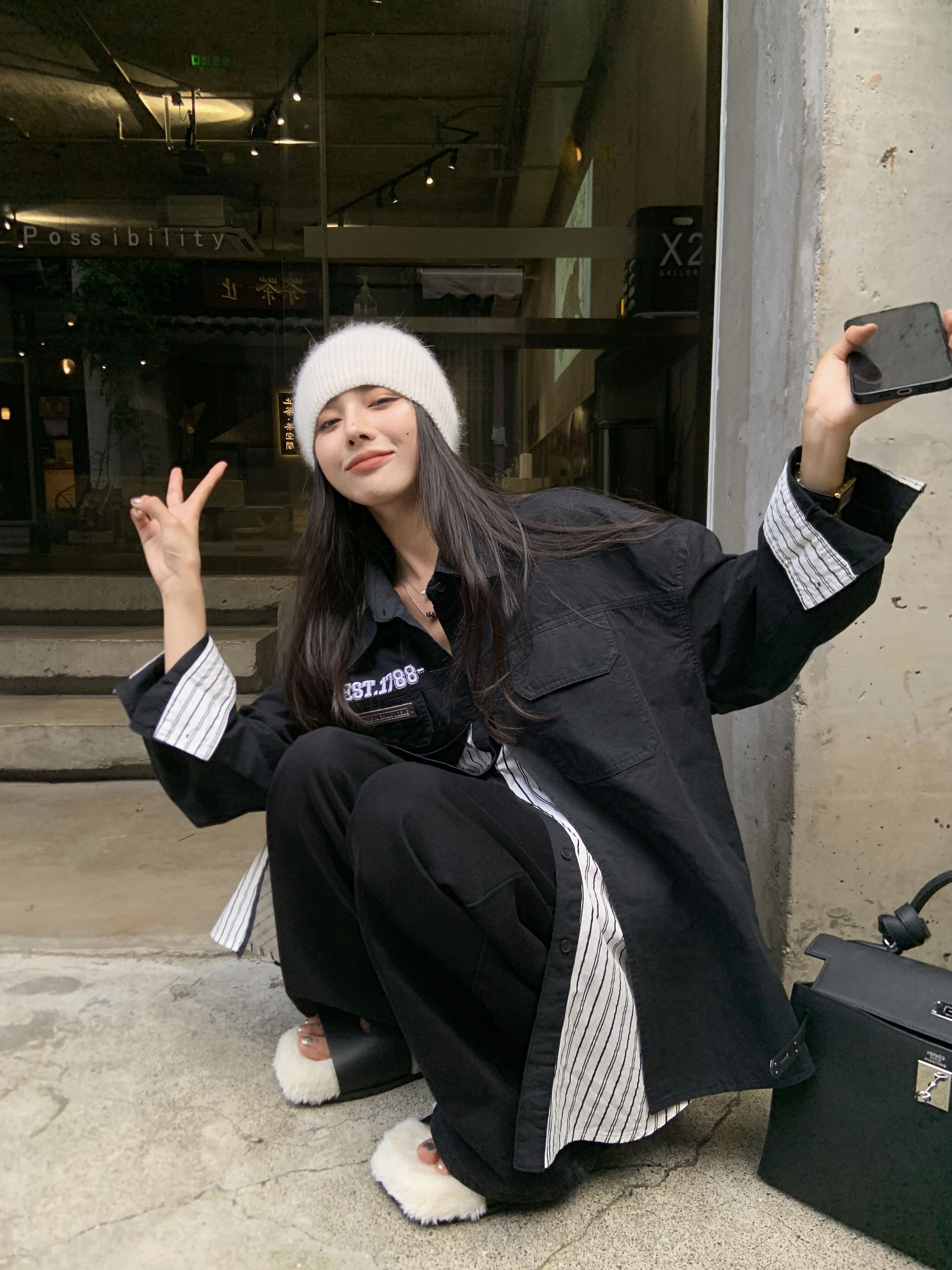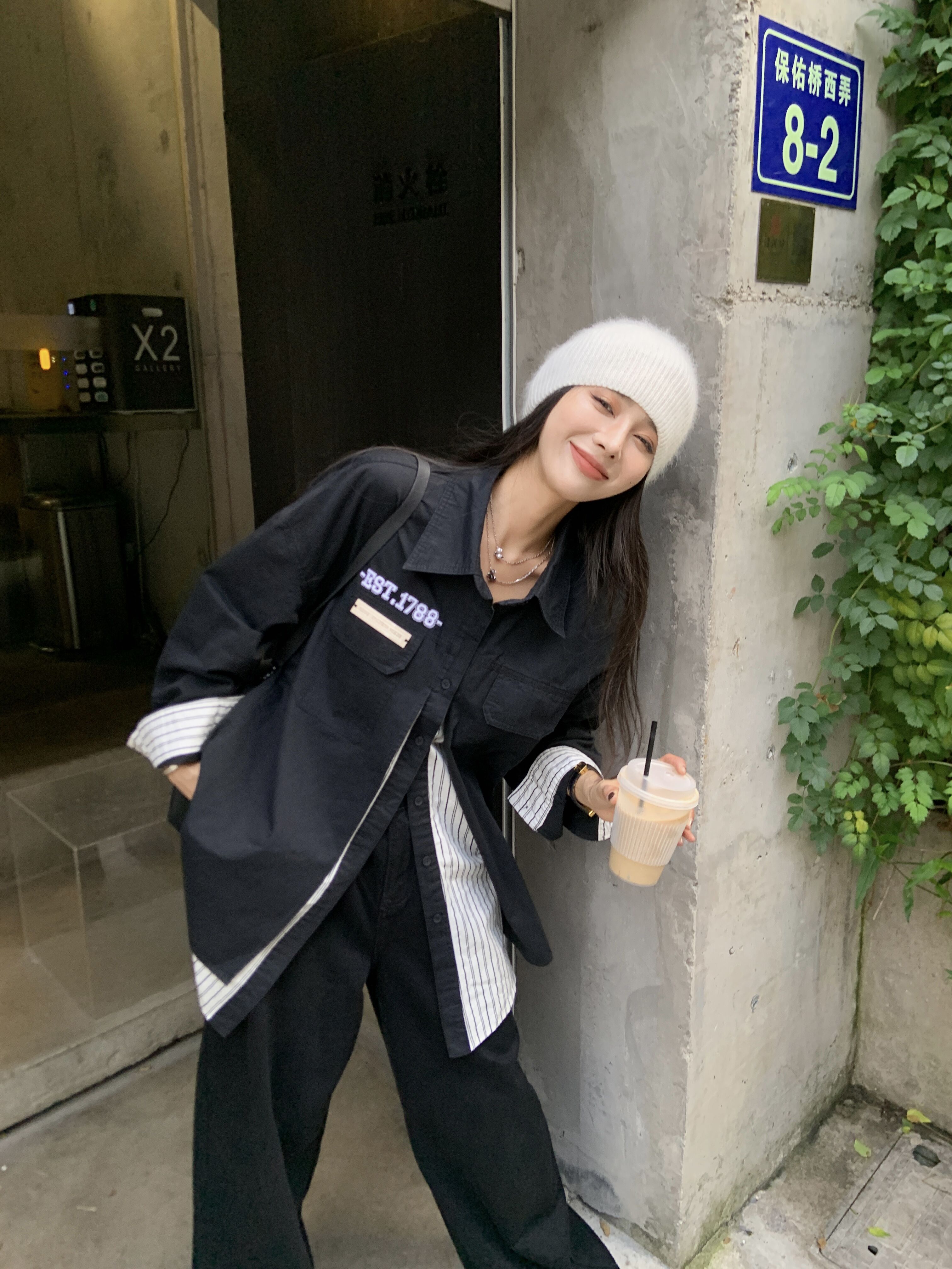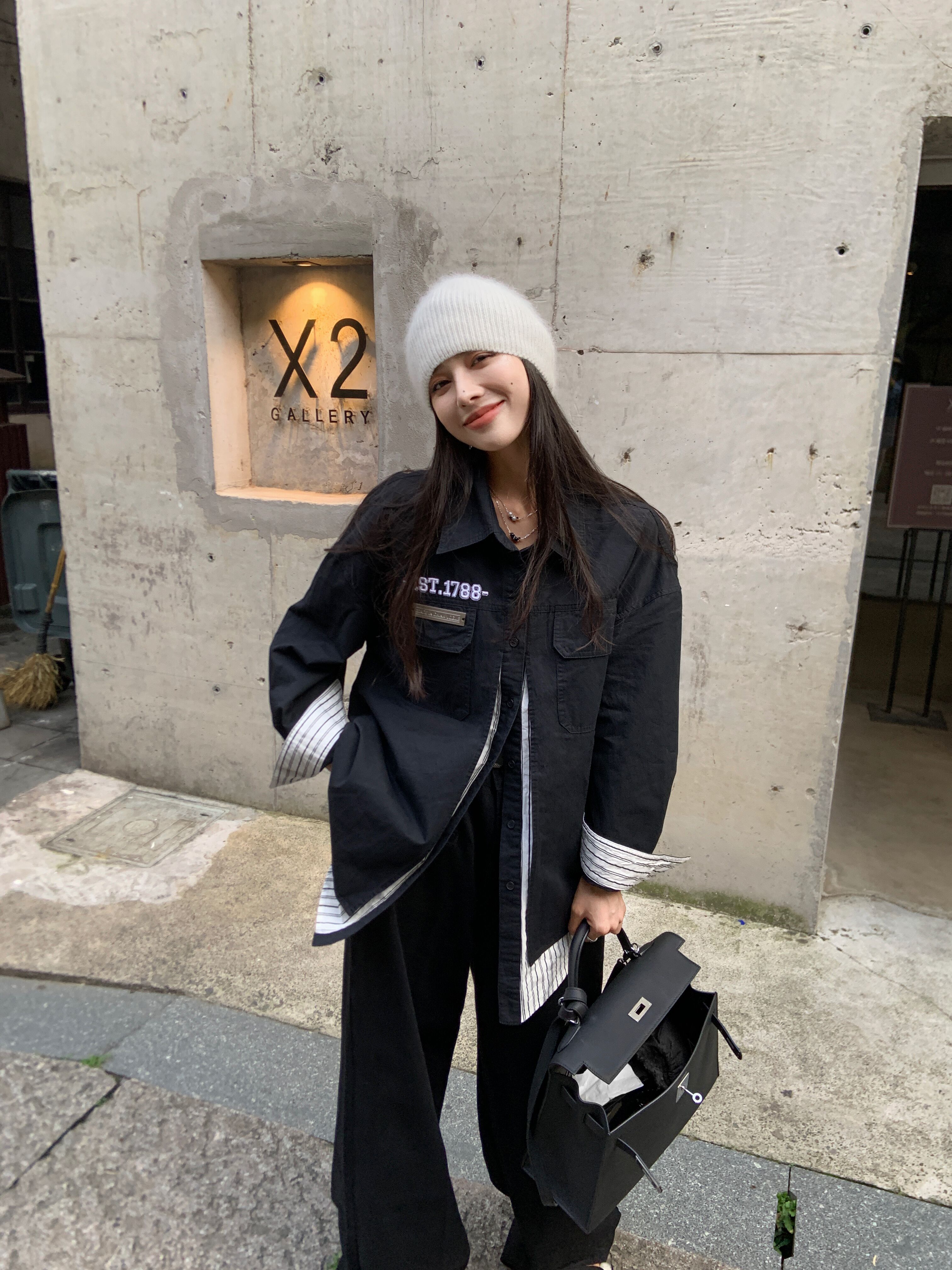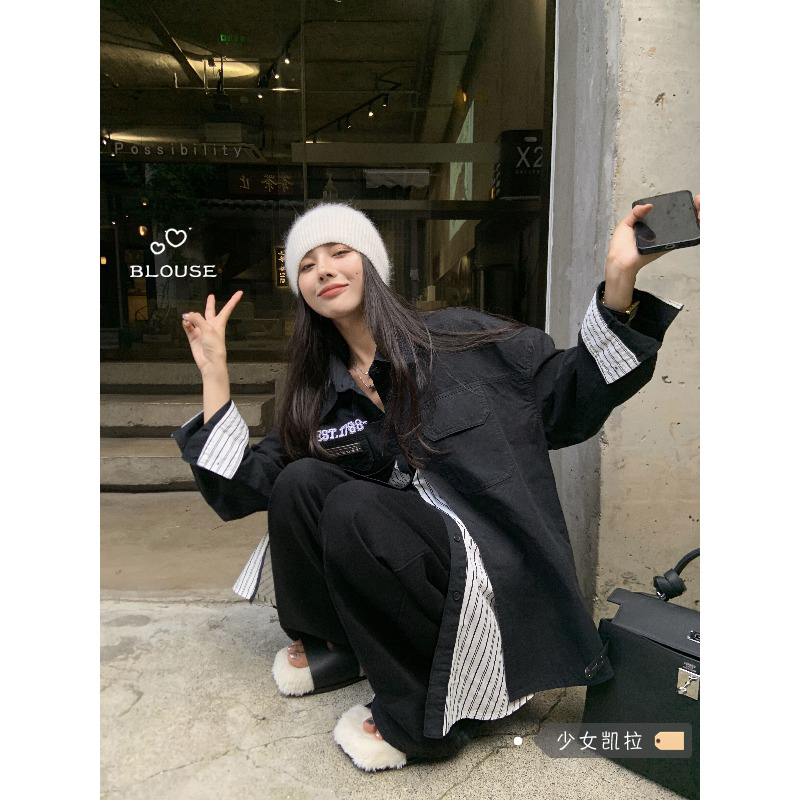假兩件條紋工裝襯衫外套女秋裝新款寬鬆顯瘦襯衫開衫長袖黑色上衣