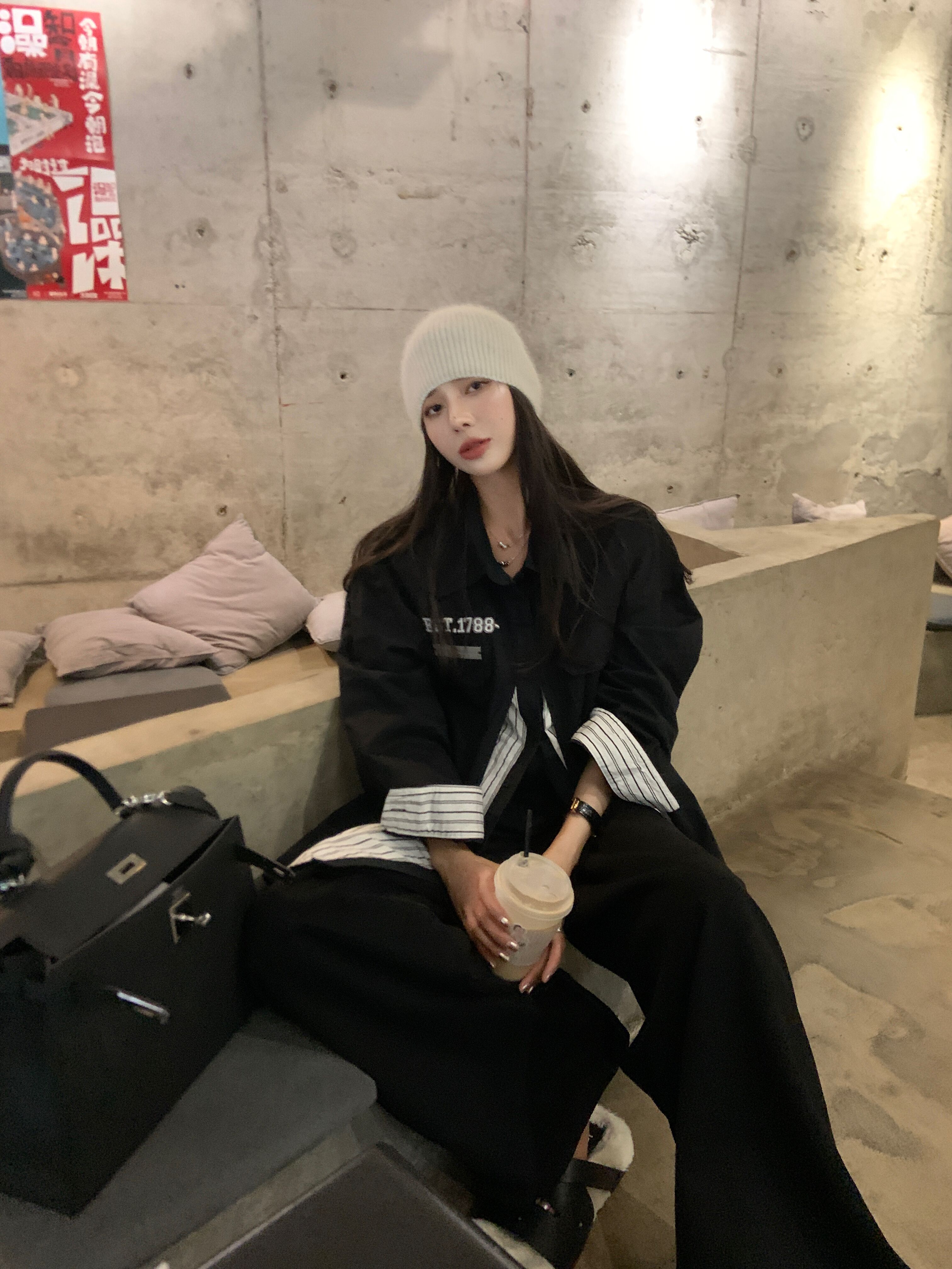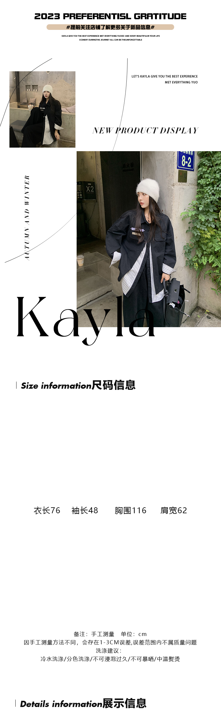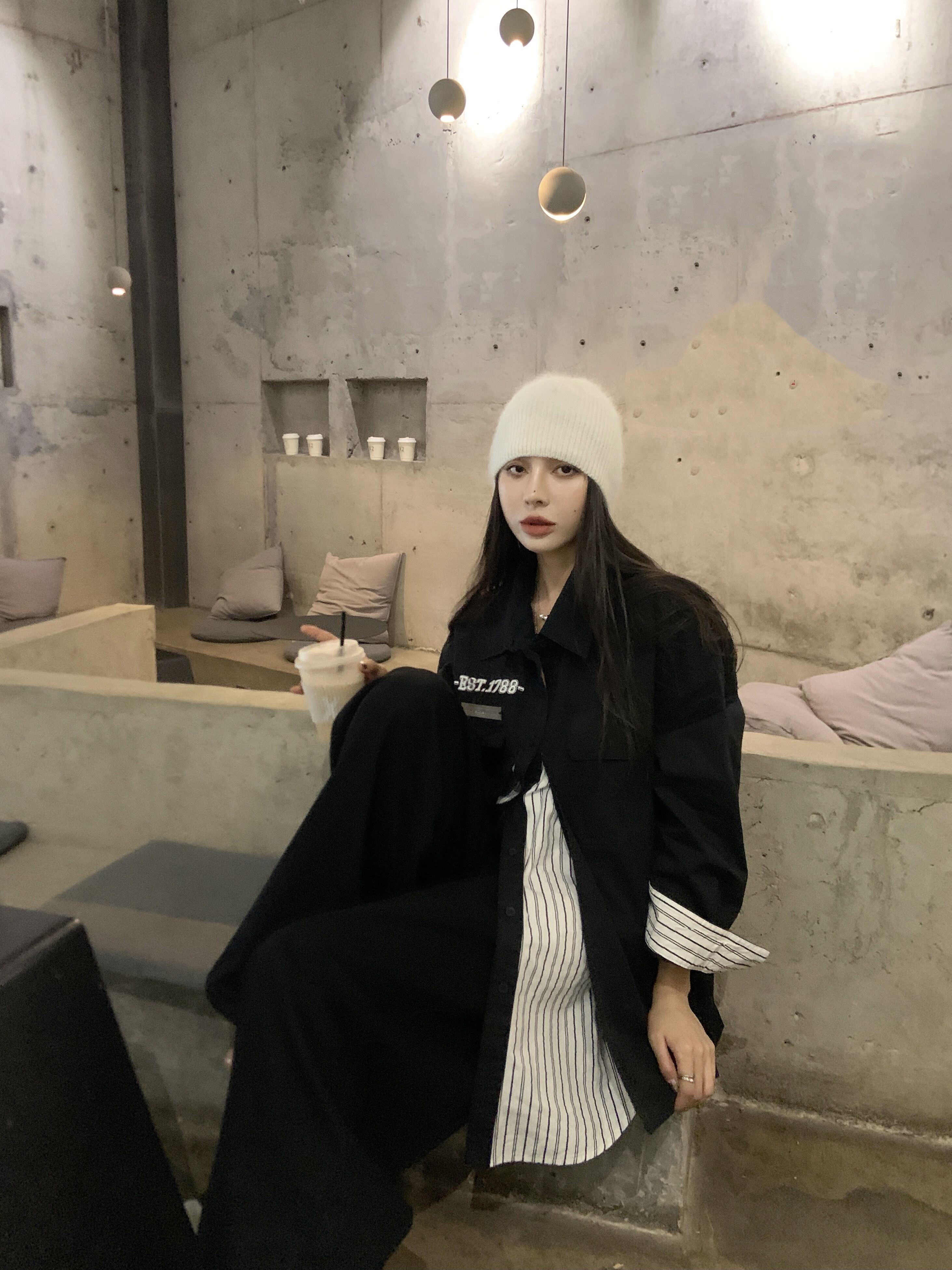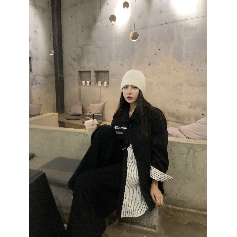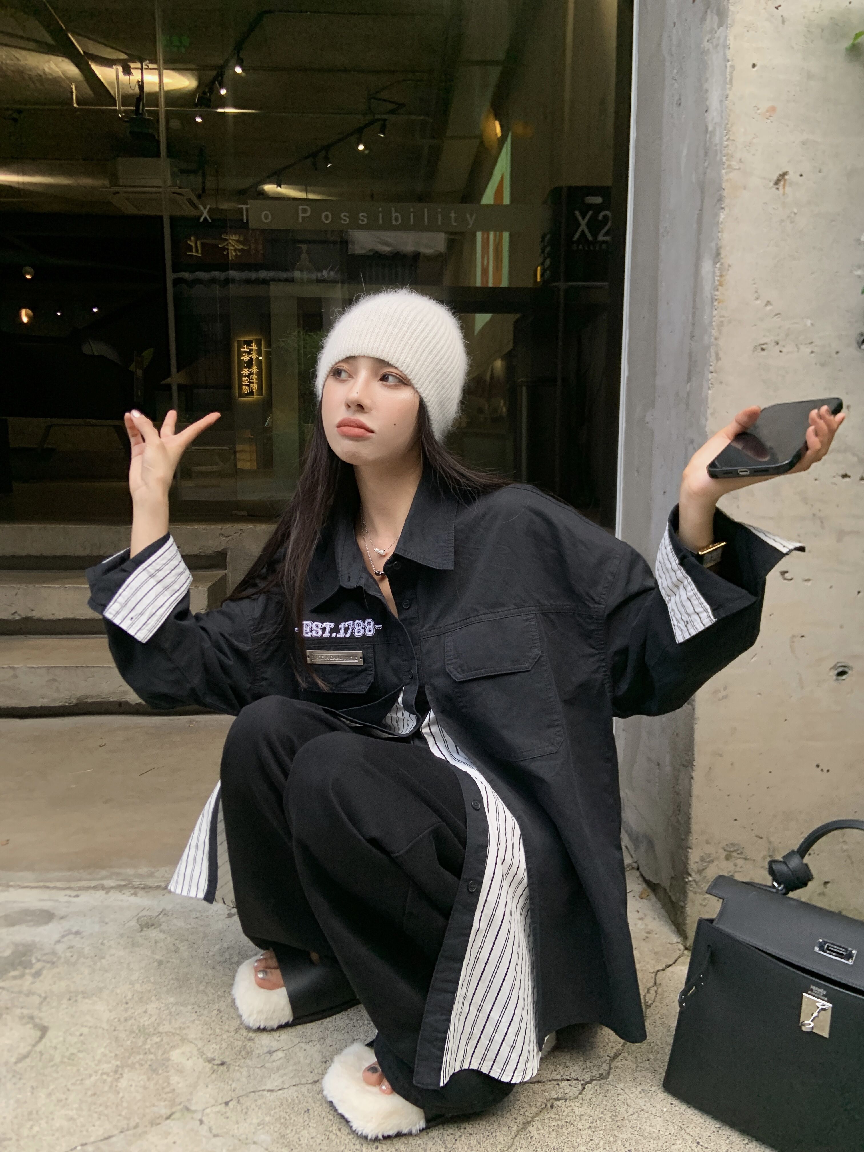 假兩件條紋工裝襯衫外套女秋裝新款寬鬆顯瘦襯衫開衫長袖黑色上衣