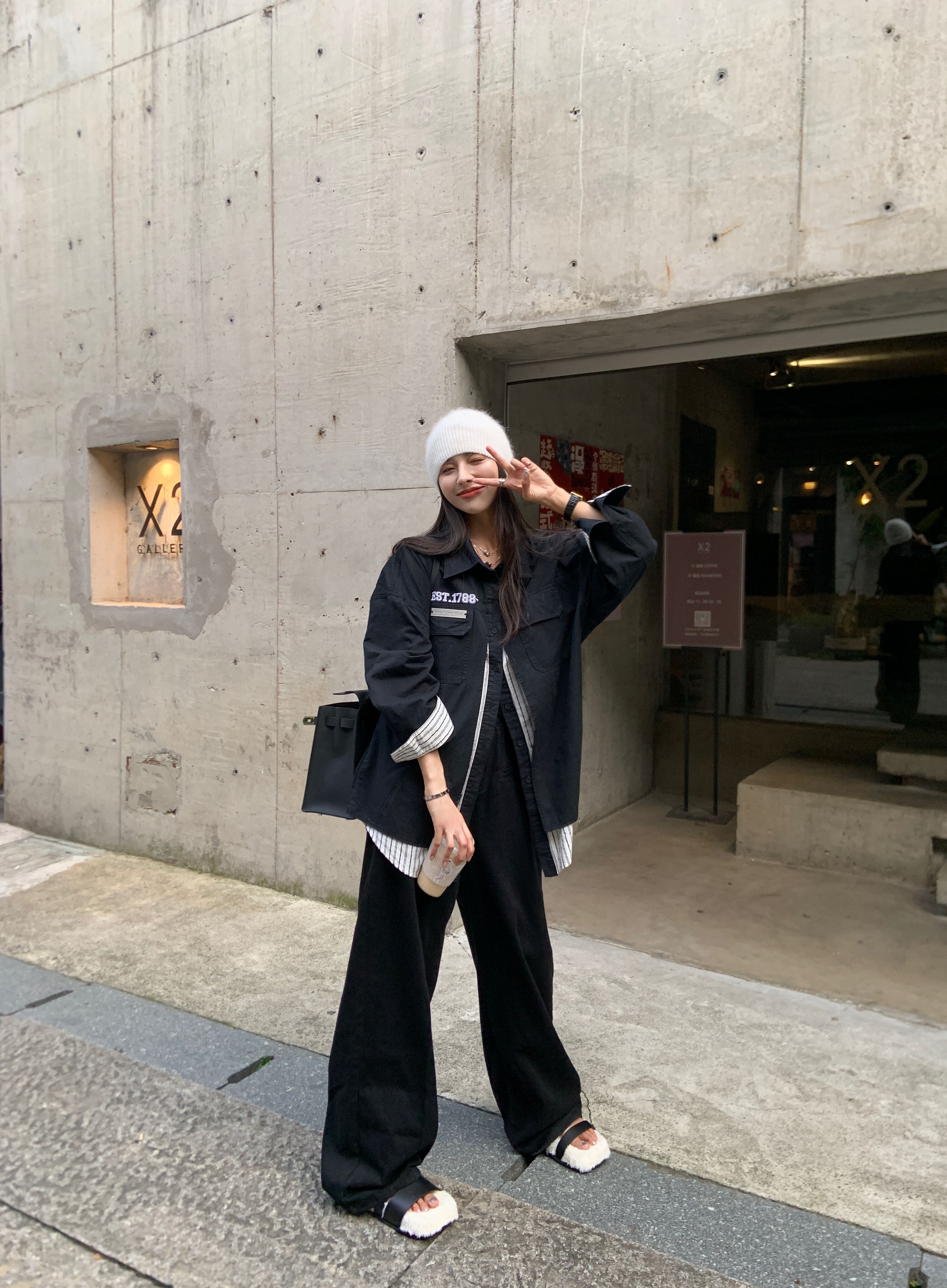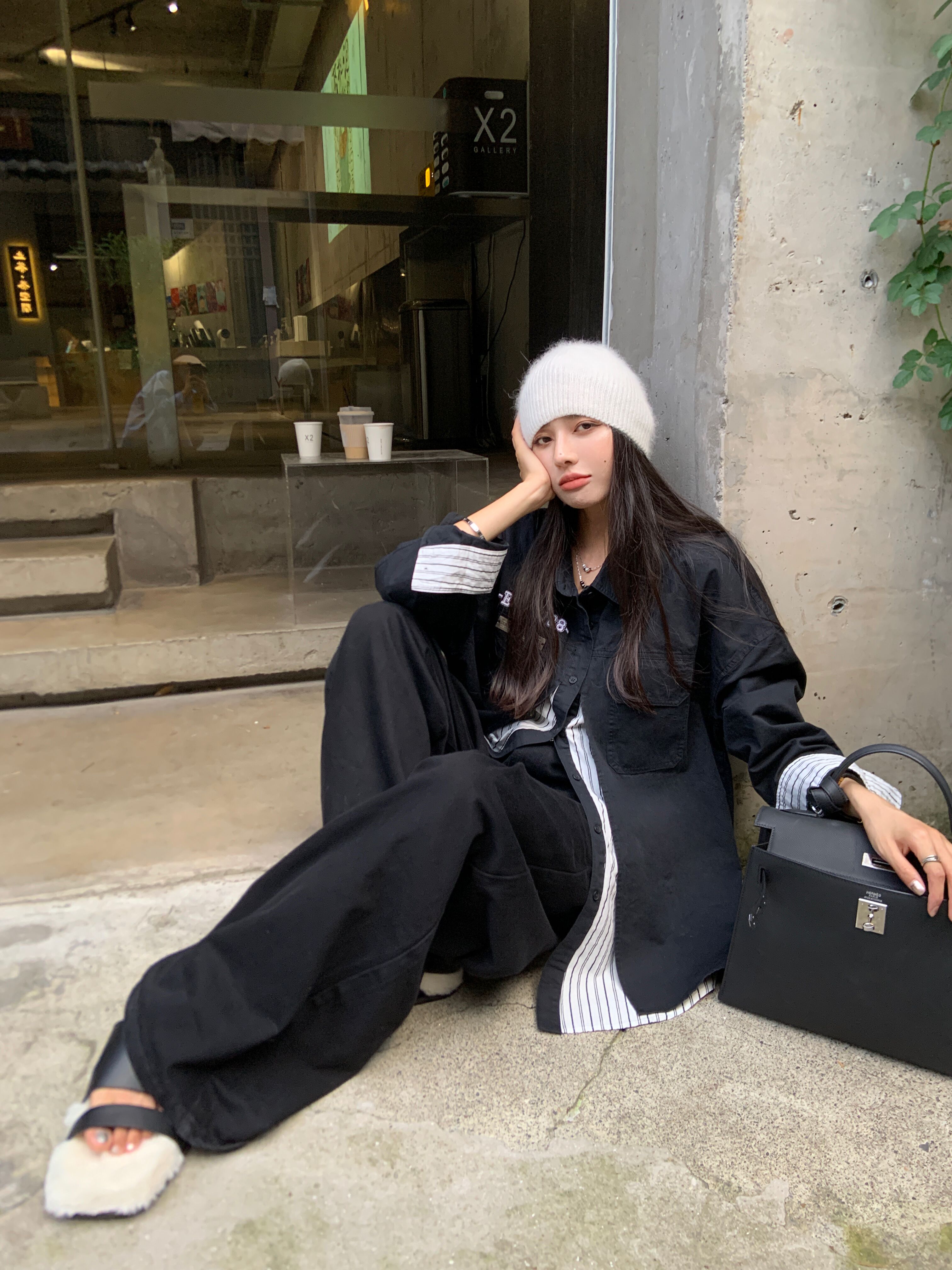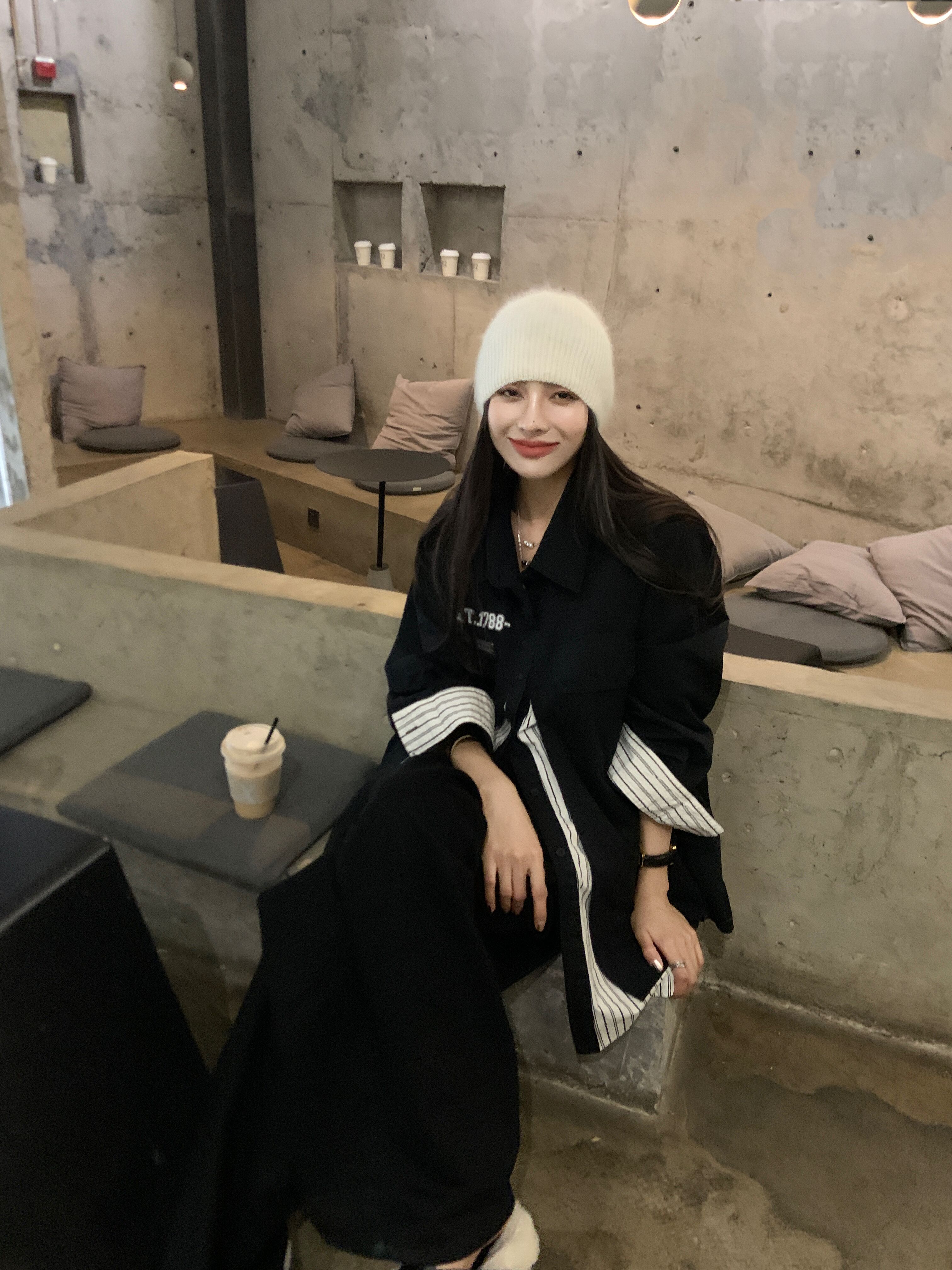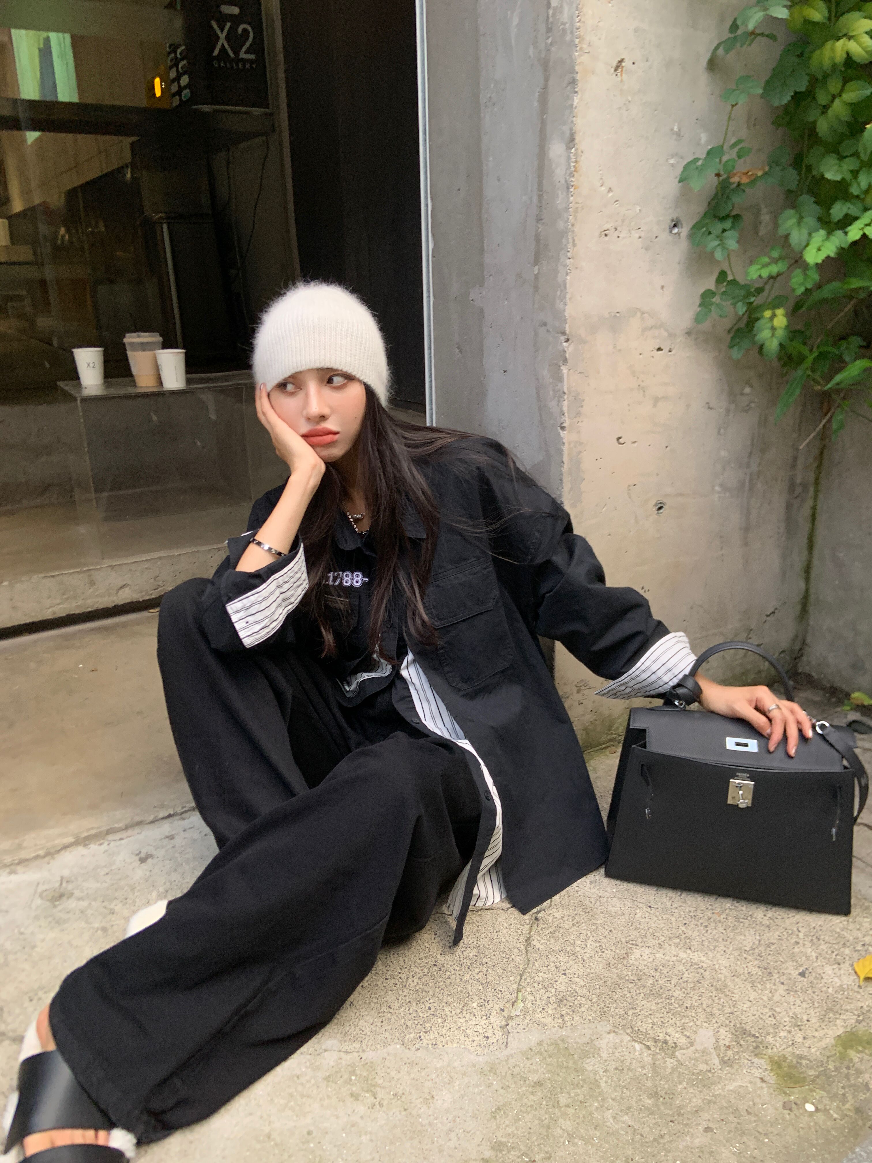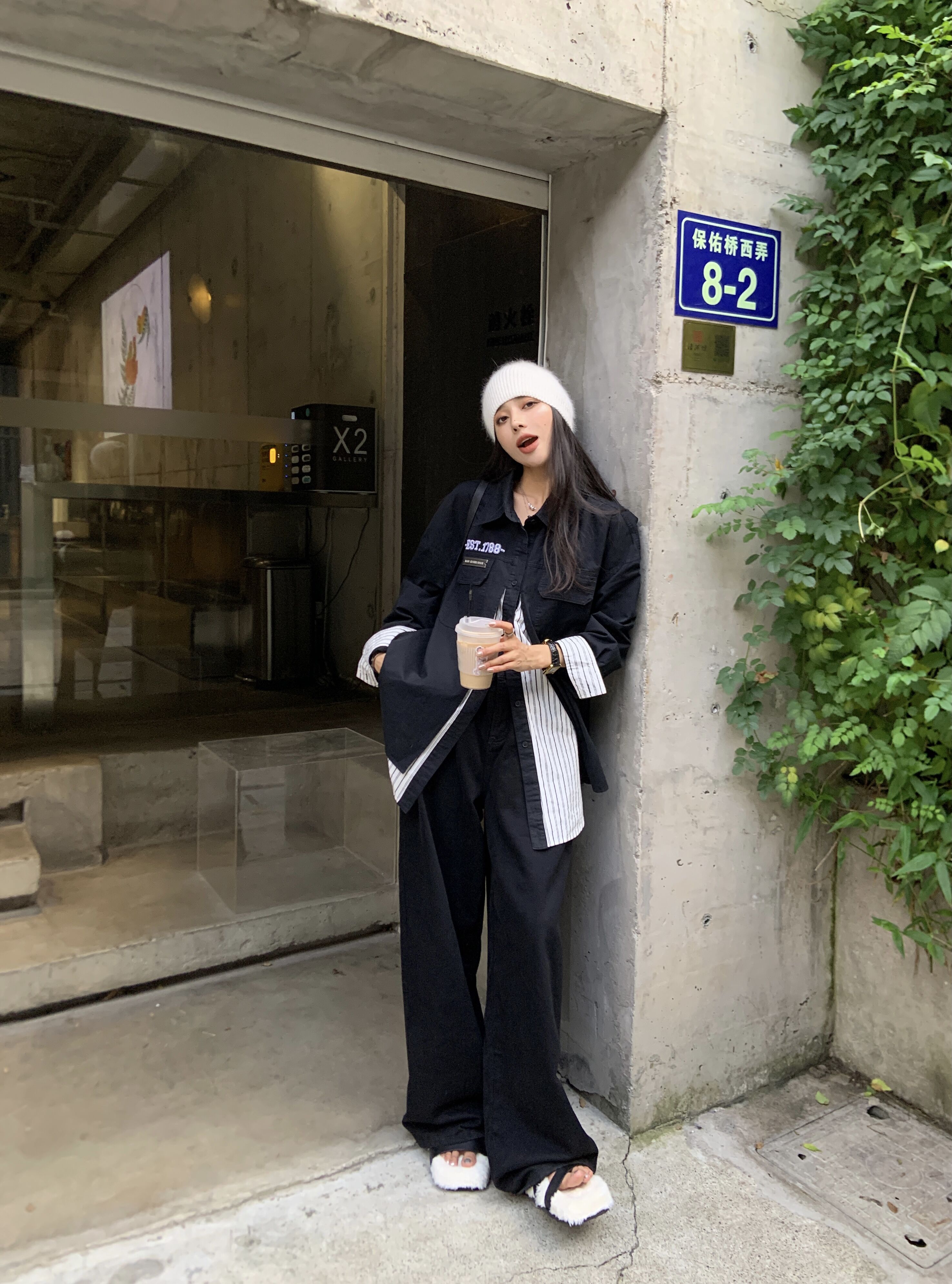 假兩件條紋工裝襯衫外套女秋裝新款寬鬆顯瘦襯衫開衫長袖黑色上衣