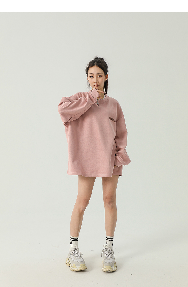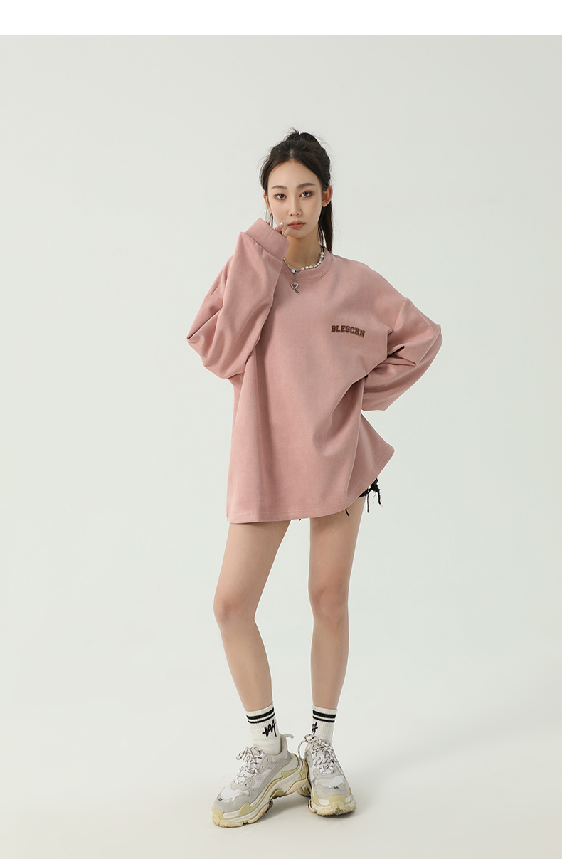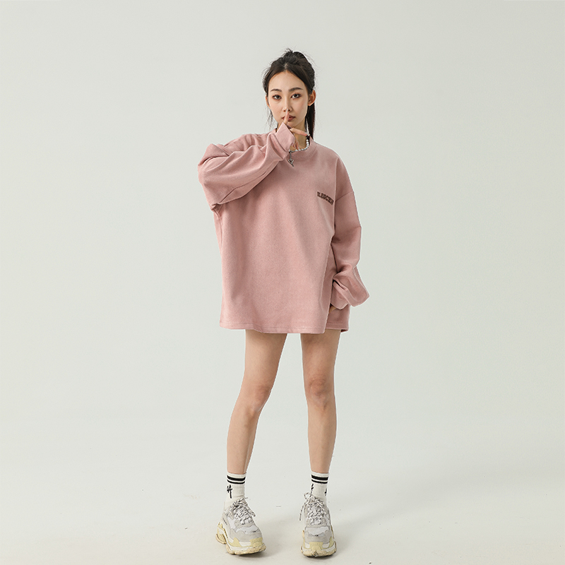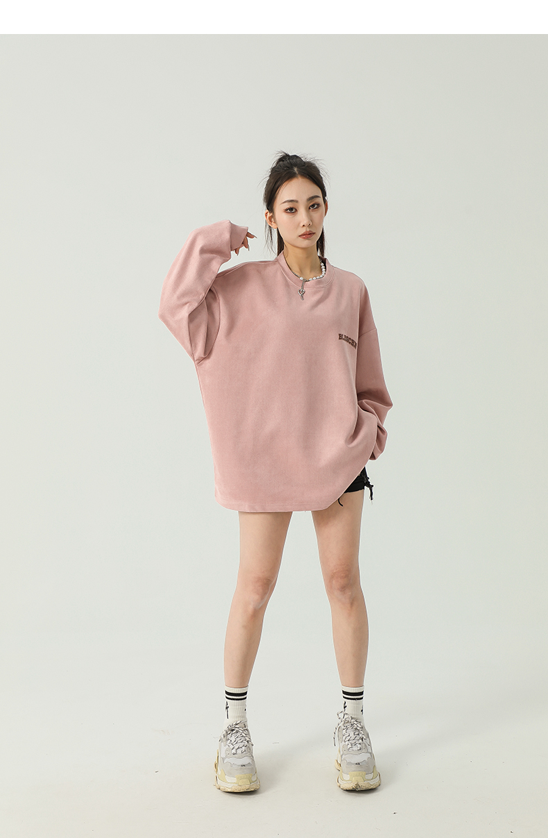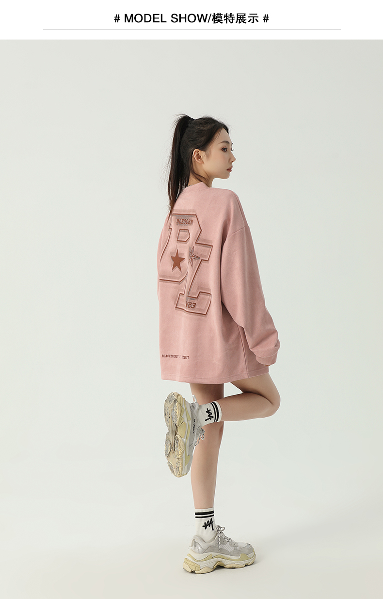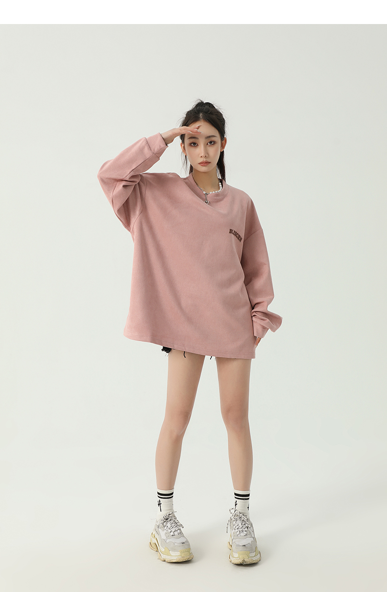美式圓領厚棉T女2023新款春秋款ins潮牌oversize寬鬆麂皮絨上衣bf