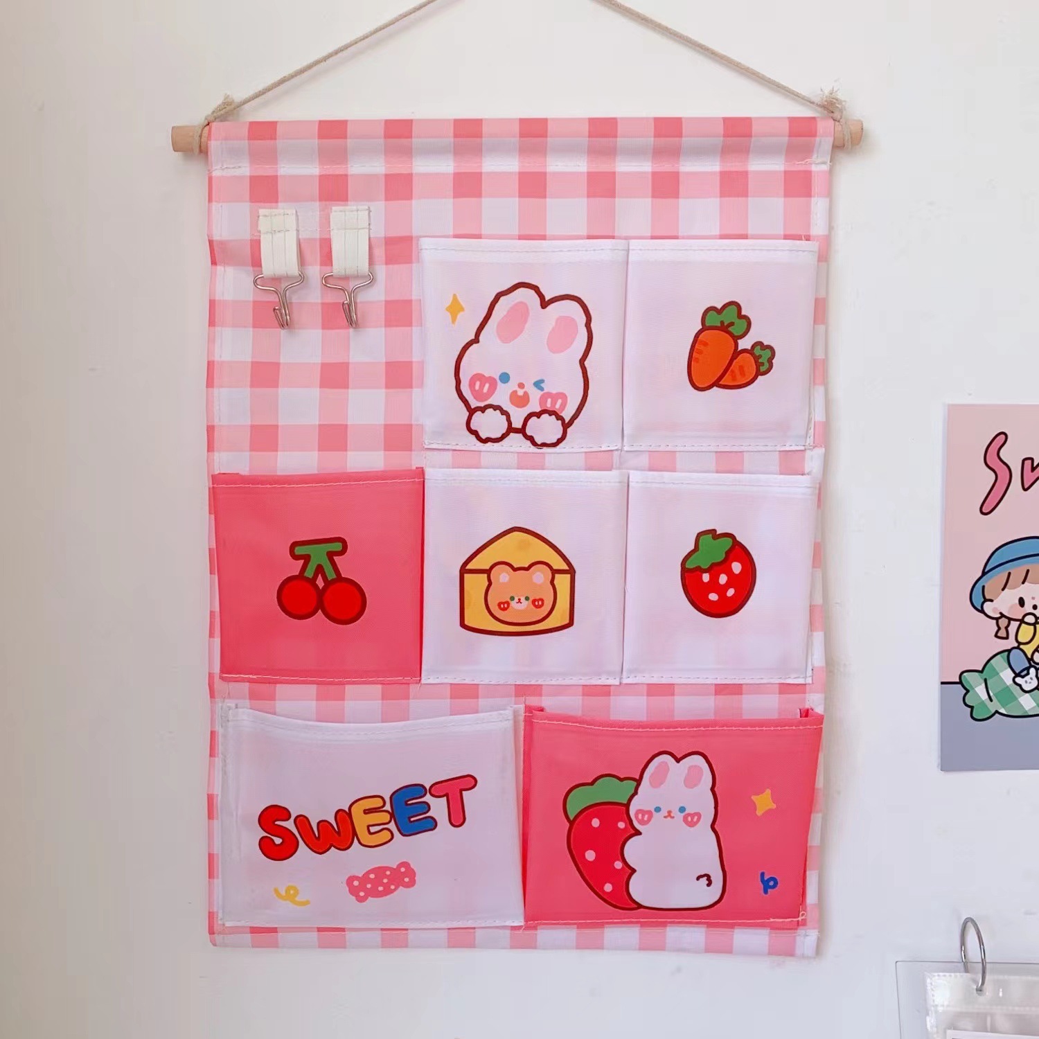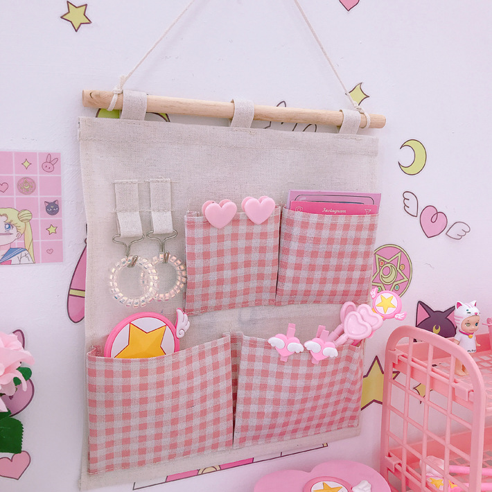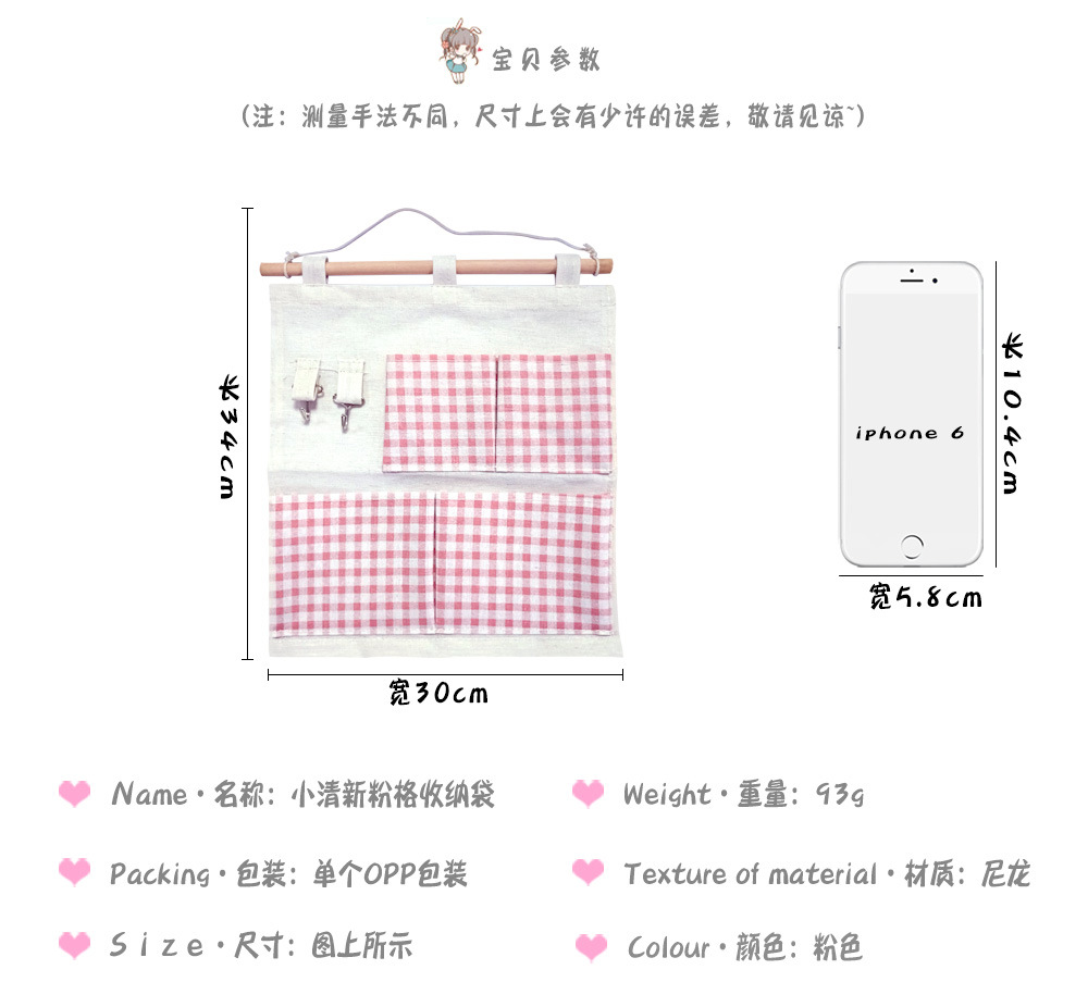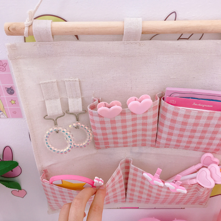 ins风创意粉格墙面多功能杂物收纳袋 挂袋学生宿舍粉色整理储物袋
