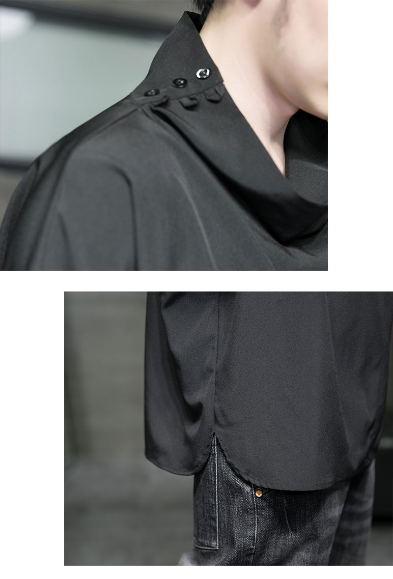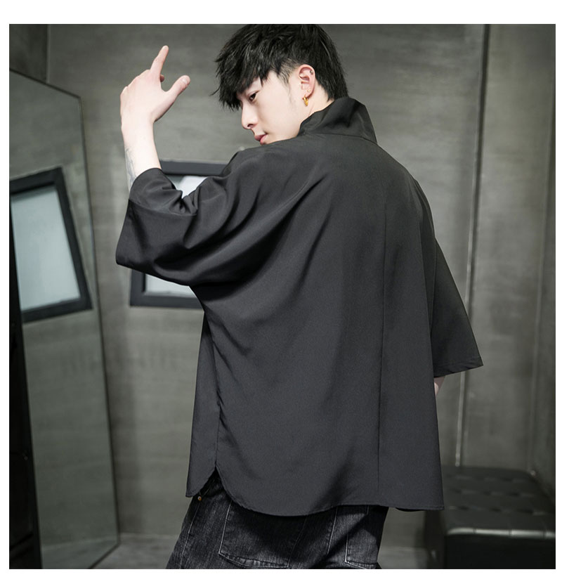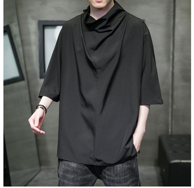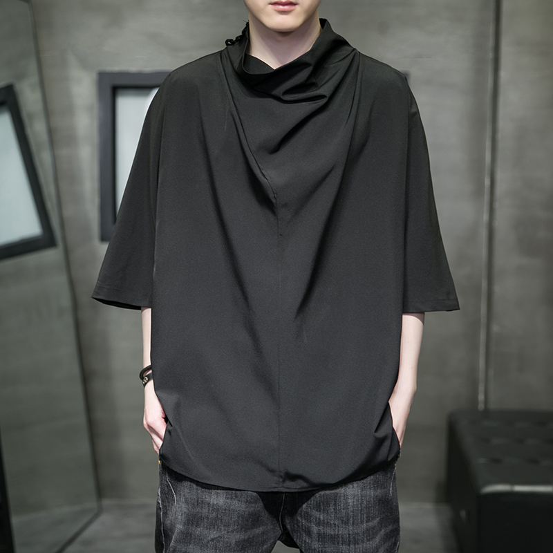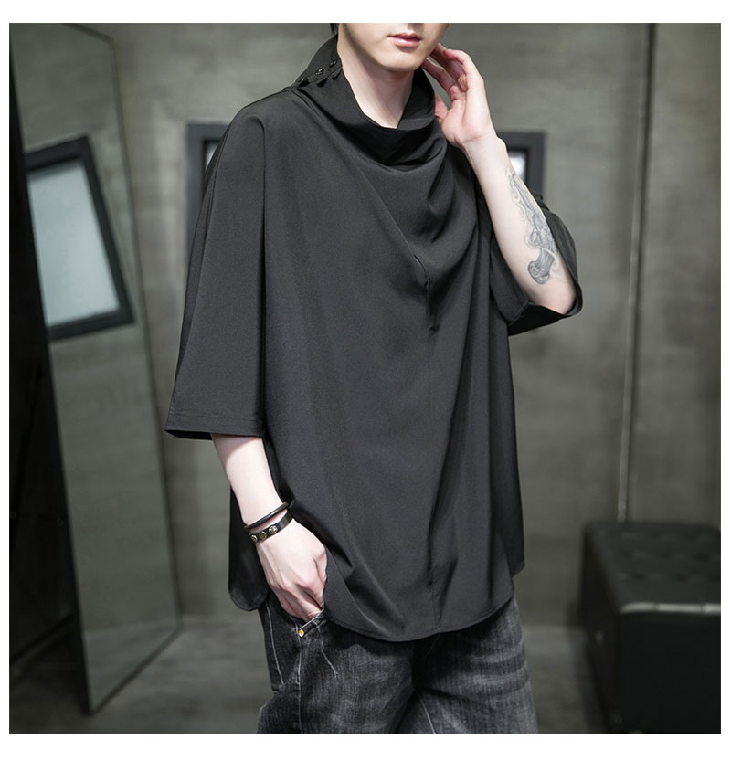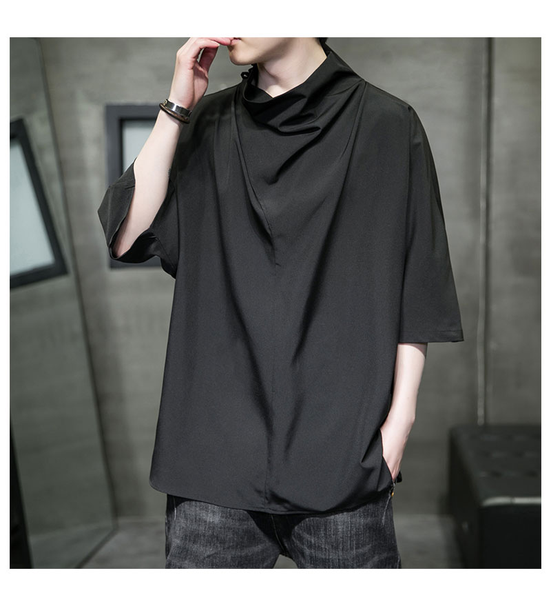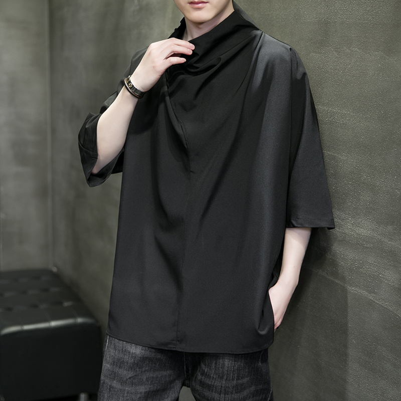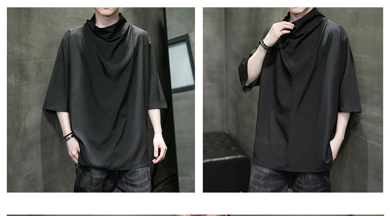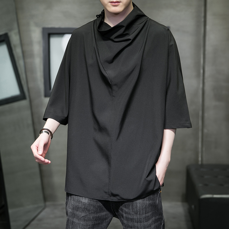 夏季高高領冰絲短袖男中國風設計感半袖T恤高級垂感重磅寬鬆衣服