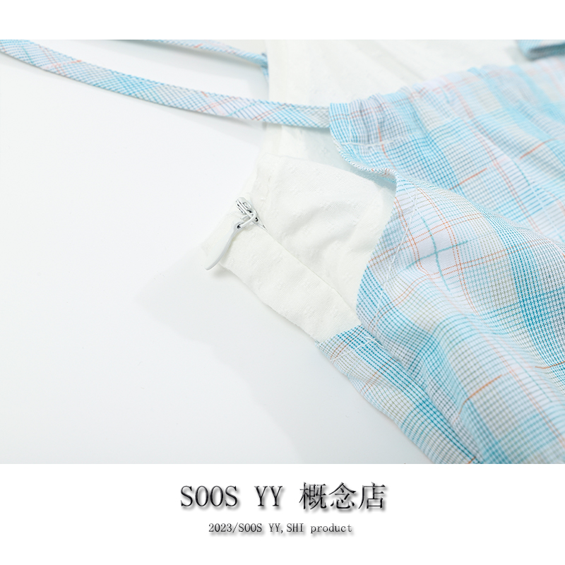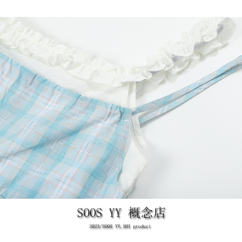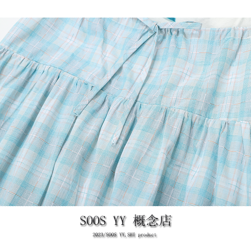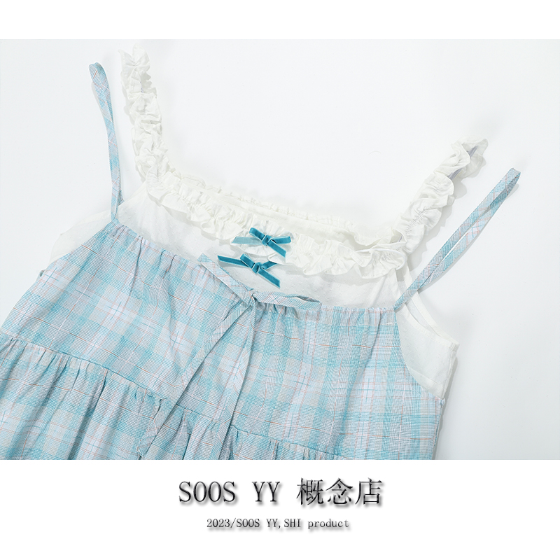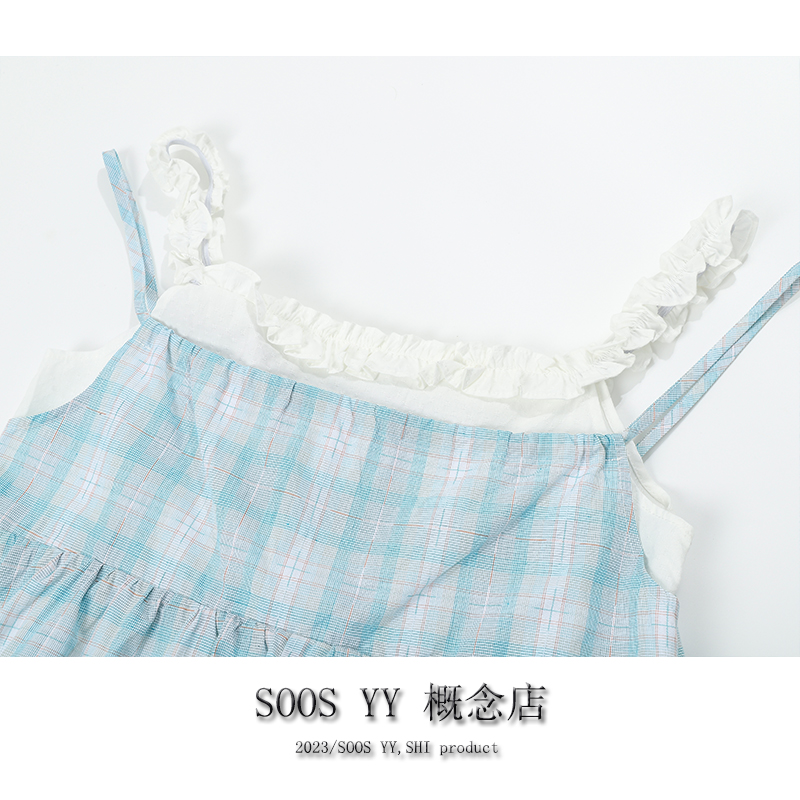SOOS YY 鹽島少女海邊洋裝假兩件2023夏季新款格紋小個子吊帶裙