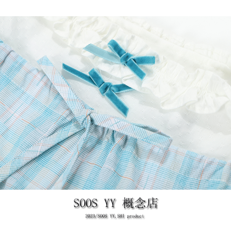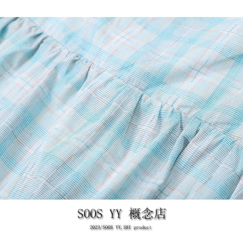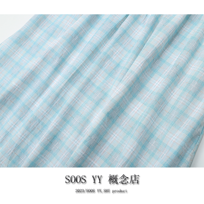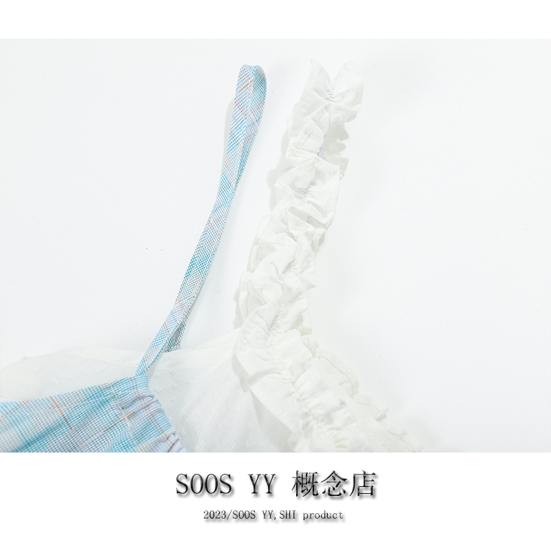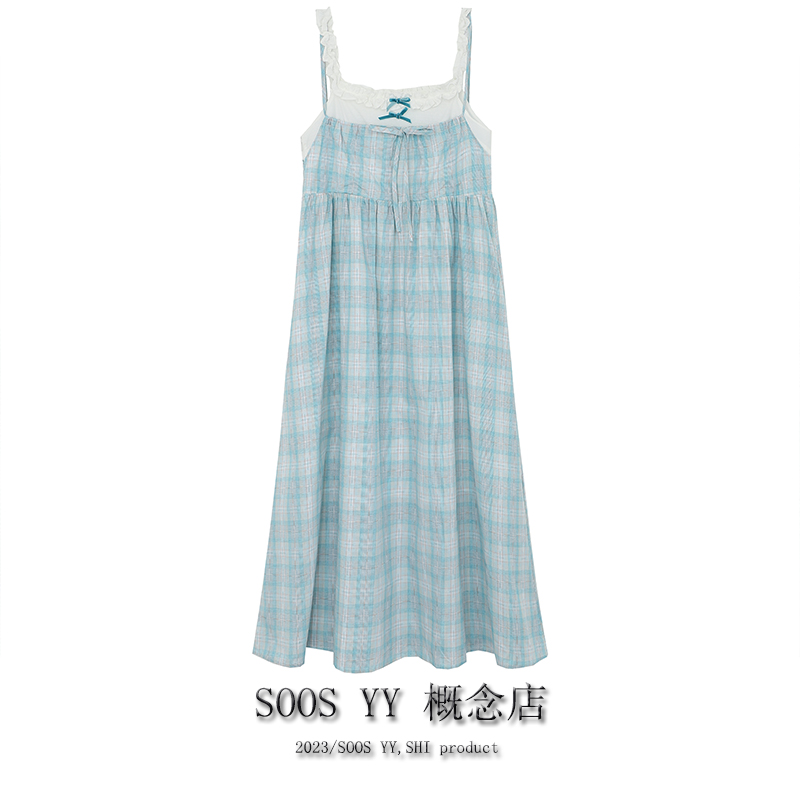 SOOS YY 鹽島少女海邊洋裝假兩件2023夏季新款格紋小個子吊帶裙