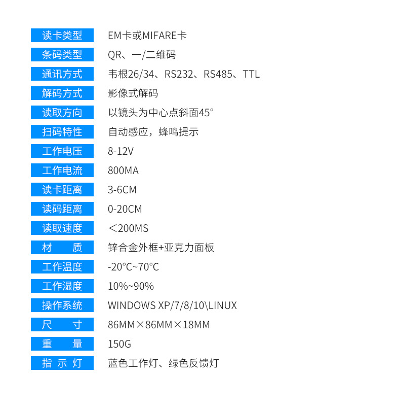 规格 ID+二维码(韦根/232/485),IC+二维码(韦根/232/485),ID+二维码(韦根/TTL),IC+二维码(韦根/TTL)