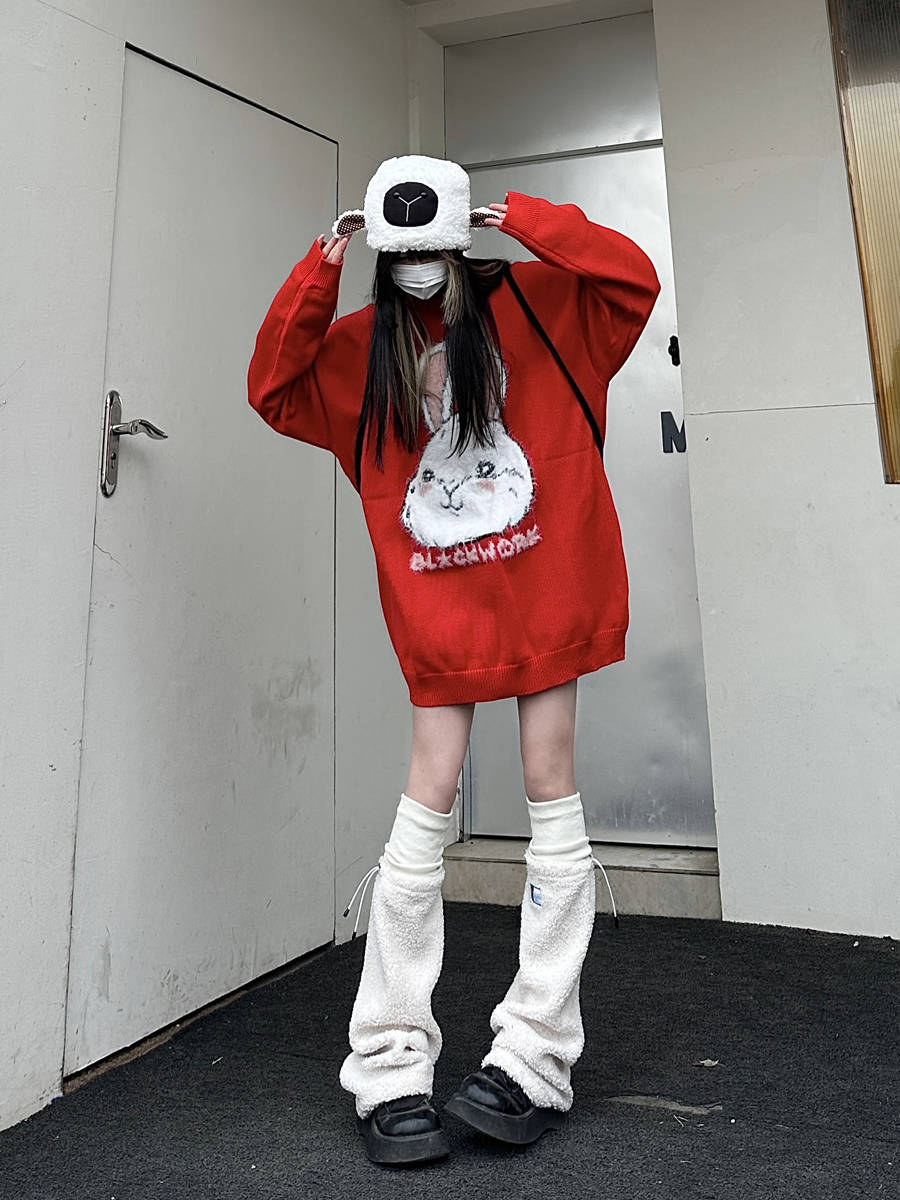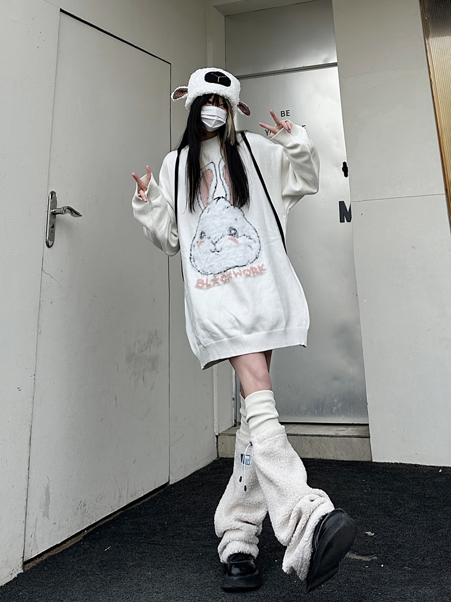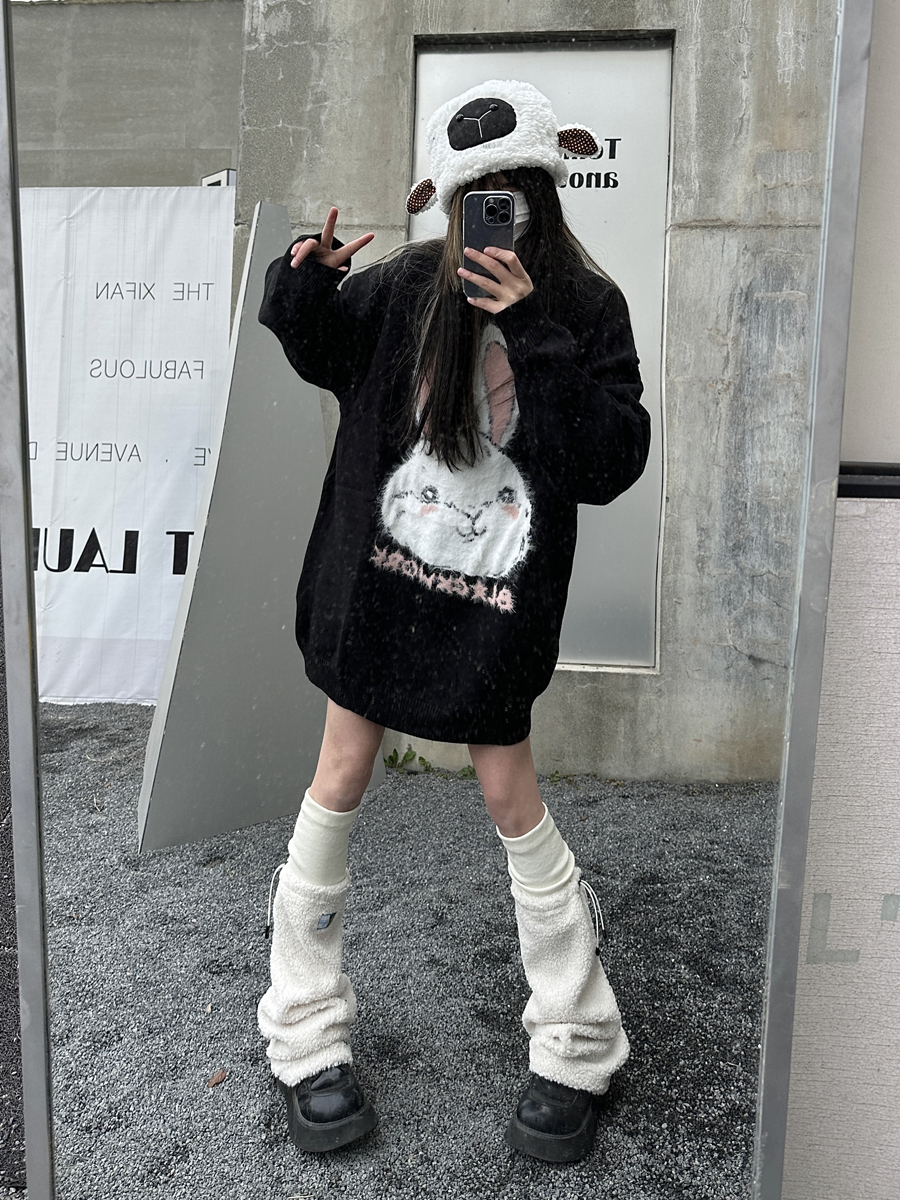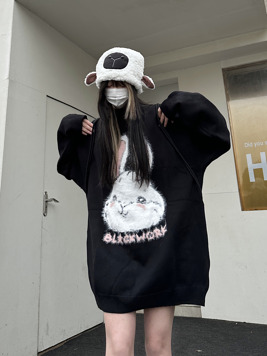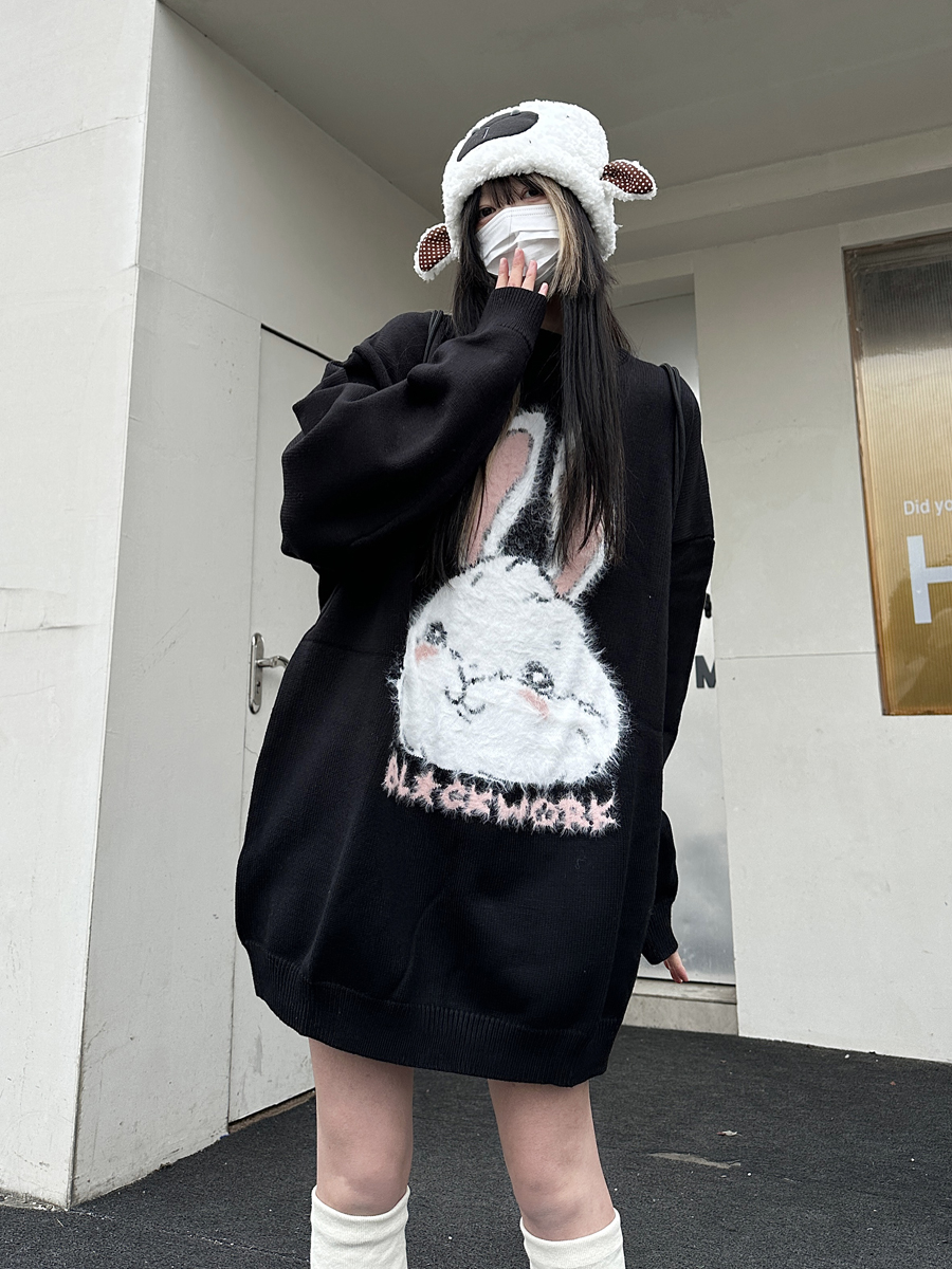 咖哩人原創新款毛絨兔子字母寬鬆圓領毛衣冬季百搭加厚長袖上衣